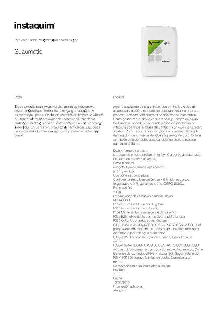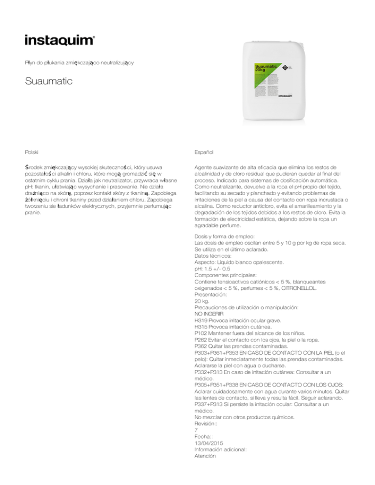 Płyndopłukaniazmiękczająconeutralizujący Suaumatic Polski Español Środekzmiękczającywysokiejskutecznoś ci,któryusuwa pozostałoś cialkalinichloru,któremogągromadzićsięw ostatnimcykluprania.Działajakneutralizator,przywracawłasne pH:tkanin,ułatwiającwysychanieiprasowanie.Niedziała drażniąconaskórę,poprzezkontaktskóryztkaniną.Zapobiega żółknięciuichronitkaninyprzeddziałaniemchloru.Zapobiega tworzeniusieładunkówelektrycznych,przyjemnieperfumując pranie. Agentesuavizantedealtaeficaciaqueeliminalosrestosde alcalinidadydeclororesidualquepudieranquedaralfinaldel proceso.Indicadoparasistemasdedosificaciónautomática. Comoneutralizante,devuelvealaropaelpHpropiodeltejido, facilitandosusecadoyplanchadoyevitandoproblemasde irritacionesdelapielacausadelcontactoconropaincrustadao alcalina.Comoreductoranticloro,evitaelamarilleamientoyla degradacióndelostejidosdebidosalosrestosdecloro.Evitala formacióndeelectricidadestática,dejandosobrelaropaun agradableperfume. Dosisyformadeempleo: Lasdosisdeempleooscilanentre5y10gporkgderopaseca. Seutilizaenelúltimoaclarado. Datostécnicos: Aspecto:Líquidoblancoopalescente. pH:1.5+/-0.5 Componentesprincipales: Contienetensioactivoscatiónicos<5%,blanqueantes oxigenados<5%,perfumes<5%,CITRONELLOL. Presentación: 20kg. Precaucionesdeutilizaciónomanipulación: NOINGERIR H319Provocairritaciónoculargrave. H315Provocairritacióncutánea. P102Mantenerfueradelalcancedelosniños. P262Evitarelcontactoconlosojos,lapielolaropa. P362Quitarlasprendascontaminadas. P303+P361+P353ENCASODECONTACTOCONLAPIEL(oel pelo):Quitarinmediatamentetodaslasprendascontaminadas. Aclararselapielconaguaoducharse. P332+P313Encasodeirritacióncutánea:Consultaraun médico. P305+P351+P338ENCASODECONTACTOCONLOSOJOS: Aclararcuidadosamenteconaguadurantevariosminutos.Quitar laslentesdecontacto,sillevayresultafácil.Seguiraclarando. P337+P313Sipersistelairritaciónocular:Consultaraun médico. Nomezclarconotrosproductosquímicos. Revisión:: 7 Fecha:: 13/04/2015 Informaciónadicional: Atención Atención!/Warning! DetervicS.A. PolígonIndustrialCan Malloles SantLlorençDesmunts,32 08500Vic Barcelona T938891344 F938891640 [email protected] instaquim.com