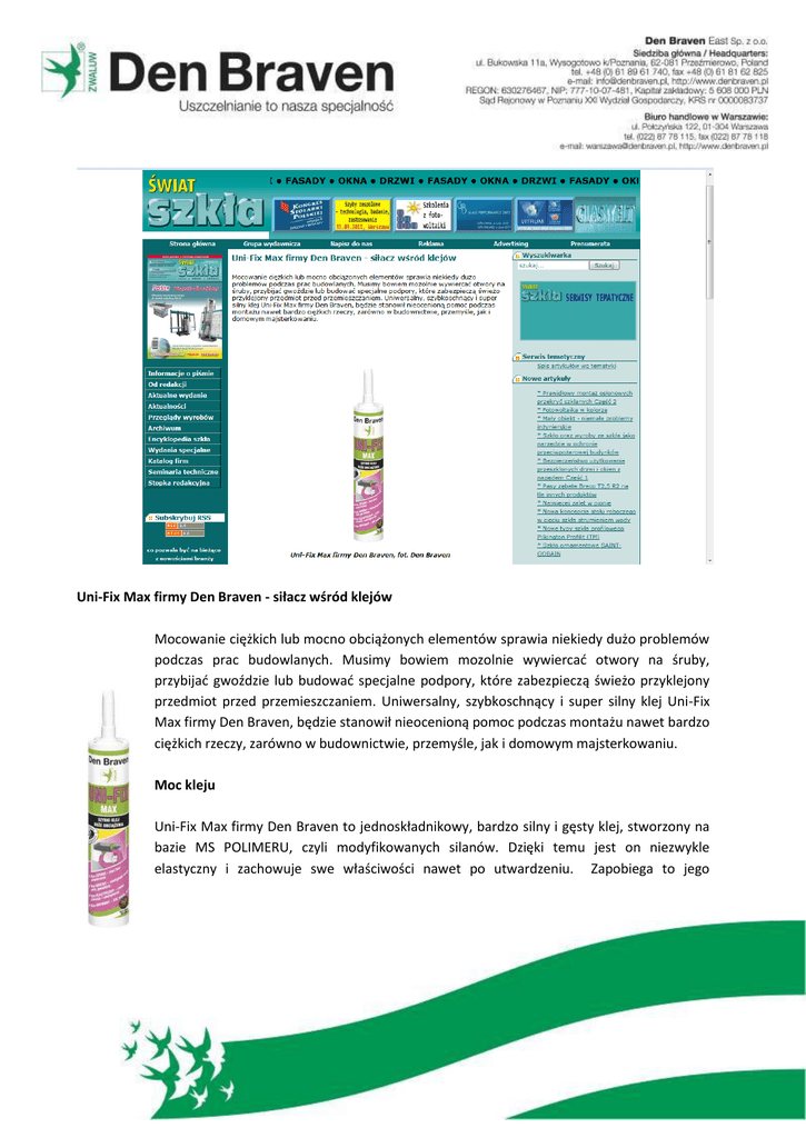 Uni-Fix Max firmy Den Braven - siłacz wśród klejów Mocowanie ciężkich lub mocno obciążonych elementów sprawia niekiedy dużo problemów podczas prac budowlanych. Musimy bowiem mozolnie wywiercad otwory na śruby, przybijad gwoździe lub budowad specjalne podpory, które zabezpieczą świeżo przyklejony przedmiot przed przemieszczaniem. Uniwersalny, szybkoschnący i super silny klej Uni-Fix Max firmy Den Braven, będzie stanowił nieocenioną pomoc podczas montażu nawet bardzo ciężkich rzeczy, zarówno w budownictwie, przemyśle, jak i domowym majsterkowaniu. Moc kleju Uni-Fix Max firmy Den Braven to jednoskładnikowy, bardzo silny i gęsty klej, stworzony na bazie MS POLIMERU, czyli modyfikowanych silanów. Dzięki temu jest on niezwykle elastyczny i zachowuje swe właściwości nawet po utwardzeniu. Zapobiega to jego późniejszemu pękaniu oraz powstawaniu na powierzchni nieestetycznych pęcherzy i rys skurczowych. Cechuje się on również dużą odpornością na działanie wody oraz czynników atmosferycznych – tolerancja temperatur wynosi bowiem od -40°C do +90°C. Klej Uni-Fix Max doskonale nadaje się więc do profesjonalnego stosowania, zarówno w przemyśle, jak i w budownictwie, pozwalając na sprawne i trwałe przyklejenie nawet ciężkich i mocno obciążonych elementów, narażonych na trudne warunki eksploatacji, w tym także drgania i wibracje. Uni-Fix Max ma neutralny, biały kolor, a po utwardzeniu możemy go malowad, dlatego też jest bardzo uniwersalny i pasuje niezależnie od kolorystyki klejonych przedmiotów. Jest to doskonały produkt nie tylko pod względem wytrzymałości, ale również bezpiecznego użytkowania. Uni-Fix Max jest bowiem całkowicie bezwonny i pozbawiony izocyjanianów, silikonu, rozpuszczalników, polichlorku winylu oraz plastyfikatorów – składników szkodliwych dla zdrowia. Maksimum klejenia Trwale elastyczny klej Uni-Fix Max firmy Den Braven stworzony został z myślą o mocowaniu mocno obciążonych elementów i ułatwieniu związanych z tym prac budowlano-remontowych. Bardzo krótki czas schnięcia oraz odpowiednia konsystencja kleju, która zabezpiecza go przed spływaniem, pozwalając na prosty montaż nawet ciężkich rzeczy, zarówno na powierzchniach poziomych, jak i pionowych, bez konieczności ich późniejszego podpierania. Uni- Fix Max z powodzeniem więc może zastąpid śruby, kołki i gwoździe. Jego znakomita przyczepnośd do większości podłoży budowlanych, zarówno gładkich, jak i porowatych, sprawia, że możemy nim sklejad niemal wszystko, począwszy m.in. od dekoracji, poprzez półki, blaty, parapety, gzymsy, progi, panele, materiały izolacyjne, koocząc na blachach, dachówkach, czy ceramice. Dodatkowo, neutralny chemicznie skład, umożliwia bezpieczne mocowanie luster i naturalnego kamienia. Nie uszkodzi bowiem warstwy srebrzankowej lustra i nie odbarwi marmuru, piaskowca, czy granitu. Klej Uni-Fix Max jest bardzo gęsty, dlatego też do jego aplikacji potrzebujemy specjalnego pistoletu do kartuszy. Klej Uni-Fix Max firmy Den Braven to moc siłacza zamknięta w małym opakowaniu. Trwała elastycznośd, szybki czas schnięcia oraz niezwykła wytrzymałośd, sprawiają, że z powodzeniem sprawdza się on zarówno w drobnych, przydomowych pracach remontowo-wykooczeniowych, jak również w profesjonalnym przemyśle. Klej-uszczelniacz Uni-Fix Original firmy Den Braven, kolor: biały, kartusz 200 ml, cena hurtowa netto – 21,99 pln więcej informacji: www.denbraven.pl