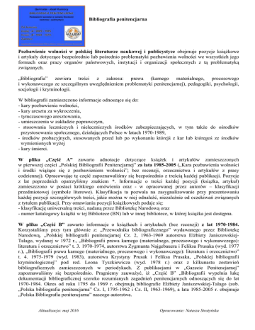 Bibliografia penitencjarna Pozbawienie wolności w polskiej literaturze naukowej i publicystyce obejmuje pozycje książkowe i artykuły dotyczące bezpośrednio lub pośrednio problematyki pozbawienia wolności we wszystkich jego formach oraz pracy organów państwowych, instytucji i organizacji społecznych z tą problematyką związanych. „Bibliografia” zawiera treści z zakresu: prawa (karnego materialnego, procesowego i wykonawczego ze szczególnym uwzględnieniem problematyki penitencjarnej), pedagogiki, psychologii, socjologii i kryminologii. W bibliografii zamieszczono informacje odnoszące się do: - kary pozbawienia wolności, - kary aresztu za wykroczenia, - tymczasowego aresztowania, - umieszczenia w zakładzie poprawczym, - stosowania leczniczych i nieleczniczych środków zabezpieczających, w tym także do ośrodków przystosowania społecznego, działających Polsce w latach 1970-1989, - środków probacyjnych, stosowanych przed lub po wykonaniu którejś z kar lub któregoś ze środków wymienionych wyżej - kary śmierci. W pliku „Część A” zawarto adnotacje dotyczące książek i artykułów zamieszczonych w pierwszej części „Polskiej Bibliografii Penitencjarnej” za lata 1985-2005 („Kara pozbawienia wolności i środki wiążące się z pozbawieniem wolności”; bez recenzji, orzecznictwa i artykułów z prasy codziennej). Opracowując tę część zapoznawaliśmy się bezpośrednio z treścią każdej publikacji. Pozycje z lat poprzednich opatrzyliśmy znakiem *. Informacje o treści każdej pozycji (książka, artykuł) zamieszczono w postaci krótkiego omówienia oraz - w opracowanej przez autorów – klasyfikacji przedmiotowej (symbole literowe). Klasyfikacja ta pozwala na zasygnalizowanie przy prezentowaniu każdej pozycji szczegółowych treści, jakie można w niej odnaleźć, niezależnie od oczekiwań związanych z tytułem publikacji. Przy omawianiu pozycji książkowych podaje się: - klasyfikację uniwersalną treści, nadaną przez Bibliotekę Narodową oraz - numer katalogowy książki w tej Bibliotece (BN) lub w innej bibliotece, w której książka jest dostępna. W pliku „Część B” zawarto informacje o książkach i artykułach (bez recenzji) z lat 1970-1984. Korzystaliśmy przy tym głównie z: „Przewodnika bibliograficznego” wydawanego przez Bibliotekę Narodową, „Polskiej bibliografii penitencjarnej Cz. 2, 1963-1969 autorstwa Elżbiety JaniszewskiejTalago, wydanej w 1972 r., „Bibliografii prawa karnego (materialnego, procesowego i wykonawczego): literatura i orzecznictwo” t. 3. 1970-1974, autorstwa Zygmunta Najgebauera i Feliksa Prusaka (wyd. 1977 r.), „Bibliografii prawa karnego (materialnego, procesowego i wykonawczego): literatura i orzecznictwo” t. 4. 1975-1979 (wyd. 1983), autorstwa Krystyny Prusak i Feliksa Prusaka, „Polskiej bibliografii kryminologicznej” pod red. Leona Tyszkiewicza (wyd. 1978 r.) oraz z kilkunastu zestawień bibliograficznych zamieszczonych w periodykach. Z publikacjami w „Gazecie Penitencjarnej” zapoznawaliśmy się bezpośrednio. Pragniemy zauważyć, iż „Część B” „Bibliografii wypełnia lukę dokumentacji bibliograficznej szeroko rozumianych zagadnień penitencjarnych odnoszących się do lat 1970-1984. Okres od roku 1795 do 1969 r. obejmują bibliografie Elżbiety Janiszewskiej-Talago (zob. „Polska bibliografia penitencjarna” Cz. I, 1795-1962 i Cz. II, 1963-1969), a lata 1985-2005 r. obejmuje „Polska Bibliografia penitencjarna” naszego autorstwa. Aktualizacja: maj 2016 Opracowanie: Natasza Stratyńska