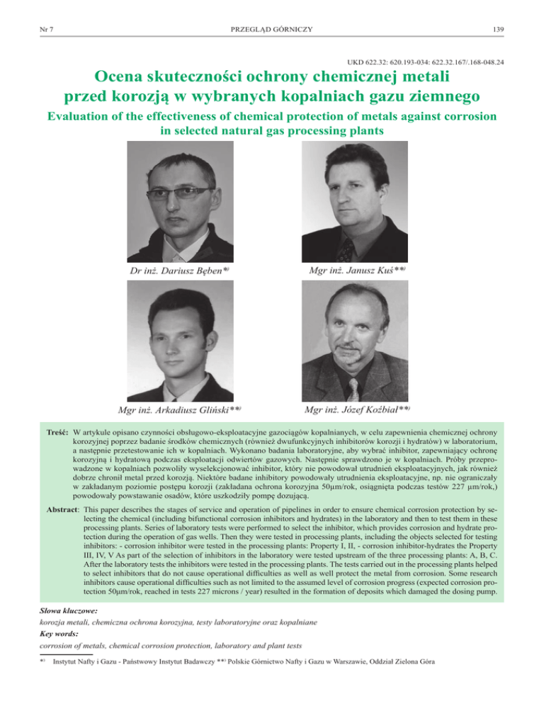 Nr 7 PRZEGLĄD GÓRNICZY 139 UKD 622.32: 620.193-034: 622.32.167/.168-048.24 Ocena skuteczności ochrony chemicznej metali przed korozją w wybranych kopalniach gazu ziemnego Evaluation of the effectiveness of chemical protection of metals against corrosion in selected natural gas processing plants Dr inż. Dariusz Bęben*) mgr inż. Janusz Kuś**) mgr inż. Arkadiusz Gliński**) mgr inż. Józef Koźbiał**) Treść: W artykule opisano czynności obsługowo-eksploatacyjne gazociągów kopalnianych, w celu zapewnienia chemicznej ochrony korozyjnej poprzez badanie środków chemicznych (również dwufunkcyjnych inhibitorów korozji i hydratów) w laboratorium, a następnie przetestowanie ich w kopalniach. Wykonano badania laboratoryjne, aby wybrać inhibitor, zapewniający ochronę korozyjną i hydratową podczas eksploatacji odwiertów gazowych. Następnie sprawdzono je w kopalniach. Próby przeprowadzone w kopalniach pozwoliły wyselekcjonować inhibitor, który nie powodował utrudnień eksploatacyjnych, jak również dobrze chronił metal przed korozją. Niektóre badane inhibitory powodowały utrudnienia eksploatacyjne, np. nie ograniczały w zakładanym poziomie postępu korozji (zakładana ochrona korozyjna 50µm/rok, osiągnięta podczas testów 227 µm/rok,) powodowały powstawanie osadów, które uszkodziły pompę dozującą. Abstract: This paper describes the stages of service and operation of pipelines in order to ensure chemical corrosion protection by selecting the chemical (including bifunctional corrosion inhibitors and hydrates) in the laboratory and then to test them in these processing plants. Series of laboratory tests were performed to select the inhibitor, which provides corrosion and hydrate protection during the operation of gas wells. Then they were tested in processing plants, including the objects selected for testing inhibitors: - corrosion inhibitor were tested in the processing plants: Property I, II, - corrosion inhibitor-hydrates the Property III, IV, V As part of the selection of inhibitors in the laboratory were tested upstream of the three processing plants: A, B, C. After the laboratory tests the inhibitors were tested in the processing plants. The tests carried out in the processing plants helped to select inhibitors that do not cause operational difficulties as well as well protect the metal from corrosion. Some research inhibitors cause operational difficulties such as not limited to the assumed level of corrosion progress (expected corrosion protection 50μm/rok, reached in tests 227 microns / year) resulted in the formation of deposits which damaged the dosing pump. Słowa kluczowe: korozja metali, chemiczna ochrona korozyjna, testy laboratoryjne oraz kopalniane Key words: corrosion of metals, chemical corrosion protection, laboratory and plant tests *) Instytut Nafty i Gazu - Państwowy Instytut Badawczy **) Polskie Górnictwo Nafty i Gazu w Warszawie, Oddział Zielona Góra 140 PRZEGLĄD GÓRNICZY 1. Wprowadzenie Korozji metali nie można całkowicie wyeliminować, ale można znacznie ograniczyć. Prawidłowe uwzględnienie zagrożeń korozyjnych i metod ochrony przed korozją, w znaczny sposób obniża koszty eksploatacji. Proces niszczenia metali zachodzi według mechanizmu chemicznego. Wywołują go substancje znajdujące się w wydobywanym gazie, takie jak: ditlenek węgla, woda, rtęć, wodór, siarkowodór, solanka [4,5]. Niszczenie materiałów na skutek korozji może być skutecznie obniżone przez umiejętne zapobieganie, głównie poprzez stosowanie metod ochrony przeciwkorozyjnej oraz właściwy dobór materiałów. Na rys. 1 przedstawiono skorodowane elementy instalacji eksploatacyjnej jednej z kopalń. Już na etapie budowy rurociągu należy zwracać szczególną uwagę na techniki ochrony przeciwkorozyjnej, począwszy od doboru stali, obróbki chemicznej użytej stali, powłoki chroniącej rurę, czy stosowanie ochrony przeciwkorozyjnej. Korzyści ekonomiczne wynikające z wprowadzenia kompleksowej strategii zapobiegania korozji od dawna były stwierdzone przez właścicieli obiektów (kopalń). Koszty zapobiegania korozji zostały przyjęte w tych branżach w przekonaniu, że stanowią one zazwyczaj jedną dziesiątą lub mniej kosztu wymiany rurociągów i urządzeń eksploatacyjnych [1]. Zwrot nakładów w stosunku 10:1 z inwestycji jest rzadko spotykany w działalności gospodarczej – odzwierciedla jednak niewątpliwe korzyści ekonomiczne wynikające z zastosowania nowoczesnych technologii przeciwkorozyjnych, takich jak stosowanie środków chemicznych (inhibitorów) czy katodowa ochrona rurociągów i instalacji eksploatacyjnej. Również ważnym zagadnieniem poruszanym podczas oceny korozji jest określenie jakości wykonania spawów łączeń rurociągu, które ma duże znaczenie, ponieważ tam najczęściej dochodzi do awarii. Znane są metody kontroli spawów łączeń rur, jednak obecnie nikt z wykonawców i nadzorujących wykonanie rurociągów nie zwraca uwagi na wygrzewanie spawów [3]. Ma to znaczenie w późniejszej eksploatacji rurociągu, zmniejszając jego awaryjność. Poza tym duże znaczenie ma izolacja miejsc łączeń rur. Niejednokrotnie obserwowana jest korozja zewnętrzna źle oczyszczonych i zaizolowanych spawów. 2. Ochrona metali przed korozją W zależności od rodzaju korozji i charakteru chemicznego czynników korozyjnych, istnieje wiele sposobów zapobiegania lub zmniejszania skutków korozji. 2014 Podstawowym sposobem ochrony przed korozją chemiczną jest dobór odpowiedniego materiału do warunków środowiska agresywnego. Działania korodujące niektórych składników można skutecznie ograniczyć przez zastosowanie inhibitorów (opóźniaczy) korozji. Z definicji inhibitor korozji jest to środek chemiczny, który po zastosowaniu w małych ilościach skutecznie ograniczy korozję. Inhibitory tworzą zwykle na powierzchni metalu warstwę ochronną, hamując szybkość korozji. Przed zastoso