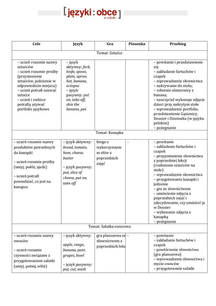 Cele Język Gra Piosenka Przebieg Temat: Sztućce – uczeń rozumie nazwy sztućców – uczeń rozumie prośby (przyniesienie sztućców, położenie w odpowiednim miejscu) – uczeń potrafi nazwać sztućce – uczeń i rodzice potrafią używać portfolio językowe – język aktywny: fork, knife, spoon, plate, apron, hat, banana, octopus – język pasywny: put on, take off, skin the banana, put – powitanie i przedstawienie się – zakładanie fartuchów i czapek – wprowadzenie słownictwa – nakrywanie do stołu; – robienie ośmiornicy z banana; – nauczyciel wykonuje zdjęcie dzieci przy nakrytym stole – wprowadzenie portfolio, przedstawienie Gąsienicy, Dossier i Dziennika (w języku polskim) – pożegnanie Temat: Kanapka – uczeń rozumie nazwy produktów potrzebnych do kanapki – uczeń rozumie prośby (umyj, połóż, zjedz) – uczeń potrafi powiedzieć, co jest na kanapce – język aktywny: bread, tomato, ham, cheese, butter – język pasywny: put, slice of cheese, put on, take off bingo z wykorzystanie m słów z poprzednich zajęć - – powitanie – zakładanie fartuchów i czapek – przypomnienie słownictwa z poprzedniej lekcji (rozłożenie sztućców na stole) – wprowadzenie słownictwa – przygotowanie kanapki i jedzenie – gra ze słownictwem – omówienie zdjęcia z poprzednich zajęć i zdecydowanie, czy umieścić je w Dossier – wykonanie zdjęcia z kanapką – pożegnanie Temat: Sałatka owocowa – uczeń rozumie nazwy owoców – uczeń rozumie czynności związane z przygotowaniem sałatki (umyj, potnij, włóż) – język aktywny: apple, range, banana, pear, grapes, bowl – język pasywny: put, cut, wash gra planszowa ze słownictwem z poprzednich lekcji – powitanie – zakładanie fartuchów i czapek – powtórzenie słownictwa (gra planszowa) – wprowadzenie słownictwa i mycie owoców – przygotowanie sałatki – uczeń potrafi powiedzieć, co jest w sałatce – mycie sztućców (powtórka słownictwa z poprzednich zajęć) – mówienie tego, co jest w sałatce i jedzenie – omówienie zdjęcia z poprzednich zajęć i zdecydowanie, czy umieścić je w Dossier – wykonanie zdjęcia z bieżących zajęć – zakończenie Temat: Zajęcia teatralne – uczeń rozumie sens historyjki – uczeń rozumie słownictwo – uczeń potrafi powtórzyć swoją rolę – uczeń rozumie nazwy warzyw – uczeń rozumie czynności związane z przygotowaniem sałatki (umyj, potnij, włóż) – uczeń potrafi powiedzieć, co jest w sałatce let’s eat, cakes, cookie, stomach, talk Hi, there Ricky Cookie land MM publ. Temat: Sałatka jarzynowa – język aktywny: Co to jest? – dzieci z potato, peas, zawiązanymi eggs, carrot, oczami dostają cucumber, mayo produkty i – język pasywny: mówią, co to jest. Reszta uczniów mówi: put, cut, wash, „Yes/No” breadboard – przedstawienie fabuły za pomocą obrazu – wprowadzenie słownictwa z pierwszej części – rozdanie ról – ćwiczenie ról – powitanie – zakładanie fartuchów i czapek – powtórzenie słownictwa (gra planszowa) – wprowadzenie słownictwa i mycie owoców – przygotowanie sałatki – mycie sztućców (powtórka słownictwa z poprzednich zajęć) – mówienie, co jest w sałatce i jedzenie – omówienie zdjęcia z poprzednich zajęć i zdecydowanie, czy umieścić je w Dossier – wykonanie zdjęcia z bieżących zajęć Temat: Zajęcia teatralne – uczeń potrafi wyrecytować swoją rolę Hi, there Ricky Cookie land – ćwiczenie ról z części pierwszej – rozdanie ról do części drugiej MM publ. Temat: Ziemniaczane pieczątki – uczeń rozumie i potrafi nazwać kolory – uczeń rozumie polecenia: umyj, potnij – język aktywny: potato, paintbrush, red, blue, yellow, Green Memory Game Lippy and Messy Part 1, episode 1 – język pasywny: cut , wash, stamp – powitanie – zakładanie fartuchów i czapek – powtórzenie słownictwa z poprzednich zajęć (gra) – rozdanie ziemniaków i pokrojenie ich na pół – wprowadzenie kolorów i robienie pieczątek – oglądanie bajki o kolorach (Lippy and Messy part 1) Temat: Zajęcia teatralne – uczeń potrafi wyrecytować swoją rolę Hi, there Ricky Cookie land – ćwiczenie ról (część pierwsza i druga) – rozdanie ról i ćwiczenie (część trzecia) MM Pub. – uczeń rozumie, jakie składniki trzeba dodać, aby zrobić masę solną – uczeń rozumie nazwy zabawek – uczeń potrafi zaśpiewać piosenkę – uczeń potrafi nazwać zabawki Temat: Figury z masy solnej – język aktywny: koło fortuny – My first każde dziecko salt, flour, water, English kręci kołem i drum, teddy bear, Adventure. wypowiada ball Pearson nazwę – język pasywny: przedmiotu, który widnieje na obrazku, na add, wash your którym hands zatrzyma się wskazówka – powitanie – zakładanie fartuchów i czapek – powtórzenie słownictwa z poprzednich zajęć (gra) – wprowadzenie nowego słownictwa – lepienie z masy solnej – śpiewanie piosenki – przedstawianie figurek z masy solnej – omówienie zdjęcia z poprzednich zajęć i zdecydowanie, czy umieścić je w Dossier – wykonanie zdjęcia z bieżących zajęć
