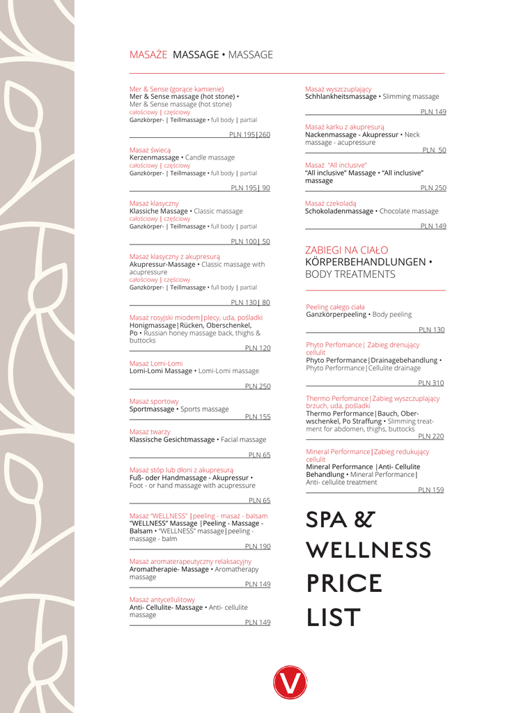 MASAŻE MASSAGE • MASSAGE Mer & Sense (gorące kamienie) Mer & Sense massage (hot stone) • Mer & Sense massage (hot stone) Masaż wyszczuplający Schhlankheitsmassage • Slimming massage całościowy | częściowy Ganzkörper- | Teillmassage • full body | partial PLN 195|260 Masaż świecą Kerzenmassage • Candle massage całościowy | częściowy Ganzkörper- | Teillmassage • full body | partial PLN 195| 90 Masaż klasyczny Klassiche Massage • Classic massage całościowy | częściowy Ganzkörper- | Teillmassage • full body | partial PLN 100| 50 Masaż klasyczny z akupresurą Akupressur-Massage • Classic massage with acupressure całościowy | częściowy Ganzkörper- | Teillmassage • full body | partial PLN 130| 80 Masaż rosyjski miodem|plecy, uda, pośladki Honigmassage|Rücken, Oberschenkel, Po • Russian honey massage back, thighs & buttocks PLN 120 PLN 149 Masaż karku z akupresurą Nackenmassage - Akupressur • Neck massage - acupressure PLN 50 Masaż “All inclusive” “All inclusive” Massage • “All inclusive” massage PLN 250 Masaż czekoladą Schokoladenmassage • Chocolate massage PLN 149 ZABIEGI NA CIAŁO KÖRPERBEHANDLUNGEN • BODY TREATMENTS Peeling całego ciała Ganzkörperpeeling • Body peeling PLN 130 Masaż Lomi-Lomi Lomi-Lomi Massage • Lomi-Lomi massage Phyto Perfomance| Zabieg drenujący cellulit Phyto Performance|Drainagebehandlung • Phyto Performance|Cellulite drainage PLN 250 PLN 155 Thermo Perfomance|Zabieg wyszczuplający brzuch, uda, pośladki Thermo Performance|Bauch, Oberwschenkel, Po Straffung • Slimming treatment for abdomen, thighs, buttocks PLN 220 Masaż sportowy Sportmassage • Sports massage Masaż twarzy Klassische Gesichtmassage • Facial massage PLN 65 Masaż stóp lub dłoni z akupresurą Fuß- oder Handmassage - Akupressur • Foot - or hand massage with acupressure PLN 65 Masaż “WELLNESS” |peeling - masaż - balsam "WELLNESS” Massage |Peeling - Massage Balsam • “WELLNESS” massage|peeling massage - balm PLN 190 Masaż aromaterapeutyczny relaksacyjny Aromatherapie- Massage • Aromatherapy massage PLN 149 Masaż antycellulitowy Anti- Cellulite- Massage • Anti- cellulite massage PLN 149 PLN 310 Mineral Performance|Zabieg redukujący cellulit Mineral Performance |Anti- Cellulite Behandlung • Mineral Performance| Anti- cellulite treatment PLN 159 SPA & WELLNESS PRICE LIST