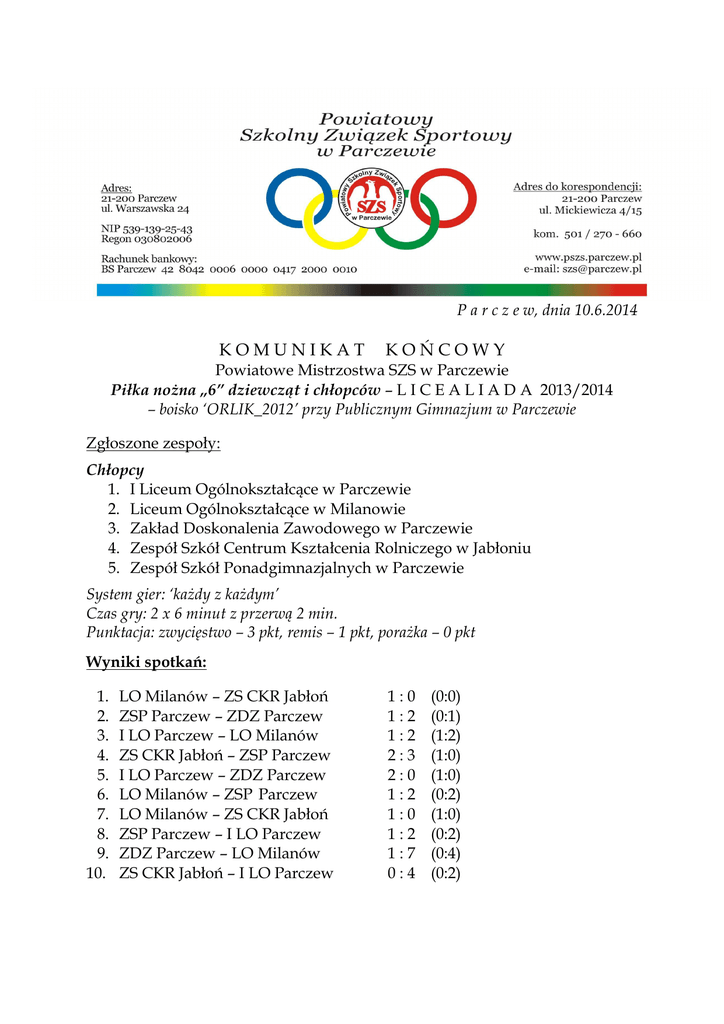 P a r c z e w, dnia 10.6.2014 KOMUNIKAT KOŃCOWY Powiatowe Mistrzostwa SZS w Parczewie Piłka noŜna „6” dziewcząt i chłopców – L I C E A L I A D A 2013/2014 – boisko ‘ORLIK_2012’ przy Publicznym Gimnazjum w Parczewie Zgłoszone zespoły: Chłopcy 1. I Liceum Ogólnokształcące w Parczewie 2. Liceum Ogólnokształcące w Milanowie 3. Zakład Doskonalenia Zawodowego w Parczewie 4. Zespół Szkół Centrum Kształcenia Rolniczego w Jabłoniu 5. Zespół Szkół Ponadgimnazjalnych w Parczewie System gier: ‘kaŜdy z kaŜdym’ Czas gry: 2 x 6 minut z przerwą 2 min. Punktacja: zwycięstwo – 3 pkt, remis – 1 pkt, poraŜka – 0 pkt Wyniki spotkań: 1. 2. 3. 4. 5. 6. 7. 8. 9. 10. LO Milanów – ZS CKR Jabłoń ZSP Parczew – ZDZ Parczew I LO Parczew – LO Milanów ZS CKR Jabłoń – ZSP Parczew I LO Parczew – ZDZ Parczew LO Milanów – ZSP Parczew LO Milanów – ZS CKR Jabłoń ZSP Parczew – I LO Parczew ZDZ Parczew – LO Milanów ZS CKR Jabłoń – I LO Parczew 1:0 1:2 1:2 2:3 2:0 1:2 1:0 1:2 1:7 0:4 (0:0) (0:1) (1:2) (1:0) (1:0) (0:2) (1:0) (0:2) (0:4) (0:2) 2 Tabela wyników: Chłopcy 1. 2. 3. 4. 5. LO Milanów I LO Parczew ZSP Parczew ZDZ Parczew ZS CKR Jabłoń Pkt Br 9 9 6 6 0 11 – 4 9–3 7–7 4 – 10 2–9 Końcowa klasyfikacja: 1 m – LO Milanów – 5 pkt – opiekun Oleszczuk Marek skład zespołu: Protaś Patryk, Maleszyk Mateusz, Czuryło Patryk, Szostak Daniel, Szymanek Konrad, Naumiuk Adam, Podgajny Mateusz, Ilczuk Adrian, Romaniuk Kamil, Trochunowicz Maciej. 2 m – I LO Parczew – 3 pkt – op. Dziuba Dariusz skład zespołu: Cieślak Wojciech, Kopeć Kacper, Jaszczuk Bartłomiej, Milaniuk Bartłomiej, Daciuk Szymon, Krzewski Michał, Trykacz Mateusz, Wiśniewski Dawid, Wójcik Patryk, Zacharczuk Łukasz, Szymański Wojciech. 3 m – ZSP Parczew – 2 pkt – op. Hulajko Andrzej skład zespołu: Puła Damian, Byk Kamil, Kuflowski Grzegorz, Dąbrowski Adrian, Saba Kacper, Szyszkowski Michał, Rudnik Adam, Jaszczuk Łukasz, Czekierda Mateusz, Komarek Adrian. 4 m – ZDZ Parczew – 1 pkt – op. Korniluk Daniel skład zespołu: Juchimiuk Adrian, Samczuk Tomasz, Kamiński Mateusz, Stawarski Kamil, śuk Wojciech, Bodziak Kamil, Flak Michał, Szymański Daniel, Mróz Krystian. 5 m – ZS CKR Jabłoń – 1 pkt – op. Waszczuk Jarosław skład zespołu: Semeniuk Łukasz, Kocko Eryk, Wołowik Gabriel, Lewicki Przemysław, Adrian Arkadiusz, Zarczuk Patryk, Adrian Jarosław, Zajączkowski Jakub. GRATULUJEMY N A J L E P S Z Y M !! 3 Dziewczęta 1. Zespół Szkół Ponadgimnazjalnych w Parczewie 2. Zespół Szkół Centrum Kształcenia Rolniczego w Jabłoniu 3. Liceum Ogólnokształcące w Milanowie System gier: ‘kaŜdy z kaŜdym’ Czas gry: 2 x 5 minut z przerwą 2 min. Punktacja: zwycięstwo – 3 pkt, remis – 1 pkt, poraŜka – 0 pkt Wyniki spotkań: 1. LO Milanów – ZSP Parczew 2. ZSP Parczew – ZS CKR Jabłoń 3. ZS CKR Jabłoń – LO Milanów 4 : 0 (2:0) 0 : 4 (0:3) 0 : 1 (0:0) Końcowa klasyfikacja: 1 m – LO Milanów – 5 pkt – opiekun Langa Sławomir skład zespołu: Szafran Katarzyna, Walenciuk Anna, Chilimoniuk Aneta, Kozak Manika, Adamowicz Martyna, Wiśniewska Milena, Dąbrowska Sandra, Gubańska Ewa. 2 m – ZS CKR Jabłoń – 3 pkt – op. Waszczuk Jarosław skład zespołu: Najdyhor Justyna, Rola Katarzyna, Wilczyńska Karolina, Mańka Renata, Chwalczuk Natalia, Chlebek Anna, Włosek Karolina, Soroka Justyna, Grzegorczyk Edyta. 3 m – ZSP Parczew – 2 pkt – op. Saczuk Monika skład zespołu: Baruch Anna, Romanowska Ewa, Gęborys Olga, Truduj Jzabela, Matejczuk Dominika, Kotlińska Paulina, Welik Iwona, Tomaszewska Ewa, Hoft Laura, Czarnacka śaneta, Protasiuk Monika, Kołodziejczyk Małgorzata. W Turnieju wzięło udział 80 uczniów i 7 nauczycieli. Powiatowy Szkolny Związek Sportowy w Parczewie nagrodził okolicznościowym pucharem najlepszy zespół (wśród dziewcząt i chłopców) Wszystkie druŜyny otrzymały pamiątkowe dyplomy. Powiatowy Szkolny Związek Sportowy w Parczewie dziękuje Panu Dyrektorowi PG w Parczewie – Witoldowi Jakubasowi za udostępnienie obiektu oraz nauczycielowi wychowania fizycznego Ryszardowi Matysiewiczowi za pomoc przy przeprowadzeniu Turnieju. oprac.