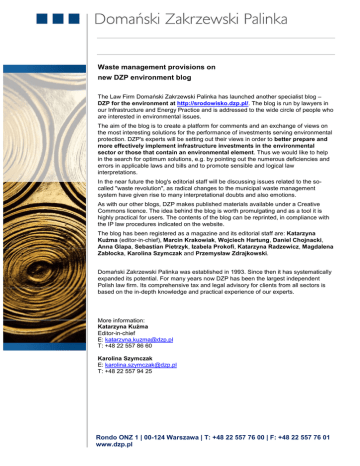 Waste management provisions on new DZP environment blog The Law Firm Domański Zakrzewski Palinka has launched another specialist blog – DZP for the environment at http://srodowisko.dzp.pl/. The blog is run by lawyers in our Infrastructure and Energy Practice and is addressed to the wide circle of people who are interested in environmental issues. The aim of the blog is to create a platform for comments and an exchange of views on the most interesting solutions for the performance of investments serving environmental protection. DZP's experts will be setting out their views in order to better prepare and more effectively implement infrastructure investments in the environmental sector or those that contain an environmental element. Thus we would like to help in the search for optimum solutions, e.g. by pointing out the numerous deficiencies and errors in applicable laws and bills and to promote sensible and logical law interpretations. In the near future the blog's editorial staff will be discussing issues related to the socalled "waste revolution", as radical changes to the municipal waste management system have given rise to many interpretational doubts and also emotions. As with our other blogs, DZP makes published materials available under a Creative Commons licence. The idea behind the blog is worth promulgating and as a tool it is highly practical for users. The contents of the blog can be reprinted, in compliance with the IP law procedures indicated on the website. The blog has been registered as a magazine and its editorial staff are: Katarzyna Kuźma (editor-in-chief), Marcin Krakowiak, Wojciech Hartung, Daniel Chojnacki, Anna Glapa, Sebastian Pietrzyk, Izabela Prokofi, Katarzyna Radzewicz, Magdalena Zabłocka, Karolina Szymczak and Przemysław Zdrajkowski. Domański Zakrzewski Palinka was established in 1993. Since then it has systematically expanded its potential. For many years now DZP has been the largest independent Polish law firm. Its comprehensive tax and legal advisory for clients from all sectors is based on the in-depth knowledge and practical experience of our experts. More information: Katarzyna Kuźma Editor-in-chief E: [email protected] T: +48 22 557 86 60 Karolina Szymczak E: [email protected] T: +48 22 557 94 25 Rondo ONZ 1 | 00-124 Warszawa | T: +48 22 557 76 00 | F: +48 22 557 76 01 www.dzp.pl
