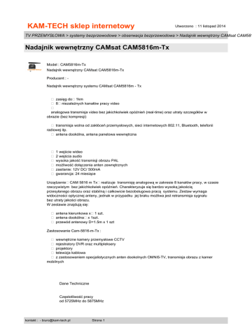 KAM-TECH sklep internetowy Utworzono : 11 listopad 2014 TV PRZEMYSŁOWA > systemy bezprzewodowe > obserwacja bezprzewodowa > Nadajnik wewnętrzny CAMsat CAM581 Nadajnik wewnętrzny CAMsat CAM5816m-Tx Model : CAM5816m-Tx Nadajnik wewnętrzny CAMsat CAM5816m-Tx Producent : Nadajnik wewnętrzny systemu CAMsat CAM5816m - Tx � zasięg do�1km � 8�niezależnych kanałów pracy video � analogowa transmisja video bez jakichkolwiek opóźnień (real-time) oraz utraty szczegółów w obrazie (bez kompresji) � transmisja wolna od zakłóceń przemysłowych, sieci internetowych 802.11, Bluetooth, telefonii radiowej itp. � antena dookólna, antena panelowa wewnętrzna � 1 wejście wideo � 2 wejścia audio � wysoka jakość transmisji obrazu PAL � możliwość dołączenia anten zewnętrznych � zasilanie: 12V DC/ 500mA � gwarancja: 24 miesiące Urządzenie�CAM 5816 m Tx�realizuje transmisję analogową w zakresie 8 kanałów pracy, w czasie rzeczywistym bez jakichkolwiek opóźnień. Charakteryzuje się bardzo wysoką jakością przesyłanego obrazu oraz stabilną i całkowicie bezobsługowa pracą systemu. Zestaw wymaga widoczności optycznej anteny, jednak w przypadku jej braku możliwa jest retransmisja sygnału bez utraty jakości obrazu. W zestawie znajdują się: � antena kierunkowa x�1 szt. � antena dookólna�x 1szt. � przewód antenowy D=1.5m x 1 szt Zastosowanie Cam-5816-m-Tx : � wewnętrzne kamery przemysłowe CCTV � rejestratory DVR oraz multipleksery � projektory � telewizja kablowa � z zastosowaniem specjalistycznych anten dookolnych OMNI5-TV, transmisja obrazu z kamer mobilnych Dane Techniczne Częstotliwość pracy od 5725MHz do 5875MHz kontakt : - [email protected] Strona 1 KAM-TECH sklep internetowy Utworzono : 11 listopad 2014 TV PRZEMYSŁOWA > systemy bezprzewodowe > obserwacja bezprzewodowa > Nadajnik wewnętrzny CAMsat CAM581 Nadajnik wewnętrzny CAMsat CAM5816m-Tx Moc <25mW; 13-16 dBm Czułość odbiornika - 85 dBM Impedancja 50 Ohm Modulacja FM Ilość kanałów 8 (wybierane na stałe) Format video PAL lub NTSC Złącza video BNC (75 Ohm ) Audio Stereo (600 Ohm , 1 Volt p-p) Pasmo przen. dźwięku 30Hz do 15kHz Zasilanie 10 - 12V / 500mA DC Temperatura pracy 0 - 55oC Wymiary 115x65x40mm Transmisja kontakt : - [email protected] Strona 2 KAM-TECH sklep internetowy Utworzono : 11 listopad 2014 TV PRZEMYSŁOWA > systemy bezprzewodowe > obserwacja bezprzewodowa > Nadajnik wewnętrzny CAMsat CAM581 Nadajnik wewnętrzny CAMsat CAM5816m-Tx sieć internetowa 802.11, Bluetooth, telefonia radiowa Zastosowanie wewnętrzne Cena : 393,60 zł Brutto ( 320,00 zł Netto) Dostępność: Produkt dostępny w naszym sklepie od 03 listopad 2010 kontakt : - [email protected] Strona 3
