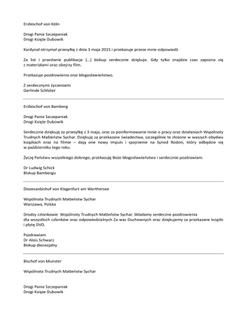 Erzbischof von Köln Drogi Panie Szczepaniak Drogi Księże Dubowik Kardynał otrzymał przesyłkę z dnia 3 maja 2015 i przekazuje przeze mnie odpowiedź. Za list i przesłanie publikacje […] biskup serdecznie dziękuje. Gdy tylko znajdzie czas zapozna się z materiałami oraz obejrzy film. Przekazuje pozdrowienia oraz błogosławieństwo. Z serdecznymi życzeniami Gerlinde Schlüter Erzbischof von Bamberg Drogi Panie Szczepaniak Drogi Księże Dubowik Serdecznie dziękuję za przesyłkę z 3 maja, oraz za poinformowanie mnie o pracy oraz działaniach Wspólnoty Trudnych Małżeństw Sychar. Dziękuję za przekazane świadectwa, szczególnie te złożone w waszych obydwu książkach oraz na filmie – dają one nowy impuls i spojrzenie na Synod Rodzin, który odbędzie się w październiku tego roku. Życzę Państwu wszystkiego dobrego, przekazuję Boże błogosławieństwo i serdecznie pozdrawiam. Dr Ludwig Schick Biskup Bambergu Diozesanbishof von Klagenfurt am Worthersee Wspólnota Trudnych Małżeństw Sychar Warszawa, Polska Drodzy członkowie Wspólnoty Trudnych Małżeństw Sychar. Składamy serdeczne pozdrowienia dla wszystkich członków oraz odpowiedzialnych Za was Duchownych oraz dziękujemy za przekazane książki i płytę DVD. Pozdrawiam Dr Alois Schwarz Biskup diecezjalny Bischof von Munster Wspólnota Trudnych Małżeństw Sychar Drogi Panie Szczepaniak Drogi Księże Dubowik Biskup Dr Felix Genn otrzymał przez Państwo przekazane materiały i pakiet Pierwszej Pomocy dla Małżeństw oraz obie książki jak i płytę. Biskup dziękuje za zaangażowanie dla Sakramentu Małżeństwa. Aby Państwa głos i świadectwa dały lepsze spojrzenie na nadchodzący Synod jesienią oraz znalazły LEPSZY (większy) rozgłos w niemieckim kościele, byłoby dobrze, aby Państwa materiały przekazano również do Biskupa Dresded – Maßen jak i do Biskupa Dr Heiner Koch, proszę przekazać je również do przedstawicieli niemieckiej konferencji biskupów zajmujących się małżeństwami i rodziną. Łączę się z Państwem, przesyłam Boże błogosławieństwo i życzę wszelkiej pomyślności. Timo Weissenberg Kapelan oraz sekretarz biskupa Weihbischof Manfred Melzer - Köln Wspólnota Trudnych Małżeństw Sychar Warszawa, Polska Drodzy członkowie Wspólnoty Trudnych Małżeństw Sychar. Serdecznie dziękuję Państwu za przesłanie, które niesie Wspólnota Sychar, które podczas nadchodzącego Synodu rzuci szczególne tło na problemy małżeństw. Obejrzałem przekazane materiały i mam nadzieję, że Ojcowie Synodu dojdą do dobrego rozwiązania w punkcie 52. Serdeczne pozdrawiam Manfred Melzer Erzbischofliches ordinariat München Wspólnota Trudnych Małżeństw Sychar Warszawa, Polska Drogi Panie Sczepaniak Drogi Księże Dubowik W imieniu Kardynała Marxa dziękuję za troskę i zaangażowanie się i stawianie ważnych pytań które w ramach nadchodzącego Synodu zostaną przedstawione. Opowiadają się za Prawdą – razem z całym episkopatem na świecie – najwyższą wartością, którą jest Sakrament Małżeństwa. Wychodzimy również z założenia, że przekazali Państwo swój głos polskiemu episkopatowi. Wspólnie z włoskimi biskupami i innymi przedstawicielami synodu Państwa pytania zostaną przedstawione w Rzymie. Z najlepszymi życzeniami i błogosławieństwem Dr Marianne Haberstzer Bischof von St. Polten Umiłowany księże Pawle! Szanowny Panie Szczepaniak! Serdecznie dziękuję za Państwa list i książki. Proszę o modlitwę w intencji Synodu, który odbędzie się jesienią. Z błogosławieństwem Klaus Küng Diözesanbischof von Linz Drogi Panie Szczepaniak, Drogi Księże Pawle Dubowik Wspólnota Trudnych Małżeństw Sychar Warszawa, Polska Dziękuję serdecznie za list oraz przekazane materiały które zostały mi przekazane w Imieniu Wspólnoty Trudnych Małżeństw Sychar i które dotarły do mnie 3 czerwca. Zapewniam Państwa, jako Biskup diecezjalny Linza, że nauka kościoła głosi nierozerwalność małżeństwa. Na Synodzie przedstawicielami austriackiej konferencji biskupiej będą Kardynał Schönborn, biskup Wiednia, a także biskup Benno Elbs von Feldkirch. Będę wspierał Synod swoją modlitwą. Za Państwa pełne zaangażowanie dla rodzin chrześcijańskich składam Boże błogosławieństwo. Z serdecznie pozdrawiam Dr Ludwig Schwarz. Biskup Linz Wiedeń Sekretariat Episkopatu Drogi Panie Szczepaniak, Kardynał Dr. Christoph Schönborn składa podziękowania za przesłane list oraz książki i płytę w maju tego roku. Oczywiście Kościół nie postawi się przeciwko własnej nauce! Serdecznie pozdrawiam Claudia Okoko Sekretariat II Kardynał Kurt Koch Pan Andrzej Szczepaniak Pan Paweł Dubowik Wspólnota Trudnych Małżeństw Sychar Warszawa, Polska Serdecznie dziękuję za przesłanie listu oraz książki Pierwsza Pomoc dla Małżeństw z 3 Maja 2015 roku. Życzę Państwu wszelkich sukcesów oraz Bożego błogosławieństwa. Serdecznie pozdrawiam Kardynał Kurt Koch