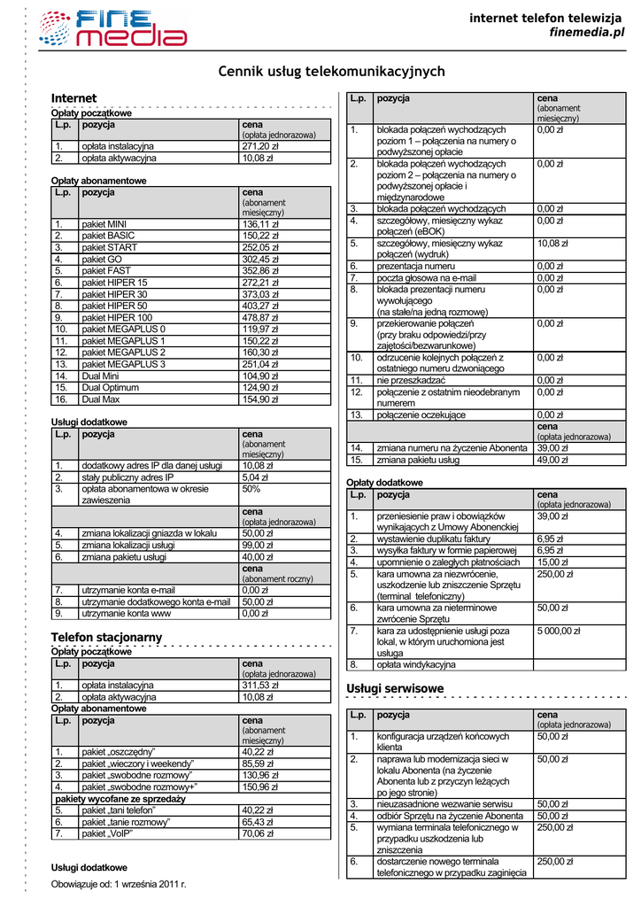 internet telefon telewizja finemedia.pl Cennik usług telekomunikacyjnych Internet Opłaty początkowe L.p. pozycja 1. 2. opłata instalacyjna opłata aktywacyjna Opłaty abonamentowe L.p. pozycja L.p. cena (opłata jednorazowa) 271,20 zł 10,08 zł 1. 2. 3. 4. 5. 6. 7. 8. 9. 10. 11. 12. 13. 14. 15. 16. pakiet MINI pakiet BASIC pakiet START pakiet GO pakiet FAST pakiet HIPER 15 pakiet HIPER 30 pakiet HIPER 50 pakiet HIPER 100 pakiet MEGAPLUS 0 pakiet MEGAPLUS 1 pakiet MEGAPLUS 2 pakiet MEGAPLUS 3 Dual Mini Dual Optimum Dual Max Usługi dodatkowe L.p. pozycja 1. 2. 3. dodatkowy adres IP dla danej usługi stały publiczny adres IP opłata abonamentowa w okresie zawieszenia 136,11 zł 150,22 zł 252,05 zł 302,45 zł 352,86 zł 272,21 zł 373,03 zł 403,27 zł 478,87 zł 119,97 zł 150,22 zł 160,30 zł 251,04 zł 104,90 zł 124,90 zł 154,90 zł 10,08 zł 5,04 zł 50% cena (opłata jednorazowa) 4. 5. 6. zmiana lokalizacji gniazda w lokalu zmiana lokalizacji usługi zmiana pakietu usługi 7. 8. 9. utrzymanie konta e-mail utrzymanie dodatkowego konta e-mail utrzymanie konta www 50,00 zł 99,00 zł 40,00 zł cena (abonament roczny) 0,00 zł 50,00 zł 0,00 zł cena (opłata jednorazowa) 1. opłata instalacyjna 2. opłata aktywacyjna Opłaty abonamentowe L.p. pozycja 311,53 zł 10,08 zł cena (abonament miesięczny) 1. pakiet „oszczędny” 2. pakiet „wieczory i weekendy” 3. pakiet „swobodne rozmowy” 4. pakiet „swobodne rozmowy+” pakiety wycofane ze sprzedaży 5. pakiet „tani telefon” 6. pakiet „tanie rozmowy” 7. pakiet „VoIP” Usługi dodatkowe Obowiązuje od: 1 września 2011 r. 13. blokada połączeń wychodzących poziom 1 – połączenia na numery o podwyższonej opłacie blokada połączeń wychodzących poziom 2 – połączenia na numery o podwyższonej opłacie i międzynarodowe blokada połączeń wychodzących szczegółowy, miesięczny wykaz połączeń (eBOK) szczegółowy, miesięczny wykaz połączeń (wydruk) prezentacja numeru poczta głosowa na e-mail blokada prezentacji numeru wywołującego (na stałe/na jedną rozmowę) przekierowanie połączeń (przy braku odpowiedzi/przy zajętości/bezwarunkowe) odrzucenie kolejnych połączeń z ostatniego numeru dzwoniącego nie przeszkadzać połączenie z ostatnim nieodebranym numerem połączenie oczekujące 14. 15. zmiana numeru na życzenie Abonenta 39,00 zł zmiana pakietu usług 49,00 zł 2. 3. 4. 5. 6. 7. 8. 9. 10. 11. 12. 40,22 zł 85,59 zł 130,96 zł 150,96 zł 40,22 zł 65,43 zł 70,06 zł 0,00 zł 0,00 zł 0,00 zł 0,00 zł 10,08 zł 0,00 zł 0,00 zł 0,00 zł 0,00 zł 0,00 zł 0,00 zł 0,00 zł 0,00 zł cena (opłata jednorazowa) Opłaty dodatkowe L.p. pozycja cena (opłata jednorazowa) 1. 2. 3. 4. 5. 6. 7. Telefon stacjonarny Opłaty początkowe L.p. pozycja 1. cena (abonament miesięczny) cena (abonament miesięczny) cena (abonament miesięczny) pozycja 8. przeniesienie praw i obowiązków wynikających z Umowy Abonenckiej wystawienie duplikatu faktury wysyłka faktury w formie papierowej upomnienie o zaległych płatnościach kara umowna za niezwrócenie, uszkodzenie lub zniszczenie Sprzętu (terminal telefoniczny) kara umowna za nieterminowe zwrócenie Sprzętu kara za udostępnienie usługi poza lokal, w którym uruchomiona jest usługa opłata windykacyjna 39,00 zł 6,95 zł 6,95 zł 15,00 zł 250,00 zł 50,00 zł 5 000,00 zł Usługi serwisowe L.p. pozycja cena 1. konfiguracja urządzeń końcowych klienta naprawa lub modernizacja sieci w lokalu Abonenta (na życzenie Abonenta lub z przyczyn leżących po jego stronie) nieuzasadnione wezwanie serwisu odbiór Sprzętu na życzenie Abonenta wymiana terminala telefonicznego w przypadku uszkodzenia lub zniszczenia dostarczenie nowego terminala telefonicznego w przypadku zaginięcia 50,00 zł 2. 3. 4. 5. 6. (opłata jednorazowa) 50,00 zł 50,00 zł 50,00 zł 250,00 zł 250,00 zł