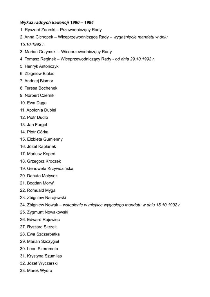 Wykaz radnych kadencji 1990 – 1994 1. Ryszard Zaorski – Przewodniczący Rady 2. Anna Cichopek – Wiceprzewodnicząca Rady – wygaśnięcie mandatu w dniu 15.10.1992 r. 3. Marian Grzymski – Wiceprzewodniczący Rady 4. Tomasz Reginek – Wiceprzewodniczący Rady - od dnia 29.10.1992 r. 5. Henryk Antończyk 6. Zbigniew Białas 7. Andrzej Bismor 8. Teresa Bochenek 9. Norbert Czernik 10. Ewa Dąga 11. Apolonia Dubiel 12. Piotr Dudło 13. Jan Furgoł 14. Piotr Górka 15. Elżbieta Gumienny 16. Józef Kapłanek 17. Mariusz Kopeć 18. Grzegorz Kroczek 19. Genowefa Krzywdzińska 20. Danuta Matysek 21. Bogdan Moryń 22. Romuald Myga 23. Zbigniew Narajewski 24. Zbigniew Nowak – wstąpienie w miejsce wygasłego mandatu w dniu 15.10.1992 r. 25. Zygmunt Nowakowski 26. Edward Rojowiec 27. Ryszard Skrzek 28. Ewa Szczerbetka 29. Marian Szczygieł 30. Leon Szeremeta 31. Krystyna Szumilas 32. Józef Wyczarski 33. Marek Wydra Wykaz radnych kadencji 1994 – 1998 1. Tomasz Reginek – Przewodniczący Rady 2. Norbert Czernik - Wiceprzewodniczący Rady 3. Jan Furgoł – Wiceprzewodniczący Rady 4. Henryk Antończyk 5. Edward Bełżko 6. Teresa Bochenek 7. Roman Buchta 8. Zenon Dąbrowski 9. Stanisław Dolata 10. Apolonia Dubiel 11. Alojzy Fojcik 12. Elżbieta Gumienny 13. Eryk Hejna 14. Marek Hildebrandt 15. Kazimierz Kachel 16. Józef Kapłanek 17. Tadeusz Kneifel 18. Edward Król 19. Danuta Matysek 20. Romuald Myga 21. Franciszek Nosiadek 22. Adam Rams 23. Edward Rojowiec 24. Edward Smycz 25. Ewa Szczerbetka 26. Marian Szczygieł 27. Adam Szczypka 28. Leon Szeremeta 29. Emil Szolc 30. Jan Szumilas 31. Leokadia Walczak 32. Stanisław Wojciechowski Wykaz radnych kadencji 1998 – 2002 1. Marek Hildebrandt - Przewodniczący Rady 2. Jan Furgoł - Wiceprzewodniczący Rady 3. Herman Hojka – Wiceprzewodniczący Rady 4. Henryk Antończyk 5. Zbigniew Białas 6. Wiesław Brzeziński 7. Zbigniew Buczak – wygaśnięcie mandatu w dniu 28.02.2001 r. 8. Władysław Dankowski 9. Apolonia Dubiel 10. Krzysztof Dudziec – wstąpienie w miejsce wygasłego mandatu w dniu 19.10.2000 r. 11. Dariusz Dzindzio 12. Piotr Górka 13. Włodzimierz Gwiżdż 14. Eryk Hejna 15. Michał Kędzierski 16. Teresa Kocierz 17. Andrzej Kołodziej 18. Henryk Kopiszka 19. Jan Kowol 20. Danuta Matysek 21. Grzegorz Mordal 22. Romuald Myga 23. Mirosław Nowak 24. Jerzy Pach 25. Tadeusz Pieniak 26. Dariusz Plewiński 27. Edward Rojowiec 28. Krzysztof Stolarek – wygaśnięcie mandatu w dniu 01.09.2000 r. 29. Emil Szolc 30. Adam Tąpała – wstąpienie w miejsce wygasłego mandatu w dniu 29.03.2001 r. 31. Jan Tomecki 32. Stanisław Wojciechowski 33. Zbigniew Wojciechowski 34. Mirosław Wolski Wykaz radnych kadencji 2002 – 2006 1. Tomasz Reginek - Przewodniczący Rady 2. Henryk Hibszer - Wiceprzewodniczący Rady 3. Jan Trzęsiok – Wiceprzewodniczący Rady 4. Roman Buchta 5. Zbigniew Buczak – wygaśnięcie mandatu w dniu 24.04.2003 r. 6. Przemysław Dulias 7. Dariusz Dzindzio 8. Jan Furgoł 9. Zbigniew Gałkowski 10. Barbara Gawlińska – Twardawa 11. Marek Hildebrandt 12. Kazimierz Kachel – wygaśnięcie mandatu z dniem 20.11.2002 r. 13. Teresa Kocierz 14. Antoni Krzyszczuk – wstąpienie w miejsce wygasłego mandatu w dniu 21.10.2004 r. 15. Joachim Machulik – wstąpienie w miejsce wygasłego mandatu w dniu 05.12.2002 r. 16. Grzegorz Nocoń 17. Jerzy Pach 18. Tadeusz Pieniak 19. Brygida Pomarańska 20. Adam Rams – stwierdzenie wygaśnięcia mandatu w dniu 19.11.2002 r. 21. Emil Szolc 22. Eugeniusz Szybiak – wstąpienie w miejsce wygasłego mandatu w dniu 28.11.2002 r. - wygaśnięcie mandatu z dniem 01.09.2004 r. 23. Mirosław Świerk – wstąpienie w miejsce wygasłego mandatu w dniu 22.05.2003 r. 24. Eugeniusz Tymoszek 25. Zbigniew Wojciechowski Wykaz radnych kadencji 2006 – 2010 1. Kazimierz Kachel - Przewodniczący Rady 2. Barbara Gawlińska-Twardawa- Wiceprzewodnicząca Rady 3. Joachim Machulik- Wiceprzewodniczący Rady 4. Roman Buchta 5. Przemysław Dulias 6.Dariusz Dzindzio – zrzekł się mandatu 7. Roman Głód 8. Izydor Golec 9. Henryk Hibszer 10. Marek Hildebrandt 11. Paweł Kamiński 12. Antoni Krzyszczuk 13. Henryk Kurowski 14. Grzegorz Nocoń 15. Jerzy Pach 16. Tomasz Rzepa 17. Krzysztof Stolarek – zrzekł się mandatu 18. Franciszek Szafarz 19. Emil Szolc 20. Jan Tomecki - wstąpił w dniu 17.10.2007r. w miejsce Dariusza Dzindzio 21. Jan Trzęsiok 22. Eugeniusz Tymoszek - wstąpił w dniu 28.02.2007r. w miejsce Krzysztofa Stolarka 23. Zbigniew Wojciechowski