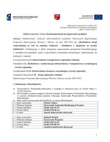 Załącznik do Uchwały Nr 31/400/11/IV Zarządu Województwa Warmińsko-Mazurskiego z dnia 7 czerwca 2011 r. Zakres rzeczowy wraz z harmonogramem przygotowania projektu objętego Indykatywnym wykazem indywidualnych projektów kluczowych Regionalnego Programu Operacyjnego Warmia i Mazury na lata 2007-2013 pt. „Rozbudowa drogi wojewódzkiej nr 544 na odcinku Lidzbark – Działdowo z obejściem na terenie Lidzbarka” wchodzącego w skład „Programu usprawnienia powiązania komunikacyjnego w południowo-zachodniej części województwa warmińsko-mazurskiego” planowanego do realizacji w ramach: • osi priorytetowej 5. Infrastruktura transportowa regionalna i lokalna, • działania 5.1. Rozbudowa i modernizacja infrastruktury transportowej warunkującej rozwój regionalny, • poddziałania 5.1.6. Infrastruktura drogowa warunkująca rozwój regionalny, • kategorii interwencji 23 – drogi regionalne i lokalne Regionalnego Programu Operacyjnego Warmia i Mazury na lata 2007-2013. 1. Informacje o Beneficjencie: a) Województwo Warmińsko-Mazurskie z siedzibą w Olsztynie przy ul. Emilii Plater 1, 10-562 Olsztyn; b) Dla Projektu zostanie podjęta Uchwała Zarządu Województwa Warmińsko-Mazurskiego w sprawie dofinansowania projektu własnego Samorządu Województwa WarmińskoMazurskiego; c) dane osoby wyznaczonej do kontaktów ze strony Beneficjenta: 1. Imię i nazwisko: Marek Nałęcz 2. Pełniona funkcja: Kierownik Jednostki Realizującej Projekt 3. Numer telefonu: (0-89) 526-19-75 4. Numer faksu: (0-89) 539-98-76 5. E-mail: [email protected] 1. 2. 3. 4. 5. Imię i nazwisko: Pełniona funkcja: Numer telefonu: Numer faksu: E-mail: Roland Wiejek Kierownik Projektu (0-89) 526-19-67 (0-89) 539-98-76 [email protected] 1 2. Zakres rzeczowy Projektu: Projekt zakłada rozbudowę drogi wojewódzkiej nr 544 na odcinku Lidzbark – Działdowo z obejściem na terenie Lidzbarka o długości ok. 26,600 km (w tym 3,250 km wybudowanej drogi). Przedmiotowa inwestycja obejmuje następujące działania: I. Związane z przygotowaniem projektu (m.in. wykonanie/aktualizację studium wykonalności, wykonanie aktualizacji dokumentacji projektowej z uzyskaniem decyzji środowiskowej i raportem oddziaływania na środowisko - jeśli będzie wymagany oraz opracowanie /uzyskanie innych wymaganych przez prawo krajowe, wspólnotowe albo przez Instytucję Zarządzającą dokumentów). II. Związane bezpośrednio z realizacją projektu m.in.: 1. Nabycie nieruchomości (gruntu), 2. Roboty budowlane: • budowa nowego odcinka drogi o szerokości min. 6,00 m, o obciąŜeniu jezdni 100 kN/oś, kategorii ruchu KR-3 z projektowaną prędkością 60 km/h, • uzyskanie klasy G lub Z poprzez dostosowanie szerokości jezdni do normatywnej oraz korektę łuków poziomych i pionowych /w miarę moŜliwości terenowych oraz przy uwzględnieniu ograniczeń wynikających z odrębnych przepisów np. ustawy o ochronie środowiska/, • wzmocnienie nawierzchni do 100 kN/oś z moŜliwością wzmocnienia do 115 kN/oś poprzez dobudowę górnych warstw nawierzchni • przebudowa skrzyŜowań na skrzyŜowania z wydzielonymi wlotami na drodze podporządkowanej, • budowa skrzyŜowań z linią kolejową, • budowa/przebudowa istniejących zjazdów indywidualnych i publicznych w oparciu o parametry właściwe dla funkcji zjazdu, • budowa przejść dla pieszych wraz z azylami, • budowa zatok autobusowych wraz z peronami dla podróŜnych o parametrach: długość krawędzi zatrzymania – 20,00m, szerokość zatoki 3,00-3,50m., szerokość peronu min.1,5m: − ok. 10 przystanków do budowy, − ok.15 przystanków do przebudowy, • budowa i przebudowa ok. 2 parkingów przydroŜnych , • budowa jednego parkingu dla pojazdu asenizacyjnego, • budowa dodatkowych miejsc postojowych i dróg zbierających /w miarę moŜliwości terenowych i potrzeb wynikających z funkcji zagospodarowania przyległego do drogi terenu budowa chodników, • budowa ścieŜek rowerowych, • przebudowa obiektów inŜynierskich na klasę A (50 ton): − budowa mostu na rzece Wel w Lidzbarku, − przebudowa ok. 16 przepustów ( w tym wykorzystanie na przejścia dla zwierząt), w tym przebudowa na przepusty ok. 4 obiektów mostowych w miejscowościach Cibórz, Pierławki, Działdowo i Borki, • budowa/przebudowa odwodnienia drogi, • budowa/przebudowa oświetlenia ulicznego, • wycinka drzew kolidujących z przebudową i zagraŜających bezpieczeństwu, • przebudowa kolizji z urządzeniami obcymi, 2 • przebudowę urządzeń infrastruktury technicznej pod i naziemnej kolidujących z inwestycją, • zagospodarowanie zieleni w granicach projektowanego pasa drogowego, • zastosowanie rozwiązań technicznych zapewniających poprawę bezpieczeństwa ruchu drogowego, w tym oznakowanie pionowe i poziome, • inne elementy uznane na etapie projektowania za konieczne do wykonania. 3. Wykonanie robót budowlanych zgodnie z warunkami i wariantem wskazanym w decyzji o środowiskowych uwarunkowaniach realizacji przedsięwzięcia i decyzji ZRID, przewidującym wycinkę drzew kolidujących z zamierzeniami wymienionymi powyŜej, w miejscach utrudniających widoczność i bezpieczeństwo ruchu. Pozostawione zostaną drzewa tworzące szpalery alei przydroŜnych, oraz większość drzew będących siedliskami gatunków flory i fauny chronionej. Z racji pozostawienia drzew w skrajni drogi, inwestycja obejmuje poszerzenie jezdni do wymaganych parametrów drogi wojewódzkiej z odstępstwami. III. Związane z zarządzaniem projektu (m.in. zarządzanie i nadzór nad robotami – InŜynier Kontraktu, promocja projektu, audyt projektu, jeśli będzie wymagany przepisami prawa lub postanowieniami umowy o dofinansowanie projektu). Wskaźnik produktu: Długość zrekonstruowanych dróg wojewódzkich – ok. 23,350 km; Długość nowych dróg wojewódzkich – 3,250 km 3. Szacowany budŜet Projektu: Szacunkowe maksymalne całkowite koszty realizacji Projektu wynoszą 62 447 250,0