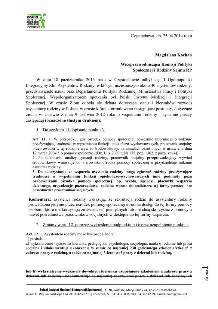 Częstochowa, dn. 25.04.2014 roku Magdalena Kochan Wiceprzewodnicząca Komisji Polityki Społecznej i Rodziny Sejmu RP W dniu 18 października 2013 roku w Częstochowie odbył się II Ogólnopolski Integracyjny Zlot Asystentów Rodziny, w którym uczestniczyło około 40 asystentów rodziny, przedstawiciele nauki oraz Departamentu Polityki Rodzinnej Ministerstwa Pracy i Polityki Społecznej. Współorganizatorem spotkania był Polski Instytut Mediacji i Integracji Społecznej. W czasie Zlotu odbyła się debata dotycząca stanu i kierunków rozwoju asystentury rodziny w Polsce, w czasie której sformułowano następujące postulaty, dotyczące zmian w Ustawie z dnia 9 czerwca 2012 roku o wspieraniu rodziny i systemie pieczy zastępczej (oznaczono tłustym drukiem): 1. Do artykułu 11 dopisanie punktu 3. Art. 11. 1. W przypadku, gdy ośrodek pomocy społecznej poweźmie informacje o rodzinie przeżywającej trudności w wypełnianiu funkcji opiekuńczo-wychowawczych, pracownik socjalny przeprowadza w tej rodzinie wywiad środowiskowy, na zasadach określonych w ustawie. z dnia 12 marca 2004 r. o pomocy społecznej (Dz. U. z 2009 r. Nr 175, poz. 1362, z pózn. zm.4)). 2. Po dokonaniu analizy sytuacji rodziny, pracownik socjalny przeprowadzający wywiad środowiskowy wnioskuje do kierownika ośrodka pomocy społecznej o przydzielenie rodzinie asystenta rodziny. 3. Do skorzystania ze wsparcia asystenta rodziny mogą zgłaszać rodziny przeżywające trudności w wypełnianiu funkcji opiekuńczo-wychowawczych inne podmioty poza pracownikami ośrodka pomocy społecznej, np. szkoła, sąsiedzi, placówki wsparcia dziennego, organizacje pozarządowe, rodzina wprost do realizatora tej formy pomocy, bez pośrednictwa pracowników socjalnych. Komentarz: asystenci rodziny wskazują, że rekrutacja rodzin do asystentury rodziny prowadzona jedynie przez ośrodek pomocy społecznej utrudnia dostęp do tej formy pomocy osobom, które nie korzystają ze świadczeń pieniężnych lub nie chcą skorzystać z pomocy a nawet pośrednictwa pracowników socjalnych w dostępie do tej formy wsparcia. 2. Zmiany w art. 12. poprzez wykreślenie podpunktu b i c oraz uzupełnienie punktu a. Polski Instytut Mediacji i Integracji Społecznej, Al. Najświętszej Maryi Panny 24, 42-202 Częstochowa Biuro: Al. Wojska Polskiego 124 lok. 3, 42-207 Częstochowa, tel. 34 34 30 038, faks: 34 387 12 39, e-mail: [email protected] Strona lub b) wykształcenie wyższe na dowolnym kierunku uzupełnione szkoleniem z zakresu pracy z dziećmi lub rodziną i udokumentuje co najmniej roczny staż pracy z dziećmi lub rodziną lub 1 Art. 12. 1. Asystentem rodziny może być osoba, która: 1) posiada: a) wykształcenie wyższe na kierunku pedagogika, psychologia, socjologia, nauki o rodzinie lub praca socjalna i udokumentuje ukończenie w sumie co najmniej 230 godzinnego szkolenia/szkoleń z zakresu pracy z rodziną, a także co najmniej 3-letni staż pracy z dziećmi lub rodziną, studiami podyplomowymi obejmującymi zakres programowy szkolenia określony na podstawie ust. 3 i udokumentuje co najmniej roczny staż pracy z dziećmi lub rodziną lub c) wykształcenie średnie i szkolenie z zakresu pracy z dziećmi lub rodzina, a także udokumentuje co najmniej 3-letni staż pracy z dziećmi lub rodziną; Komentarz: asystenci rodziny oraz uczestniczący w Zlocie przedstawiciele nauki (dr Dobroniega Trawkowska i dr Barbara Kowalczyk z Uniwersytetu Śląskiego, prof. dr hab. Piotr Sałustowicz z Wyższej Szkoły Psychologii Stosowanej w Warszawie, dr Izabela Krasiejko z Akademii im. Jana Długosza) uważają, iż posiadanie wyższego specjalistycznego wykształcenia oraz doświadczenia w pracy z rodziną przez osoby wykonujące ten zawód jest niezbędne ze względu na: cel, którym jest przeciwdziałanie odebrania dziecka z rodziny oraz pomoc rodzinie w osiągnięciu umiejętności samodzielnego rozwiązywania swoich problemów poprzez podjęcie przez rodziców pracy nad zmianą, różnorodność zadań wypełnianych przez asystenta rodziny określonych w art. 15. ust. 1 ustawy o wspieraniu rodziny, umiejętność określenia zagrożenia dla dziecka w rodzinie, czyli ocenienia, kiedy dziecko jeszcze może być w rodzinie biologicznej a kiedy powinno być odebrane do pieczy zastępczej, brak możliwości dokonania pogłębionej wstępnej diagnozy przez pracownika socjalnego w momencie przydzielania asystenta do rodziny, potwierdzony w praktyce, trudność i złożoność pracy z rodzinami z wieloma problemami, gdzie zazwyczaj niskie umiejętności opiekuńczo-wychowawcze i prowadzenia gospodarstwa domowego rodziców są jednym z problemów obok takich jak: przemoc, uzależnienia, zadłużenia, ubóstwo, bezrobocie, zagrożenie bezdomnością, związaną z tym konieczność wsparcia rodziny w kilku sferach (socjalno-bytowej, psychologicznej, zawodowej, społecznej, zdrowotnej), specyfikę pracy z rodziną z wieloma problemami, która wymusza zastosowanie modelu pracy socjalno-wychowaczej i terapeutycznej oraz dialogu motywującego do zmiany, zróżnicowane w obrębie gmin, zwłaszcza niskie w gminach wiejskich lokalne zasoby pomocowe, które nie zawsze pozwalają na współpracę z innymi specjalistami, prestiż zawodu. Należałoby określić np. trzyletni okres przejściowy na uzupełnienie wykształcenia. Polski Instytut Mediacji i Integracji Społecznej, Al. Najświętszej Maryi Panny 24, 42-202 Częstochowa Biuro: Al. Wojska Polskiego 124 lok. 3, 42-207 Częstochowa, tel. 34 34 30 038, faks: 34 387 12 39, e-mail: [email protected] Strona 7. Asystent rodziny ma prawo do korzystania z superwizji pracy socjalno-wychowaczej i terapeutycznej z rodziną. 8. Minister właściwy do spraw zabezpieczenia społecznego może określić, w drodze rozporządzenia: 1) wytyczne i standard dla superwizji pracy socjalno-wychowaczej i terapeutycznej z rodziną, 2) tryb nadawania certyfikatu superwizora pracy socjalno-wychowaczej i terapeutycznej z rodziną,