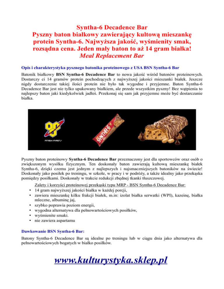 Syntha-6 Decadence Bar Pyszny baton białkowy zawierający kultową mieszankę protein Syntha-6. Najwyższa jakość, wyśmienity smak, rozsądna cena. Jeden mały baton to aż 14 gram białka! Meal Replacement Bar Opis i charakterystyka pysznego batonika proteinowego z USA BSN Syntha-6 Bar Batonik białkowy BSN Syntha-6 Decadence Bar to nowa jakość wśród batonów proteinowych. Dostarczy ci 14 gramów protein pochodzących z najwyższej jakości mieszanki białek. Jeszcze nigdy dostarczenie takiej ilości protein nie było tak wygodne i przyjemne. Baton Syntha-6 Decadence Bar jest nie tylko upakowany białkiem, ale przede wszystkim pyszny! Bez wątpienia to najlepszy baton jaki kiedykolwiek jadłeś. Przekonaj się sam jak przyjemne może być dostarczanie białka. Pyszny baton proteinowy Syntha-6 Decadence Bar przeznaczony jest dla sportowców oraz osób o zwiększonym wysiłku fizycznym. Ten doskonały baton zawierają kultową mieszankę białek Syntha-6, dzięki czemu jest jednym z najlepszych i najsmaczniejszych batoników na świecie! Doskonały jako posiłek po treningu, w szkole, w pracy i w podróży, a także idealny jako przekąska pomiędzy posiłkami. Doskonały w trakcie redukcji zbędnej tkanki tłuszczowej. • • • • • • Zalety i korzyści proteinowej przekąski typu MRP - BSN Syntha-6 Decadence Bar: 14 gram najwyższej jakości białka w każdej porcji, zawiera mieszankę kilku frakcji białek, m.in: izolat białka serwatki (WPI), kazeinę, białka mleczne, albuminę jaj, szybko poprawia poziom energii, wygodna alternatywa dla pełnowartościowych posiłków, wyśmienite smaki. nie zawiera aspartamu Dawkowanie BSN Syntha-6 Bar: Batony Syntha-6 Decadence Bar są idealne po treningu lub w ciągu dnia jako alternatywa dla pełnowartościowych bogatych w białko posiłków. www.kulturystyka.sklep.pl Skład pysznego batonika białkowego - BSN Syntha-6 Decadence Bar: Chocolate Caramel Pretzel Zawartość: w jednej porcja 1 baton Wartość energetyczna 170 kcal Tłuszcz 4,5 g - tłuszcze trans 0g Cholesterol 0 mg Sód 190 mg Potas 95 mg Węglowodany 21 g Błonnik 0g Cukier 6g Alkohol cukrowy 9g Białko 14 g Witamin A 0% Witamin C 0% Wapń 6% Żelazo 8% Inne składniki: Protein Blend Consisting Of: ([Whey Protein Isolate, Calcium Caseinate, Milk Protein Isolate, Milk Protein Concentrate, Micellar Casein, Egg Albumen], Hydrolyzed Collagen, Soy Protein Isolate), Marshmallow Cream Top Consisting Of: (Maltitol, Milk Protein, Sorbitol, Palm Kernel Oil. Less Than 2% Of Each: Salt, Soy Lecithin, And Natural Flavor), Yogurt Flavored Coating Consisting Of: (Sugar, Palm Kernel Oil, Non Fat Dry Milk Solids, Yogurt Powder Consisting Of: [Cultured Whey Protein Concentrate, Cultured Skim Milk, And Yogurt Culture], Soy Lecithin, Salt, Natural Flavor), Cookie Bits Consisting Of: (Wheat Flour, Sugar, Fractionated Palm Kernel Oil, Alkalized Cocoa, Salt, And Baking Soda), Maltitol Syrup, Glycerin, Drizzle Coating Consisting Of: (Sugar, Fractionanted Palm Kernel Oil, Cocoa Powder, Whey Powder, Nonfat Milk Powder, Soy Lecithin (An Emulsifier), And Natural Vanilla Flavor), Soy Crisps Consisting Of: (Soy Protein Isolate, Tapioca Starch, Salt), Water, Alkalized Cocoa Powder, Sunflower Oil, Medium Chain Triglycerides, Soy Lecithin, Palm Oil, Natural And Artificial Flavor, Salt, Acesulfame Potassium Salt, Almond Meal, Peanut Flour, And Sucralose. *RDA - Procent realizacji zalecanego dziennego spożycia. www.kulturystyka.sklep.pl