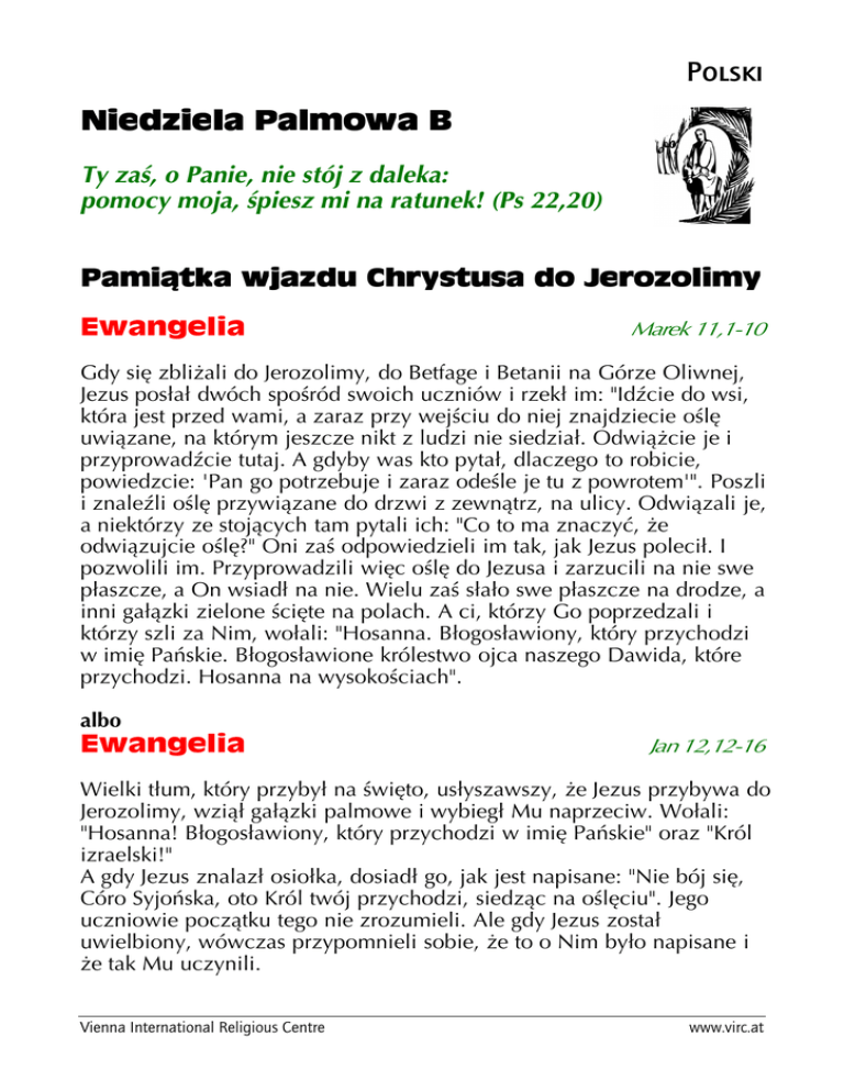 Polski Ty zaś, o Panie, nie stój z daleka: pomocy moja, śpiesz mi na ratunek! (Ps 22,20) Gdy się zbliżali do Jerozolimy, do Betfage i Betanii na Górze Oliwnej, Jezus posłał dwóch spośród swoich uczniów i rzekł im: "Idźcie do wsi, która jest przed wami, a zaraz przy wejściu do niej znajdziecie oślę uwiązane, na którym jeszcze nikt z ludzi nie siedział. Odwiążcie je i przyprowadźcie tutaj. A gdyby was kto pytał, dlaczego to robicie, powiedzcie: 'Pan go potrzebuje i zaraz odeśle je tu z powrotem'". Poszli i znaleźli oślę przywiązane do drzwi z zewnątrz, na ulicy. Odwiązali je, a niektórzy ze stojących tam pytali ich: "Co to ma znaczyć, że odwiązujcie oślę?" Oni zaś odpowiedzieli im tak, jak Jezus polecił. I pozwolili im. Przyprowadzili więc oślę do Jezusa i zarzucili na nie swe płaszcze, a On wsiadł na nie. Wielu zaś słało swe płaszcze na drodze, a inni gałązki zielone ścięte na polach. A ci, którzy Go poprzedzali i którzy szli za Nim, wołali: "Hosanna. Błogosławiony, który przychodzi w imię Pańskie. Błogosławione królestwo ojca naszego Dawida, które przychodzi. Hosanna na wysokościach". albo Wielki tłum, który przybył na święto, usłyszawszy, że Jezus przybywa do Jerozolimy, wziął gałązki palmowe i wybiegł Mu naprzeciw. Wołali: "Hosanna! Błogosławiony, który przychodzi w imię Pańskie" oraz "Król izraelski!" A gdy Jezus znalazł osiołka, dosiadł go, jak jest napisane: "Nie bój się, Córo Syjońska, oto Król twój przychodzi, siedząc na oślęciu". Jego uczniowie początku tego nie zrozumieli. Ale gdy Jezus został uwielbiony, wówczas przypomnieli sobie, że to o Nim było napisane i że tak Mu uczynili. Vienna International Religious Centre www.virc.at Pan Bóg mnie obdarzył językiem wymownym, bym umiał przyjść z pomocą strudzonemu przez słowo krzepiące. Każdego rana pobudza me ucho, bym słuchał jak uczniowie. Pan Bóg otworzył mi ucho, a ja się nie oparłem, ani się nie cofnąłem. Podałem grzbiet mój bijącym i policzki moje rwącym mi brodę. Nie zasłoniłem mej twarzy przed zniewagami i opluciem. Pan Bóg mnie wspomaga, dlatego jestem nieczuły na obelgi, dlatego uczyniłem twarz moją jak głaz i wiem, że wstydu nie doznam. Chrystus Jezus istniejąc w postaci Bożej, nie skorzystał ze sposobności, aby na równi być z Bogiem, lecz ogołocił samego siebie, przyjąwszy postać sługi, stawszy się podobnym do ludzi. A w tym co zewnętrzne uznany za człowieka, uniżył samego siebie, stawszy się posłusznym aż do śmierci, i to śmierci krzyżowej. Dlatego też Bóg wywyższył Go nad wszystko i darował Mu imię ponad wszelkie imię, aby na imię Jezusa zgięło się każde kolano istot niebieskich i ziemskich, i podziemnych, i aby wszelki język wyznał, że Jezus Chrystus jest Panem ku chwale Boga Ojca. Spisek przeciw Jezusowi Dwa dni przed Pascha i Świętem Przaśników arcykapłani i uczeni w Piśmie szukali sposobu, jak by Jezusa podstępnie ująć i zabić. Lecz mówili: Tylko nie w czasie święta, by nie było wzburzenia między ludem. Namaszczenie w Betanii A gdy Jezus był w Betanii, w domu Szymona Trędowatego, i siedział za stołem, przyszła kobieta z alabastrowym flakonikiem prawdziwego olejku nardowego, bardzo drogiego. Stłukla flakonik i wylała Mu olejek na głowę. A niektórzy oburzali się, mówiąc między sobą: Po co to marnowanie olejku? Wszak można było olejek ten sprzedać drożej niż za trzysta denarów i rozdać ubogim. I przeciw niej szemrali. Lecz Jezus rzekł: Zostawcie ją; czemu sprawiacie jej przykrość? Dobry uczynek spełniła względem Mnie. Bo ubogich zawsze macie u siebie i kiedy zechcecie, możecie im dobrze czynić; lecz Mnie nie zawsze macie. Ona uczyniła, co mogła; już naprzód namaściła moje ciało na pogrzeb. Zaprawdę powiadam wam: Gdziekolwiek po całym świecie głosić będą tę Ewangelię, będą również opowiadać na jej pamiątkę to, co uczyniła. Vienna International Religious Centre [email protected] Zdrada Judasza Wtedy Judasz Iskariota, jeden z Dwunastu, poszedł do arcykapłanów, aby im Go wydać. Gdy to usłyszeli, ucieszyli się i przyrzekli dać mu pieniądze. Odtąd szukał dogodnej sposobności, jak by Go wydać. Przygotowanie Paschy W pierwszy dzień Przaśników, kiedy ofiarowywano Paschę, zapytali Jezusa Jego uczniowie: Gdzie chcesz, abyśmy poszli poczynić przygotowania, żebyś mógł spożyć Paschę? I posłał dwóch spośród swoich uczniów z tym poleceniem: Idźcie do miasta, a spotka was człowiek, niosący dzban wody. Idźcie za nim i tam, gdzie wejdzie, powiedzcie gospodarzowi: Nauczyciel pyta: gdzie jest dla Mnie izba, w której mógłbym spożyć Paschę z moimi uczniami? On wskaże wam na górze salę dużą, usłaną i gotową. Tam przygotujecie dla nas. Uczniowie wybrali się i przyszli do miasta, gdzie znaleźli, tak jak im powiedział, i przygotowali Paschę. Zapowiedź zdrady Z nastaniem wieczoru przyszedł tam razem z Dwunastoma. A gdy zajęli miejsca i jedli, Jezus rzekł: Zaprawdę, powiadam wam: jeden z was Mnie zdradzi, ten, który je ze Mną. Zaczęli się smucić i pytać jeden po drugim: Czyżbym ja? On im rzekł: Jeden z Dwunastu, ten, który ze Mną rękę zanurza w misie. Wprawdzie Syn Człowieczy odchodzi, jak o Nim jest napisane, lecz biada temu człowiekowi, przez którego Syn Człowieczy będzie wydany. Byłoby lepiej dla tego człowieka, gdyby się nie narodził. Ustanowienie Eucharystii A gdy jedli, wziął chleb, odmówił błogosławieństwo, połamał go i dał im mówiąc: Bierzcie, to jest Ciało moje. Potem wziął kielich i odmówiwszy dziękczynienie dał im, i pili z niego wszyscy. I rzekł do nich: To jest moja Krew Przymierza, która za wielu będzie wylana. Zaprawdę powiadam wam: Odtąd nie będę już pił z owocu winnego krzewu aż do owego dnia, kiedy pić go będę nowy w królestwie Bożym. Przepowiednia zaparcia się Piotra Po odśpiewan