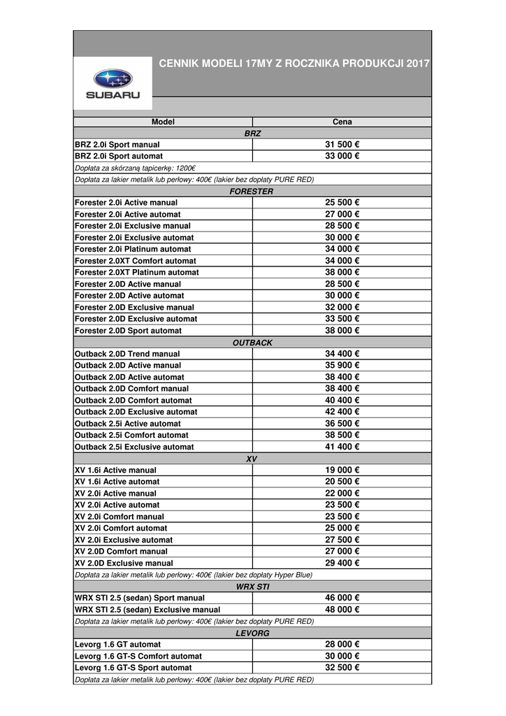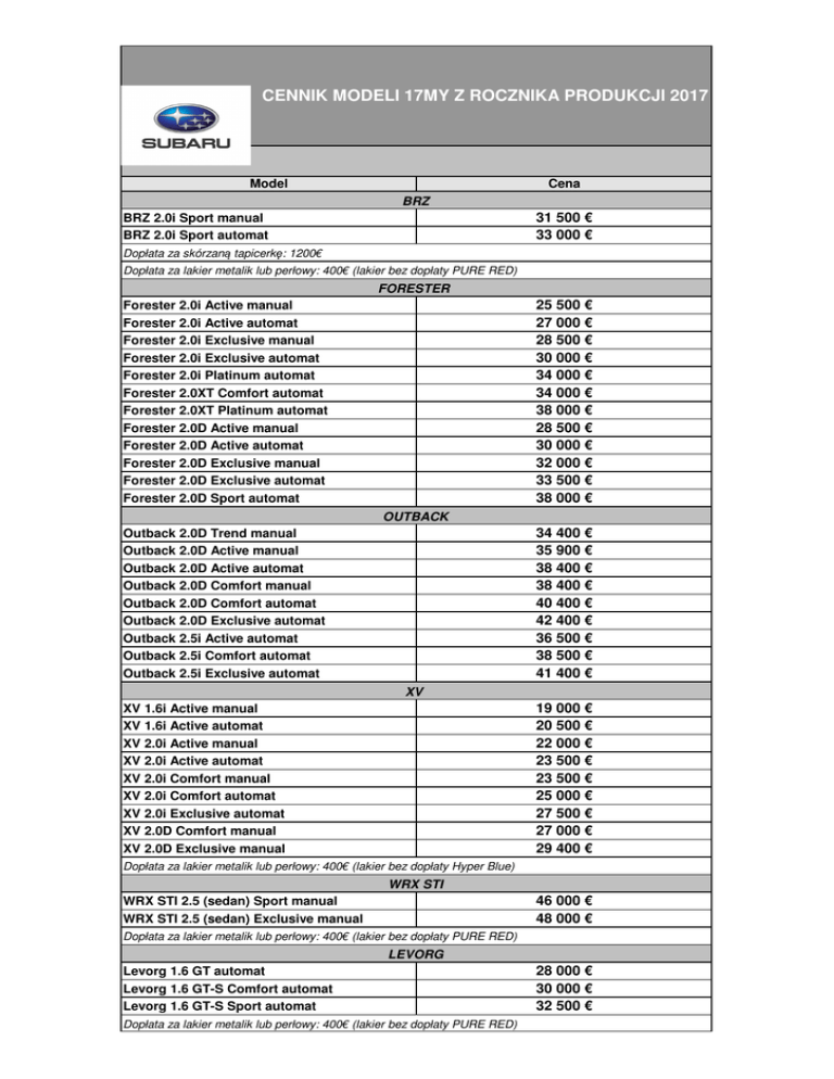 CENNIK MODELI 17MY Z ROCZNIKA PRODUKCJI 2017 Model Cena BRZ 31 500 € 33 000 € BRZ 2.0i Sport manual BRZ 2.0i Sport automat Dopłata za skórzaną tapicerkę: 1200€ Dopłata za lakier metalik lub perłowy: 400€ (lakier bez dopłaty PURE RED) FORESTER 25 500 € 27 000 € 28 500 € 30 000 € 34 000 € 34 000 € 38 000 € 28 500 € 30 000 € 32 000 € 33 500 € 38 000 € Forester 2.0i Active manual Forester 2.0i Active automat Forester 2.0i Exclusive manual Forester 2.0i Exclusive automat Forester 2.0i Platinum automat Forester 2.0XT Comfort automat Forester 2.0XT Platinum automat Forester 2.0D Active manual Forester 2.0D Active automat Forester 2.0D Exclusive manual Forester 2.0D Exclusive automat Forester 2.0D Sport automat OUTBACK 34 400 € 35 900 € 38 400 € 38 400 € 40 400 € 42 400 € 36 500 € 38 500 € 41 400 € Outback 2.0D Trend manual Outback 2.0D Active manual Outback 2.0D Active automat Outback 2.0D Comfort manual Outback 2.0D Comfort automat Outback 2.0D Exclusive automat Outback 2.5i Active automat Outback 2.5i Comfort automat Outback 2.5i Exclusive automat XV 19 000 € 20 500 € 22 000 € 23 500 € 23 500 € 25 000 € 27 500 € 27 000 € 29 400 € XV 1.6i Active manual XV 1.6i Active automat XV 2.0i Active manual XV 2.0i Active automat XV 2.0i Comfort manual XV 2.0i Comfort automat XV 2.0i Exclusive automat XV 2.0D Comfort manual XV 2.0D Exclusive manual Dopłata za lakier metalik lub perłowy: 400€ (lakier bez dopłaty Hyper Blue) WRX STI 46 000 € 48 000 € WRX STI 2.5 (sedan) Sport manual WRX STI 2.5 (sedan) Exclusive manual Dopłata za lakier metalik lub perłowy: 400€ (lakier bez dopłaty PURE RED) LEVORG Levorg 1.6 GT automat Levorg 1.6 GT-S Comfort automat Levorg 1.6 GT-S Sport automat Dopłata za lakier metalik lub perłowy: 400€ (lakier bez dopłaty PURE RED) 28 000 € 30 000 € 32 500 €