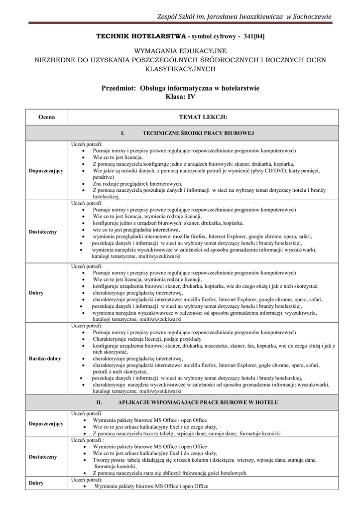 Zespół Szkół im Jarosława Iwaszkiewicza w Sochaczewie TECHNIK HOTELARSTWA - symbol cyfrowy - 341[04] WYMAGANIA EDUKACYJNE NIEZB DNE DO UZYSKANIA POSZCZEGÓLNYCH RÓDROCZNYCH I ROCZNYCH OCEN KLASYFIKACYJNYCH Przedmiot: Obsługa informatyczna w hotelarstwie Klasa: IV Ocena TEMAT LEKCJI: I. Dopuszczaj cy Dostateczny Dobry Bardzo dobry Ucze potrafi: Poznaje normy i przepisy prawne reguluj ce rozpowszechnianie programów komputerowych Wie co to jest licencja, Z pomoc nauczyciela konfiguruje jedno z urz dze biurowych: skaner, drukarka, kopiarka, Wie jakie s no niki danych, z pomoc nauczyciela potrafi je wymienić (płyty CD/DVD, karty pami ci, pendrive) Zna rodzaje przegl darek Internetowych, Z pomoc nauczyciela poszukuje danych i informacji w sieci na wybrany temat dotycz cy hotelu i bran y hotelarskiej, Ucze potrafi: Poznaje normy i przepisy prawne reguluj ce rozpowszechnianie programów komputerowych Wie co to jest licencja, wymienia rodzaje licencji, konfiguruje jedno z urz dze biurowych: skaner, drukarka, kopiarka, wie co to jest przegl darka internetowa, wymienia przegl darki internetowe: mozilla firefox, Internet Explorer, google chrome, opera, safari, poszukuje danych i informacji w sieci na wybrany temat dotycz cy hotelu i bran y hotelarskiej, wymienia narz dzia wyszukiwawcze w zale no ci od sposobu gromadzenia informacji: wyszukiwarki, katalogi tematyczne, multiwyszukiwarki Ucze potrafi: Poznaje normy i przepisy prawne reguluj ce rozpowszechnianie programów komputerowych Wie co to jest licencja, wymienia rodzaje licencji, konfiguruje urz dzenia biurowe: skaner, drukarka, kopiarka, wie do czego słu i jak z nich skorzystać, charakteryzuje przegl dark internetow , charakteryzuje przegl darki internetowe: mozilla firefox, Internet Explorer, google chrome, opera, safari, poszukuje danych i informacji w sieci na wybrany temat dotycz cy hotelu i bran y hotelarskiej, wymienia narz dzia wyszukiwawcze w zale no ci od sposobu gromadzenia informacji: wyszukiwarki, katalogi tematyczne, multiwyszukiwarki Ucze potrafi: Poznaje normy i przepisy prawne reguluj ce rozpowszechnianie programów komputerowych Charakteryzuje rodzaje licencji, podaje przykłady konfiguruje urz dzenia biurowe: skaner, drukarka, niszczarka, skaner, fax, kopiarka, wie do czego słu i jak z nich skorzystać, charakteryzuje przegl dark internetow , charakteryzuje przegl darki internetowe: mozilla firefox, Internet Explorer, gogle chrome, opera, safari, potrafi z nich skorzystać, poszukuje danych i informacji w sieci na wybrany temat dotycz cy hotelu i bran y hotelarskiej, charakteryzuje narz dzia wyszukiwawcze w zale no ci od sposobu gromadzenia informacji: wyszukiwarki, katalogi tematyczne, multiwyszukiwarki II. Dopuszczaj cy Dostateczny Dobry TECHNICZNE RODKI PRACY BIUROWEJ APLIKACJE WSPOMAGAJ CE PRACE BIUROWE W HOTELU Ucze potrafi: Wymienia pakiety biurowe MS Office i open Office Wie co to jest arkusz kalkulacyjny Exel i do czego słu y, Z pomoc nauczyciela tworzy tabel , wpisuje dane, sumuje dane, formatuje komórki Ucze potrafi : Wymienia pakiety biurowe MS Office i open Office Wie co to jest arkusz kalkulacyjny Exel i do czego słu y, Tworzy prosta tabel składaj c si z trzech kolumn i dziesi ciu wierszy, wpisuje dane, sumuje dane, formatuje komórki, Z pomoc nauczyciela stara si obliczyć frekwencj go ci hotelowych Ucze potrafi: Wymienia pakiety biurowe MS Office i open Office Zespół Szkół im Jarosława Iwaszkiewicza w Sochaczewie Bardzo dobry Dopuszczaj cy Dostateczny Dobry Bardzo dobry Dopuszczaj cy Dostateczny Dobry Bardzo dobry Charakteryzuje arkusz kalkulacyjny Exel Tworzy tabel składaj c si z pi ciu kolumn i dwudziestu wierszy, wpisuje dane, sumuje dane, formatuje komórki, wykonać wykres Oblicza frekwencj go ci hotelowych, Analizuje dane. Ucze potrafi: Wymienia i charakteryzuje pakiety biurowe MS Office i open Office Charakteryzuje arkusz kalkulacyjny Ecel Tworzy tabel składaj c si z dziesi ciu kolumn i dwudziestu wierszy, wpisuje dane, sumuje dane, formatuje komórki, wykonać wykres Oblicza frekwencj go ci hotelowych, Analizuje ró nego rodzaju mierniki stosowane w hotelarstwie III. APLIKACJE DO TWORZENIA MATERIAŁÓW REKLAMOWYCH Ucze potrafi: Wie jak wygl da ulotka reklamowa Wie jak wygl da wizytówka przedsi biorstwa hotelowego, Wie jak wygl daj foldery reklamowe przedsi biorstwa hotelowego Z pomoc nauczyciela wykonuje najprostsz składaj c si z pi ciu slajdów prezentacje multimedialn w programie Power point Ucze potrafi: Z pomoc nauczyciela wykonuje ulotk reklamowa, Z pomoc nauczyciela wykonuje wizytówk przedsi biorstwa hotelowego, Z pomoc nauczyciela wykonuje foldery reklamowe przedsi biorstwa hotelowego Z pomoc nauczyciela wykonuje najprostsz składaj c si z dziesi ciu slajdów prezentacje multimedialn w programie Power point na temat „ promocja hotelu” lub promocja usług hotelarskich” Ucze potrafi: wykonuje ulotk reklamowa z logotypem lub elementem graficznym wykonuje wizytówk przedsi biorstwa hotelowego z logotypem lub elementem graficznym, wykonuje foldery reklamowe przedsi biorstwa hotelowego z logotypem lub elementem graficznym, wykonuje prezentacje multimedialn w programie Power point na temat „ promocja hotelu” lub promocja usług hotelarskich” składaj c si z pi tnastu slajdów. Ucze potrafi: wykonuje ulotk reklamowa z logotypem i elementem graficznym wykonuje wizytówk przedsi biorstwa hotelowego z logotypem i elementem graficznym, wykonuje foldery reklamowe przedsi biorstwa hotelowego z logotypem i elementem graficznym, wykonuje prezentacje multimedialn w programie Power point na temat „ promocja hotelu” i „promocja usług hotelarskich” składaj c si z dwudziestu slajdów. IV. RODZAJE DOKUMENTÓW Ucze potrafi: potrafi zaadresować prawidłowo kopert , z pomoc nauczyciela wymienia rodzaje i formy protokołów stosowanych w obiegu dokumentów, wie co to jest CV i list motywacyjny z pomoc nauczyciela sporz dza list motywacyjny lub CV, wymienia rodzaje pism urz 