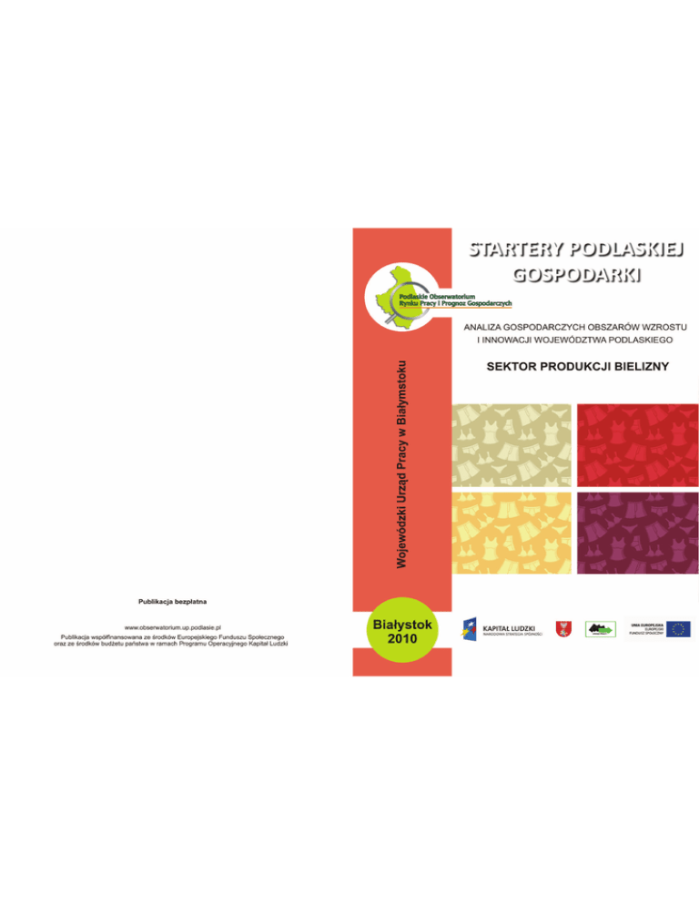 STARTERY PODLASKIEJ GOSPODARKI ANALIZA GOSPODARCZYCH OBSZARÓW WZROSTU I INNOWACJI WOJEWÓDZTWA PODLASKIEGO SEKTOR PRODUKCJI BIELIZNY ZESPÓŁ BADAWCZY prof. nadzw. dr hab. Bogusław Plawgo dr Anna Grabska dr Magdalena Klimczuk mgr Mariusz Citkowski mgr Marta Juchnicka mgr Agnieszka Sosnowicz mgr Justyna Żynel-Etel mgr Kamil Leszko KONSULTACJA Andrzej Kuźmicki ISBN 978-83-62258-11-6 © COPYRIGHT BY WOJEWÓDZKI URZĄD PRACY W BIAŁYMSTOKU BIAŁYSTOK 2010 Badanie zostało przeprowadzone w ramach projektu: „PODLASKIE OBSERWATORIUM RYNKU PRACY I PROGNOZ GOSPODARCZYCH” przez Fundację BFKK współfinansowanego ze środków Europejskiego Funduszu Społecznego w ramach Programu Operacyjnego Kapitał Ludzki, Działanie 8.1 Rozwój pracowników i przedsiębiorstw w regionie, Poddziałanie 8.1.4 Przewidywanie zmiany gospodarczej www.obserwatorium.up.podlasie.pl DRUK: Druk123.pl Wojewódzki Urząd Pracy w Białymstoku Podlaskie Obserwatorium Rynku Pracy i Prognoz Gospodarczych STARTERY PODLASKIEJ GOSPODARKI – SEKTOR PRODUKCJI BIELIZNY Spis treści 1. Koncepcja badania ...................................................................................... 5 1.1. Uzasadnienie badania ........................................................................... 5 1.2. Cele badania ......................................................................................... 7 1.3. Zakres przedmiotowy badania ............................................................. 7 1.4. Obszary analizy .................................................................................... 8 2. Metodologia badań ...................................................................................... 8 3. Charakterystyka sektora ............................................................................ 11 3.1. Stan obecny ........................................................................................ 11 3.2. Produkty ............................................................................................. 15 3.3. Dystrybucja ........................................................................................ 17 3.4. Kierunki rozwoju ............................................................................... 18 4. Popytowo-podażowe zewnętrzne uwarunkowania rozwojowe sektora ..... 20 5. Analiza sił konkurencji w sektorze ............................................................ 21 6. Analiza powiązań sektora z rynkiem pracy ............................................... 24 6.1. Powiązania instytucji rynku pracy z sektorem produkcji bielizny ..... 24 6.2. Analiza dostępności i zapotrzebowania na kadry .............................. 26 6.3. Dominujące w sektorze zawody i kwalifikacje posiadane przez osoby zatrudnione................................................................................................ 29 6.4. Oczekiwania podmiotów sektora w zakresie: umiejętności, kwalifikacji, postaw pracowniczych ......................................................... 30 6.5. Analiza rozwoju kadr pracowniczych ................................................ 30 6.6. Prognozy zmian w zatrudnieniu ......................................................... 31 6.7. Kierunki oddziaływania instytucji na sektor ...................................... 32 6.8. Podsumowanie ................................................................................... 33 7. Analiza SWOT sektora .............................................................................. 35 8. Uwarunkowania i prognozy rozwoju sektora w województwie podlaskim. Rekomendacje ............................................................................................... 37 3 Wojewódzki Urząd Pracy w Białymstoku Podlaskie Obserwatorium Rynku Pracy i Prognoz Gospodarczych STARTERY PODLASKIEJ GOSPODARKI – SEKTOR PRODUKCJI BIELIZNY 8.1. Uwarunkowania rozwoju sektora ....................................................... 37 8.2. Prognozy rozwoju sektora .................................................................. 38 8.3. Strategia rozwoju sektora wynikająca z analizy SWOT .................... 42 8.4. Prognozy rozwoju sektora – wnioski ................................................. 43 8.4.1. Perspektywa średniookresowa (do 5 lat) .................................... 43 8.4.2. Perspektywa długookresowa (powyżej 5 lat) ............................. 44 8.5. Rekomendacje .................................................................................... 45 8.5.1. Rekomendacje dla przedsiębiorstw ............................................ 45 8.5.2. Rekomendacje dla władz regionalnych ...................................... 46 8.5.3. Rekomendacje dla instytucji ...................................................... 47 Słownik pojęć ................................................................................................ 48 Bibliografia ................................................................................................... 50 Spis rysunków ............................................................................................... 51 Spis tabel ....................................................................................................... 51 Spis wykresów .............................................................................................. 51 4 Wojewódzki Urząd Pracy w Białymstoku Podlaskie Obserwatorium Rynku Pracy i Prognoz Gospodarczych STARTERY PODLASKIEJ GOSPODARKI – SEKTOR PRODUKCJI BIELIZNY 1. Koncepcja badania 1.1. Uzasadnienie badania Badanie pn. „STARTERY PODLASKIEJ GOSPODARKI – analiza gospodarczych obszarów wzrostu i innowacji województwa podlaskiego” dotyczy przeprowadzenia badań sektorów w gospodarczych obszarach wzrostu i innowacji województwa podlaskiego i jest ściśle powiązana z realizacją projektu Podlaskie Obserwatorium Rynku Pracy i Prognoz Gospodarczych. Projekt Podlaskie Obserwatorium Rynku Pracy i Prognoz Gospodarczych finansowany