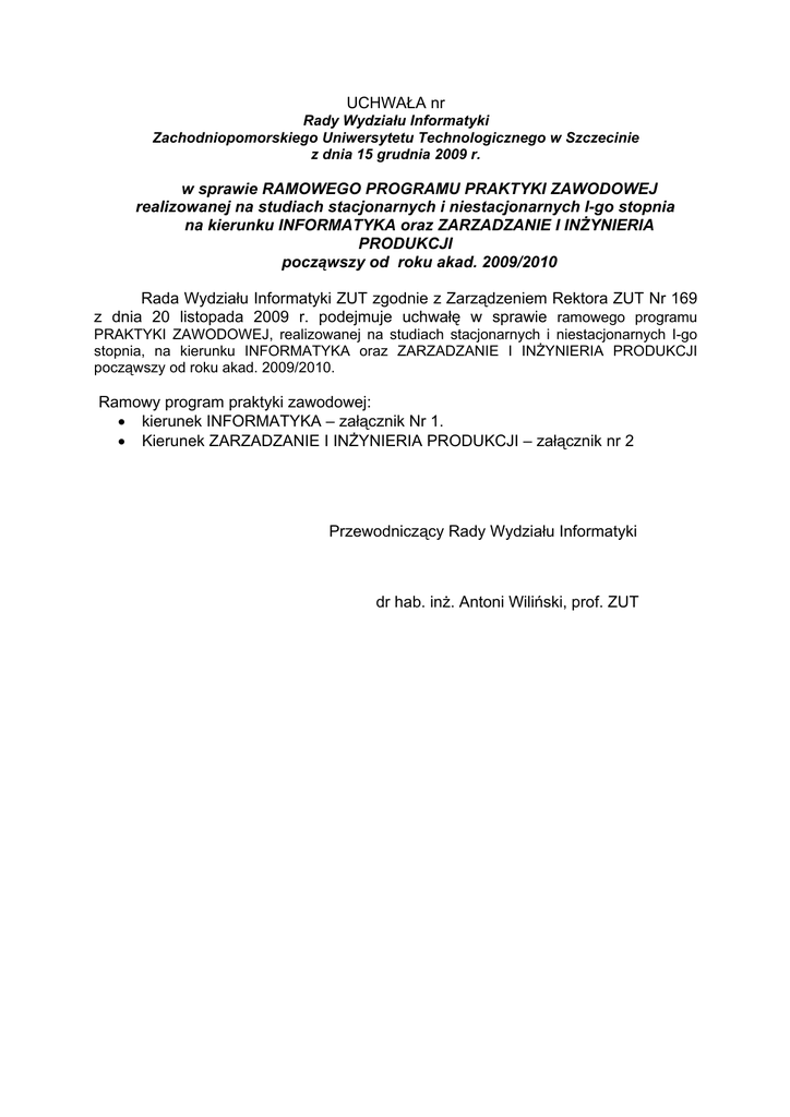 UCHWAŁA nr Rady Wydziału Informatyki Zachodniopomorskiego Uniwersytetu Technologicznego w Szczecinie z dnia 15 grudnia 2009 r. w sprawie RAMOWEGO PROGRAMU PRAKTYKI ZAWODOWEJ realizowanej na studiach stacjonarnych i niestacjonarnych I-go stopnia na kierunku INFORMATYKA oraz ZARZADZANIE I INŻYNIERIA PRODUKCJI począwszy od roku akad. 2009/2010 Rada Wydziału Informatyki ZUT zgodnie z Zarządzeniem Rektora ZUT Nr 169 z dnia 20 listopada 2009 r. podejmuje uchwałę w sprawie ramowego programu PRAKTYKI ZAWODOWEJ, realizowanej na studiach stacjonarnych i niestacjonarnych I-go stopnia, na kierunku INFORMATYKA oraz ZARZADZANIE I INŻYNIERIA PRODUKCJI począwszy od roku akad. 2009/2010. Ramowy program praktyki zawodowej: • kierunek INFORMATYKA – załącznik Nr 1. • Kierunek ZARZADZANIE I INŻYNIERIA PRODUKCJI – załącznik nr 2 Przewodniczący Rady Wydziału Informatyki dr hab. inż. Antoni Wiliński, prof. ZUT Załącznik Nr 1 Ramowy program PRAKTYKI ZAWODOWEJ na kierunku INFORMATYKA (studia stacjonarne i niestacjonarne) Zakres praktyki ZAWODOWE wynikającej z planów studiów i programów nauczania obejmuje jedno z wymienionych poniżej zadań: 1. Prace przeglądowo-konserwacyjne, obsługowe i instalacyjne a) Sieci komputerowych i telekomunikacyjnych, b) Urządzeń komputerowych i peryferyjnych, c) Urządzeń elektronicznych. 2. Prace w zakresie tworzenia i użytkowania oprogramowania: a) Projektowanie oprogramowania, b) Udział w zespołach tworzących oprogramowanie (w tym działalność jednoosobowa), c) Testowanie oprogramowania, d) Tworzenie dokumentacji technicznej dla systemów oprogramowania, e) Wykorzystywanie istniejących aplikacji lub systemów informatycznych f) Wdrażanie aplikacji i systemów. 3. Prace związane z zarządzaniem projektami informatycznymi: a) Zarządzanie lub współ-zarządzanie projektem programistycznym lub sprzętowym, b) Harmonogramowanie prac informatyków biorących udział w projekcie, c) Nabywanie umiejętności obsługi systemów wspomagania zarządzania projektami informatycznymi i innych systemów oprogramowania. 4. Prace badawczo-rozwojowe z zakresu informatyki: a) Udział w projektach badawczo-rozwojowych realizowanych w uczelniach, instytucjach naukowo-badawczych lub innych przedsiębiorstwach realizujących takie zadania, b) Współudział w przygotowywaniu wniosków, studiów wykonalności i innej potrzebnej dokumentacji w ramach projektów badawczo-rozwojowych. Załącznik Nr 2 Ramowy program PRAKTYKI ZAWODOWEJ na kierunku Zarządzanie i Inżynieria Produkcji (studia stacjonarne i niestacjonarne) Zakres praktyki zawodowej wynikającej z planów studiów i programów nauczania obejmuje jedno z wymienionych poniżej zadań: 1. Ogólna charakterystyka podmiotu gospodarczego (status formalno prawny, przedmiot działalności, struktura organizacyjna, zatrudnienie) 2. Specjalizacja podmiotu gospodarczego, asortyment produkcji, stosowane technologie, formy organizacji produkcji. 3. Struktura organizacyjna przedsiębiorstwa. 4. Organizacja pracy przy stanowisku roboczym. 5. Analiza procesu produkcyjnego. 6. Zarządzanie produkcją. 7. Organizacja marketingu i sprzedaży. 8. Zapoznanie się z problematyką zarządzania personelem i wykonywaniem czynności związanych z zarządzaniem zasobami ludzkimi. 9. Organizacja sterowania ekonomicznego. 10. Organizacja i wyposażenie przedsiębiorstwa na potrzeby przetwarzania informatycznego. UCHWAŁA nr Rady Wydziału Informatyki Zachodniopomorskiego Uniwersytetu Technologicznego w Szczecinie z dnia 15 grudnia 2009 r. w sprawie zasad zwalniania i rozliczania praktyki zawodowej na studiach stacjonarnych i niestacjonarnych I-go stopnia na kierunkach INFORMATYKA oraz ZARZĄDZANIE I INŻYNIERIA PRODUKCJI począwszy od roku akademickiego 2009/2010 Rada Wydziału Informatyki ZUT zgodnie z Regulaminem Studiów ZUT (§30 punktu 2) r. ustala, że student studiów stacjonarnych i niestacjonarnych I-go stopnia na kierunkach INFORMATYKA oraz ZARZĄDZANIE I INŻYNIERIA PRODUKCJI, począwszy od roku akademickiego 2009/2010, może ubiegać się po czwartym semestrze studiów I stopnia gdy udokumentuje: − co najmniej półroczne doświadczenie zawodowe (wynikające z umowy o pracę) zgodne z ramowym programem praktyki w okresie dwóch ostatnich lat kalendarzowych, − co najmniej roczne prowadzenie działalności gospodarczej zgodnej z programem praktyki, − uczestnictwo w projekcie realizowanym w ramach współpracy firm z uczelnią (np. projekt PATRONAGE z firmy BLStream Ltd.), − zaliczenie praktyki w ramach innego kierunku studiów o ile programy obu praktyk są zbieżne. Decyzję w sprawie zwolnienia studenta z praktyki zawodowej podejmuje na wniosek studenta Dziekan Wydziału. Przewodniczący Rady Wydziału Informatyki dr hab. inż. Antoni Wiliński, prof. ZUT