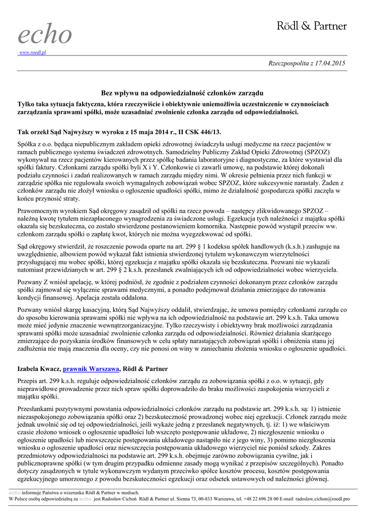 echo www.roedl.pl Rzeczpospolita z 17.04.2015 Bez wpływu na odpowiedzialność członków zarządu Tylko taka sytuacja faktyczna, która rzeczywiście i obiektywnie uniemożliwia uczestniczenie w czynnościach zarządzania sprawami spółki, może uzasadniać zwolnienie członka zarządu od odpowiedzialności. Tak orzekł Sąd Najwyższy w wyroku z 15 maja 2014 r., II CSK 446/13. Spółka z o.o. będąca niepublicznym zakładem opieki zdrowotnej świadczyła usługi medyczne na rzecz pacjentów w ramach publicznego systemu świadczeń zdrowotnych. Samodzielny Publiczny Zakład Opieki Zdrowotnej (SPZOZ) wykonywał na rzecz pacjentów kierowanych przez spółkę badania laboratoryjne i diagnostyczne, za które wystawiał dla spółki faktury. Członkami zarządu spółki byli X i Y. Członkowie ci zawarli umowę, na podstawie której dokonali podziału czynności i zadań realizowanych w ramach zarządu między nimi. W okresie pełnienia przez nich funkcji w zarządzie spółka nie regulowała swoich wymagalnych zobowiązań wobec SPZOZ, które sukcesywnie narastały. Żaden z członków zarządu nie złożył wniosku o ogłoszenie upadłości spółki, mimo że działalność gospodarcza spółki zaczęła w końcu przynosić straty. Prawomocnym wyrokiem Sąd okręgowy zasądził od spółki na rzecz powoda – następcy zlikwidowanego SPZOZ – należną kwotę tytułem niezapłaconego wynagrodzenia za świadczone usługi. Egzekucja tych należności z majątku spółki okazała się bezskuteczna, co zostało stwierdzone postanowieniem komornika. Następnie powód wystąpił przeciw ww. członkom zarządu spółki o zapłatę kwot, których nie można wyegzekwować od spółki. Sąd okręgowy stwierdził, że roszczenie powoda oparte na art. 299 § 1 kodeksu spółek handlowych (k.s.h.) zasługuje na uwzględnienie, albowiem powód wykazał fakt istnienia stwierdzonej tytułem wykonawczym wierzytelności przysługującej mu wobec spółki, której egzekucja z majątku spółki okazała się bezskuteczna. Pozwani nie wykazali natomiast przewidzianych w art. 299 § 2 k.s.h. przesłanek zwalniających ich od odpowiedzialności wobec wierzyciela. Pozwany Z wniósł apelację, w której podniósł, że zgodnie z podziałem czynności dokonanym przez członków zarządu spółki zajmował się wyłącznie sprawami medycznymi, a ponadto podejmował działania zmierzające do ratowania kondycji finansowej. Apelacja została oddalona. Pozwany wniósł skargę kasacyjną, którą Sąd Najwyższy oddalił, stwierdzając, że umowa pomiędzy członkami zarządu co do sposobu kierowania sprawami spółki nie wpływa na ich odpowiedzialność na podstawie art. 299 k.s.h. Taka umowa może mieć jedynie znaczenie wewnątrzorganizacyjne. Tylko rzeczywisty i obiektywny brak możliwości zarządzania sprawami spółki może uzasadniać zwolnienie członka zarządu od odpowiedzialności. Również działania skarżącego zmierzające do pozyskania środków finansowych w celu spłaty narastających zobowiązań spółki i obniżenia stanu jej zadłużenia nie mają znaczenia dla oceny, czy nie ponosi on winy w zaniechaniu złożenia wniosku o ogłoszenie upadłości. Izabela Kwacz, prawnik Warszawa, Rödl & Partner Przepis art. 299 k.s.h. reguluje odpowiedzialność członków zarządu za zobowiązania spółki z o.o. w sytuacji, gdy nieprawidłowe prowadzenie przez nich spraw spółki doprowadziło do braku możliwości zaspokojenia wierzycieli z majątku spółki. Przesłankami pozytywnymi powstania odpowiedzialności członków zarządu na podstawie art. 299 k.s.h. są: 1) istnienie niezaspokojonego zobowiązania spółki oraz 2) bezskuteczność prowadzonej wobec niej egzekucji. Członek zarządu może jednak uwolnić się od tej odpowiedzialności, jeśli wykaże jedną z przesłanek negatywnych, tj. iż: 1) we właściwym czasie złożono wniosek o ogłoszenie upadłości lub wszczęto postępowanie układowe, 2) niezgłoszenie wniosku o ogłoszenie upadłości lub niewszczęcie postępowania układowego nastąpiło nie z jego winy, 3) pomimo niezgłoszenia wniosku o ogłoszenie upadłości oraz niewszczęcia postępowania układowego wierzyciel nie poniósł szkody. Zakres przedmiotowy odpowiedzialności na podstawie art. 299 k.s.h. obejmuje zarówno zobowiązania cywilne, jak i publicznoprawne spółki (w tym drugim przypadku odmienne zasady mogą wynikać z przepisów szczególnych). Ponadto dotyczy zasądzonych w tytule wykonawczym wydanym przeciwko spółce kosztów procesu, kosztów postępowania egzekucyjnego umorzonego z powodu bezskuteczności egzekucji oraz odsetek ustawowych od należności głównej. echo informuje Państwa o wizerunku Rödl & Partner w mediach. W Polsce osobą odpowiedzialną za echo jest Radosław Cichoń Rödl & Partner ul. Sienna 73, 00-833 Warszawa, tel. +48 22 696 28 00 E-mail: [email protected] Osobami odpowiedzialnymi na podstawie art. 299 ks.h. są ci członkowie zarządu, którzy zostali powołani do tej funkcji w sposób zgodny z ustawą i umową spółki oraz którzy pełnili tę funkcję w czasie istnienia zobowiązania, którego egzekucja przeciwko spółce okazała się bezskuteczna. Słusznie Sąd Najwyższy uznał w komentowanym wyroku, że na odpowiedzialność członka zarządu nie ma wpływu umowa łącząca członków zarządu co do sposobu kierowania sprawami spółki czy wewnętrznego podziału czynności między nimi. Taka umowa jest wyłącznie aktem wewnątrzorganizacyjnym i nie może modyfikować (tym bardziej wyłączyć) odpowiedzialności odszkodowawczej członka zarządu na podstawie bezwzględnie obowiązującego przepisu art. 299 k.s.h. Wynika to przede wszystkim z tego, że z mocy art. 20 ust. 2 pkt 2 ustawy – Prawo upadłościowe i naprawcze wniosek o ogłoszenie upadłości może zawsze złożyć każdy członek zarządu. Niewiedza o stanie finansowym, która może wynikać z podziału kompetencji i/lub brak doświadczenia w prowadzen