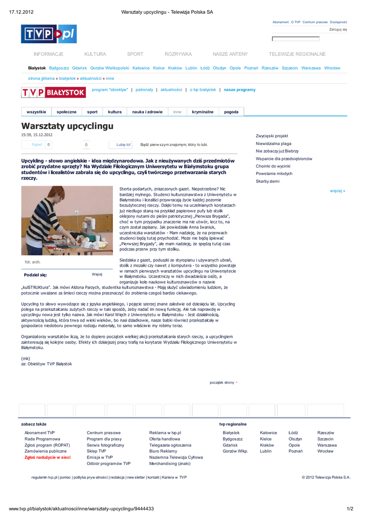 17.12.2012 Warsztaty upcyclingu - Telewizja Polska SA Abonament O TVP Centrum prasowe Dostępność Zaloguj się INFORMACJE KULTURA SPORT ROZRYWKA NASZE ANTENY TELEWIZJE REGIONALNE Białystok Bydgoszcz Gdańsk Gorzów Wielkopolski Katowice Kielce Kraków Lublin Łódź Olsztyn Opole Poznań Rzeszów Szczecin Warszawa Wrocław strona główna » białystok » aktualności » inne program "obiektyw" | patronaty | aktualności | o tvp białystok | nasze programy wszystkie społeczne sport kultura nauka i zdrowie inne kryminalne pogoda Warsztaty upcyclingu 15:39, 15.12.2012 Fajne! 0 Zwycięski projekt 0 Lubię to! Niewidzialna plaga Bądź pierw szym znajomym, który to lubi. Nie zobaczy już Biebrzy Upcykling - słowo angielskie - idea międzynarodowa. Jak z nieużywanych dziś przedmiotów zrobić przydatne sprzęty? Na Wydziale Filologicznym Uniwersytetu w Białymstoku grupa studentów i licealistów zabrała się do upcyclingu, czyli twórczego przetwarzania starych rzeczy. Wsparcie dla przedsiębiorców Choinki do wycinki Powstanie młodych Skarby ziemi Sterta podartych, zniszczonych gazet. Niepotrzebne? Nic bardziej mylnego. Studenci kulturoznawstwa z Uniwersytetu w Białymstoku i licealiści przywracają życie każdej pozornie bezużytecznej rzeczy. Dzięki temu na uczelnianych korytarzach już niedługo staną na przykład papierowe pufy lub stolik oklejony nutami do pieśni patriotycznej „Pierwsza Brygada", choć w tym przypadku znaczenie ma nie utwór, lecz to, na czym został zapisany. Jak powiedziała Anna Iwaniuk, uczestniczka warsztatów - Mam nadzieję, że na przerwach studenci będą tutaj przychodzić. Może nie będą śpiewać „Pierwszej Brygady”, ale mam nadzieję, że spędzą tutaj czas podczas przerw przy tym stoliku. więcej » Siedziska z gazet, poduszki ze styropianu i używanych ubrań, stolik z mozaiki czy nawet z komputera - to wszystko powstaje w ramach pierwszych warsztatów upcyclingu na Uniwersytecie Więcej Podziel się: w Białymstoku. Uczestniczy w nich dwadzieścia osób, a organizuje koło naukowe kulturoznawców o nazwie „kulSTRUKtura”. Jak mówi Aldona Parzych, studentka kulturoznawstwa - Mają służyć uświadomieniu ludziom, że potocznie uważane za śmieci rzeczy można przeznaczyć do zrobienia czegoś bardzo ciekawego. fot. arch. Upcycling to słowo wywodzące się z języka angielskiego, i pojęcie szerzej znane zaledwie od dziesięciu lat. Upcycling polega na przekształcaniu zużytych rzeczy w taki sposób, żeby nadać im nową funkcję. Ale tak naprawdę w upcyclingu nowa jest tylko nazwa. Jak mówi Karol Więch z Uniwersytetu w Białymstoku - Jest działalnością, aktywnością ludzką, która trwa od wieki wieków, bo nasi dziadkowie, nasze babki również przekształcały w gospodarce niedoboru pewnego rodzaju materiały, to samo właściwie my robimy teraz. Organizatorzy warsztatów liczą, że to dopiero początek wielkiej akcji przekształcania starych rzeczy, a upcyclingiem zainteresują się kolejne osoby. Efekty ich dzisiejszej pracy trafią na korytarze Wydziału Filologicznego Uniwersytetu w Białymstoku. (mk) za: Obiektyw TVP Białystok początek strony ^ zobacz także tvp regionalne Abonament TVP Rada Programowa Centrum prasowe Program dla prasy Reklama w tvp.pl Oferta handlowa Białystok Bydgoszcz Katowice Kielce Łódź Olsztyn Rzeszów Szczecin Zgłoś program (ROPAT) Zamówienia publiczne Zgłoś nadużycie w sieci Serwis fotograficzny Sklep TVP Emisja w TVP Telegazeta ogłoszenia Biuro Reklamy Naziemna Telewizja Cyfrowa Gdańsk Gorzów Wlkp. Kraków Lublin Opole Poznań Warszawa Wrocław Odbiór programów TVP Merchandising (znaki) regulamin tvp.pl | pomoc | polityka pryw atności | redakcja | new sletter | kontakt | Kariera w TVP www.tvp.pl/bialystok/aktualnosci/inne/warsztaty-upcyclingu/9444433 © 2012 Telew izja Polska S.A. 1/2