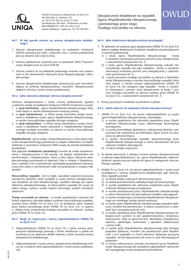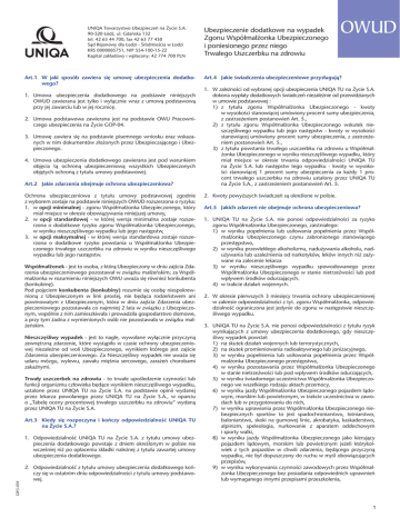 UNIQA Towarzystwo Ubezpieczeñ na ¯ycie S.A. 90-520 £ódŸ, ul. Gdañska 132 tel. 42 63 44 700, fax 42 63 77 430 S¹d Rejonowy dla £odzi - Œródmieœcia w £odzi KRS 0000005751, NIP 554-100-15-22 Kapita³ zak³adowy i wp³acony: 42 774 700 PLN Art.1 W jaki sposób zawiera się umowę ubezpieczenia dodatkowego? 1. Umowa ubezpieczenia dodatkowego na podstawie niniejszych OWUD zawierana jest tylko i wyłącznie wraz z umową podstawową przy jej zawarciu lub w jej rocznicę. 2. Umowa podstawowa zawierana jest na podstawie OWU Pracowniczego ubezpieczenia na Życie GOP-04. 3. Umowę zawiera się na podstawie pisemnego wniosku oraz wskazanych w nim dokumentów złożonych przez Ubezpieczającego i Ubezpieczonego. 4. Umowa ubezpieczenia dodatkowego zawierana jest pod warunkiem objęcia tą ochroną ubezpieczeniową wszystkich Ubezpieczonych objętych ochroną z tytułu umowy podstawowej. Art.2 Jakie zdarzenia obejmuje ochrona ubezpieczeniowa? Ochrona ubezpieczeniowa z tytułu umowy podstawowej zgodnie z wyborem zostaje na podstawie niniejszych OWUD rozszerzona o ryzyka: 1.w opcji minimalnej - zgonu Współmałżonka Ubezpieczonego, który miał miejsce w okresie obowiązywania niniejszej umowy, 2.w opcji standardowej - w której wersja minimalna zostaje rozszerzona o dodatkowe ryzyko zgonu Współmałżonka Ubezpieczonego, w wyniku nieszczęśliwego wypadku lub jego następstw, 3.w opcji maksymalnej - w której wersja standardowa zostaje rozszerzona o dodatkowe ryzyko powstania u Współmałżonka Ubezpieczonego trwałego uszczerbku na zdrowiu w wyniku nieszczęśliwego wypadku lub jego następstw. Współmałżonek - jest to osoba, z którą Ubezpieczony w dniu zajścia Zdarzenia ubezpieczeniowego pozostawał w związku małżeńskim; za Współmałżonka w rozumieniu niniejszych OWU uważa się również konkubenta (konkubinę). Pod pojęciem konkubenta (konkubiny) rozumie się osobę niespokrewnioną z Ubezpieczonym w linii prostej, nie będąca rodzeństwem ani powinowatym z Ubezpieczonym, która w dniu zajścia Zdarzenia ubezpieczeniowego pozostawała co najmniej 2 lata w związku z Ubezpieczonym, wspólnie z nim zamieszkiwała i prowadziła gospodarstwo domowe, a przy tym żadna z wymienionych osób nie pozostawała w związku małżeńskim. Nieszczęśliwy wypadek - jest to nagłe, wywołane wyłącznie przyczyną zewnętrzną zdarzenie, które wystąpiło w czasie ochrony ubezpieczeniowej niezależne od woli Ubezpieczonego, wynikiem którego jest zajście Zdarzenia ubezpieczeniowego. Za Nieszczęśliwy wypadek nie uważa się udaru mózgu, wylewu, zawału mięśnia sercowego, zarażeń chorobami zakaźnymi. Trwały uszczerbek na zdrowiu - to trwałe upośledzenie czynności lub funkcji organizmu człowieka będące wynikiem nieszczęśliwego wypadku, ustalone przez UNIQA TU na Życie S.A. na podstawie opinii wydanej przez lekarza powołanego przez UNIQA TU na Życie S.A., w oparciu o „Tabelę oceny procentowej trwałego uszczerbku na zdrowiu” wydaną przez UNIQA TU na Życie S.A. Art.3 Kiedy się rozpoczyna i kończy odpowiedzialność UNIQA TU na Życie S.A.? GWS-004 1. Odpowiedzialność UNIQA TU na Życie S.A. z tytułu umowy ubezpieczenia dodatkowego powstaje z dniem określonym w polisie nie wcześniej niż po opłaceniu składki należnej z tytułu zawartej umowy ubezpieczenia dodatkowego. 2. Odpowiedzialność z tytułu umowy ubezpieczenia dodatkowego kończy się w ostatnim dniu odpowiedzialności z tytułu umowy podstawowej. Ubezpieczenie dodatkowe na wypadek Zgonu Współmałżonka Ubezpieczonego i poniesionego przez niego Trwałego Uszczerbku na zdrowiu OWUD Art.4 Jakie świadczenia ubezpieczeniowe przysługują? 1. W zależności od wybranej opcji ubezpieczenia UNIQA TU na Życie S.A. dokona wypłaty dodatkowych świadczeń niezależnie od przewidzianych w umowie podstawowej : 1) z tytułu zgonu Współmałżonka Ubezpieczonego - kwoty w wysokości stanowiącej umówiony procent sumy ubezpieczenia, z zastrzeżeniem postanowień Art. 5., 2) z tytułu zgonu Współmałżonka Ubezpieczonego wskutek nieszczęśliwego wypadku lub jego następstw - kwoty w wysokości stanowiącej umówiony procent sumy ubezpieczenia, z zastrzeżeniem postanowień Art. 5., 3) z tytułu powstania trwałego uszczerbku na zdrowiu u Współmałżonka Ubezpieczonego w wyniku nieszczęśliwego wypadku, który miał miejsce w okresie trwania odpowiedzialności UNIQA TU na Życie S.A. lub następstw tego wypadku - kwoty w wysokości stanowiącej 1 procent sumy ubezpieczenia za każdy 1 procent trwałego uszczerbku na zdrowiu ustalony przez UNIQA TU na Życie S.A., z zastrzeżeniem postanowień Art. 5. 2. Kwoty powyższych świadczeń są określone w polisie. Art.5 Jakich zdarzeń nie obejmuje ochrona ubezpieczeniowa? 1. UNIQA TU na Życie S.A. nie ponosi odpowiedzialności za ryzyko zgonu Współmałżonka Ubezpieczonego, zaistniałego: 1) w wyniku popełnienia lub usiłowania popełnienia przez Współmałżonka Ubezpieczonego czynu zabronionego stanowiącego przestępstwo, 2) w wyniku przewlekłego alkoholizmu, nadużywania alkoholu, nadużywania lub uzależnienia od narkotyków, leków innych niż zażywane na zalecenie lekarza 3) w wyniku nieszczęśliwego wypadku spowodowanego przez Współmałżonka Ubezpieczonego w stanie nietrzeźwości lub pod wpływem środków odurzających. 4) w trakcie działań wojennych. 2. W okresie pierwszych 3 miesięcy trwania ochrony ubezpieczeniowej w zakresie odpowiedzialności z tyt. zgonu Współmałżonka, odpowiedzialność ograniczona jest jedynie do zgonu w następstwie nieszczęśliwego wypadku. 3. UNIQA TU na Życie S.A. nie ponosi odpowiedzialności z tytułu ryzyk wynikających z umowy ubezpieczenia dodatkowego, gdy nieszczęśliwy wypadek powstał: 1) na skutek działań wojennych lub terrorystycznych, 2) na skutek promieniowania radioaktywnego lub jonizacyjnego, 3) w wyniku popełnienia lub usiłowania popełnienia przez Współmałżonka Ubezpiec