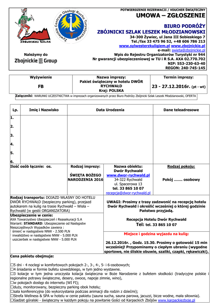 POTWIERDZENIE REZERWACJI / VOUCHER ŚWIĄTECZNY UMOWA – ZGŁOSZENIE BIURO PODRÓŻY ZBÓJNICKI SZLAK LESZEK MŁODZIANOWSKI 34-300 Żywiec, ul Jana III Sobieskiego 7 Tel./fax 33 475 96 52, +48 606 786 213 www.sylwesterzkuligiem.pl www.zbojnickie.pl e-mail: [email protected] Wpis do Rejestru Organizatorów Turystyki nr 944 Nr gwarancji ubezpieczeniowej w TU i R S.A. AXA 02.770.702 NIP: 553-230-63-40 REGON: 240-745-145 Należymy do Wyżywienie Nazwa imprezy: Pakiet świąteczny w hotelu DWÓR RYCHWAŁD Kraj: POLSKA FB Termin imprezy: 23 - 27.12.2016r. (pt - wt) Załączniki: WARUNKI UCZESTNICTWA w imprezach organizowanych przez Biuro Podróży Zbójnicki Szlak Leszek Młodzianowski, OFERTA Lp. Imię i Nazwisko Data Urodzenia Dane teleadresowe 1. 2. 3. 4. 5. 6. Ilość osób łącznie: os. Rodzaj imprezy: Nazwa obiektu: Rodzaj pokoju: Dwór Rychwałd ŚWIĘTA BOŻEGO www.dwor-rychwald.pl NARODZENIA 2016 34-322 Rychwałd Pokój ……. osobowy ul. Spacerowa 13 tel. 33 865 10 07 [email protected] Rodzaj transportu: DOJAZD WŁASNY DO HOTELU DWÓR RYCHWAŁD (bezpieczny parking), przejazd UWAGI: Prosimy z trasy zadzwonić na recepcję hotelu autokarem na kulig na trasie Rychwałd – Wisła – Dwór Rychwałd i określić wcześniej o której godzinie Rychwałd (w gestii ORGANIZATORA) Państwo przyjadą. Ubezpieczenie w cenie: AXA Towarzystwo Ubezpieczeń i Reasekuracji S.A Recepcja Hotelu Dwór Rychwałd Wariant: STANDARD: Ubezpieczenie od Następstw Tel: tel. 33 865 10 07 Nieszczęśliwych Wypadków zawiera : · śmierć w następstwie NNW - 2.500 PLN · inwalidztwo w następstwie NNW - 5.000 PLN · uszczerbek w następstwie NNW - 5.000 PLN Miejsce i godzina wyjazdu na kulig: 26.12.2016r. , Godz. 15.30. Prosimy o gotowość 15 min wcześniej! Przypominamy o ciepłym ubraniu (wygodne sportowe, nie śliskie obuwie, szaliki, czapki, rękawiczki). Cena pakietu obejmuje: 5 dni - 4 noclegi w komfortowych pokojach 2-, 3-, 4-, 5- i 6-osobowych; 4 śniadania w formie bufetu szwedzkiego, w tym jedno wystawne. 3 kolacje w tym jedna uroczysta kolacja świąteczna w Boże Narodzenie z bufetem słodkości (tradycyjne polskie i regionalne potrawy świąteczne, desery, owoce, napoje zimnie, wino), w pokojach dostęp do internetu (WI FI); duży, monitorowany, bezpieczny parking obok hotelu; sala konferencyjna (do wykorzystania podczas animacji dla rodzin z dziećmi); Strefa Wellness & SPA w hotelu w cenie pakietu (sauna sucha, sauna parowa, jacuzzi, bicze wodne, mała siłownia). Gadżet góralski - świąteczny w każdym pokoju na powitanie Gości od Karpackich Zbójów www.karpackiezboje.pl Góralski kulig z pochodniami z góralskim jadłem i napitkiem, z kapelą góralską Karpackie Zbóje w Wiśle www.janosik.info Transport komfortowym autokarem na kulig świąteczny na trasie hotel Dwór Rychwałd - Wisła – hotel Dwór Rychwałd Występ gawędziarza - multiinstrumentalisty - Jacentego Ignatowicza - finalisty programu Mam Talent z TVN www.jacentyignatowicz.pl Warsztaty świąteczne z animatorami dla rodzin z dziećmi m.in. z bibułkarstwa ludowego i robienia tzw. światów z opłatków i ozdób świątecznych; Zwiedzanie Żywca z licencjonowanym przewodnikiem beskidzkim www.karpackigazda.pl Ubezpieczenie na cały pobyt świąteczny w towarzystwie ubezpieczeniowym Axa (prosimy o podanie danych do ubezpieczenia: imię i nazwisko, data urodzenia i adres zamieszkania); Podatek Vat; Program pakietu Bożonarodzeniowego w Dworze Rychwałd I dzień 23.12.2016r. (piątek) 899 zł / os. dorosła!!! Cena dla dzieci: Godz. 15.00 / 19.00 Przyjazd do hotelu / zakwaterowanie (uwaga w pokojach czeka Was góralski, świąteczny upominek od Karpackich Zbójów – w mojej gestii); Godz. 15.00 – 17:00 możliwy regionalny dwudaniowy obiad - dodatkowo płatny w restauracji hotelowej (a la'carte - szeroki wybór dań regionalnych. Ceny od 25 zł / porcja – każdy sobie indywidualnie zamawia u was w restauracji). Godz. 19:30 – 20:30 kolacja regionalna NIESPODZIANKA REGIONALNA Cena za pakiet ogółem: zimna płyta + 2 dania gorące + Nocleg II dzień 24.12.2016r. (sobota) Godz.9:00 – 10:00 śniadanie regionalne w formie bufetu szwedzkiego Godz.10:00 – 12:00 poranek zapoznawczy dla rodzin i dzieci - wspólne ubieranie choinki przy kolędach góralskich i pastorałkach oraz warsztaty Bożonarodzeniowe dla rodzin z dziećmi (świąteczne ozdoby bibułkowe, ozdoby z opłatków świątecznych tzw. światy - kule z opłatków, bibułkowe kwiatuszki, ozdoby bibułkowe na choinkę - aniołki, łańcuchy, koszyczki, pajączki) Godz.12:00 – 15:00 czas wolny (możliwość spacerów po parku wokół hotelu, odwiedzenie sanktuarium maryjnego z cudownym obrazem Matki Bożej Rychwałdzkiej, przejazd swoimi samochodami do centrum Żywca / zakupy / indywidualne zwiedzanie miasta / możliwość skorzystania ze SPA hotelowego (jacuzzi, sauna, bicze wodne, mała siłownia). Cena dla dzieci: do 3 lat - gratis (bez świadczeń, wspólne spanie z rodzicami), dzieci od 3 - 13 lat – cena 699 zł / os. Dodatkowy osobodzień ze śniadaniem (osoba dorosła 70 zł, dziecko do 13 lat – 65 zł) Opcja dodatkowego osobodnia z pełnym wyżywieniem (śniadanie, obiad, kolacja) osoba dorosła 110 zł, dziecko do 13 lat 100 zł. Dopłata za korzystanie 1 osoby z pokoju 2 osobowego 50% wartości pakietu czyli 575 zł. Dopłata za apartament 30 zł / os. doba Opłata za psa 20 zł / doba. Masz pytanie: Godz.12:00 – 15:00 – możliwość zamówienia indywidualnie obiadu z karty menu. Ceny od 25 zł / porcja. Obsługa klienta Zbójnickie Group: +48 606 786 213 +48 537 799 001 Godz. 17:00 Uroczysta kolacja Wigilijna z kolędami i pastorałkami (tradycyjne polskie i regionalne potrawy świąteczne, desery, owoce, napoje zimnie, wino) Wyślij e-mail: [email protected] Menu: żur z grzybami, grzybowa, ryba: karp, dorsz, amur, kapusta zasmażana z fasolą, surówka z kapusty kiszonej, ziemniaki zasmażane, ziemniaki puree, pierogi z kapustą, kompot z