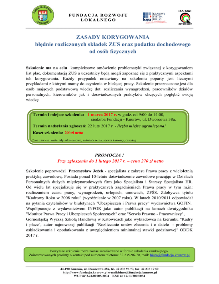ISO 9001 FUNDACJA ROZWOJU LOKALNEGO ZETOM-CERT ZASADY KORYGOWANIA błędnie rozliczonych składek ZUS oraz podatku dochodowego od osób fizycznych Szkolenie ma na celu kompleksowe omówienie problematyki związanej z korygowaniem list płac, dokumentacją ZUS a uczestnicy będą mogli zapoznać się z praktycznymi aspektami ich korygowania. Każdy przypadek omawiany na szkoleniu poparty jest licznymi przykładami z którymi mamy do czynienia w bieżącej pracy. Szkolenie przeznaczone jest dla osób mających podstawową wiedzę dot. rozliczania wynagrodzeń, pracowników działów personalnych, kierowników jak i doświadczonych praktyków chcących pogłębić swoją wiedzę. Termin i miejsce szkolenia: 1 marca 2017 r. w godz. od 9:00 do 14:00, siedziba Fundacji - Knurów, ul. Dworcowa 38a. Termin nadsyłania zgłoszeń: 22 luty 2017 r. - liczba miejsc ograniczona! Koszt szkolenia: 290 zł netto Cena zawiera: materiały szkoleniowe, zaświadczenia, serwis kawowy, catering PROMOCJA ! Przy zgłoszeniu do 1 lutego 2017 r. – cena 270 zł netto Szkolenie poprowadzi Przemysław Jeżek - specjalista z zakresu Prawa pracy z wieloletnią praktyką zawodową. Posiada ponad 10-letnie doświadczenie zawodowe pracując w Działach Personalnych dużych międzynarodowych firm jako Specjalista i Starszy Specjalista HR. Od wielu lat specjalizuje się w praktycznych zagadnieniach Prawa pracy w tym m.in: rozliczaniem czasu pracy, wynagrodzeń, urlopach, umowach, ZFŚS. Zdobywca tytułu "Kadrowy Roku w 2008 roku" (wyróżnienie w 2007 roku). W latach 2010/2011 odpowiadał na pytania czytelników w biuletynach "Ubezpieczeń i Prawa pracy" wydawnictwa GOFIN. Współpracuje z wydawnictwem INFOR jako autor publikacji na łamach dwutygodnika "Monitor Prawa Pracy i Ubezpieczeń Społecznych" oraz "Serwis Prawno - Pracowniczy", Górnośląską Wyższą Szkołą Handlową w Katowicach jako wykładowca na kierunku "Kadry i płace", autor najnowszej publikacji "Rozliczanie umów zlecenia i o dzieło - problemy oskładkowania i opodatkowania z uwzględnieniem minimalnej stawki godzinowej" ODDK 2017 r. Powyższe szkolenie może zostać zrealizowane w formie szkolenia zamkniętego. Zainteresowanych prosimy o kontakt pod numerem telefonu: 32 235-96-70, mail: [email protected] 44-190 Knurów, ul. Dworcowa 38a, tel. 32 235 96 70, fax 32 235 19 50 http://www.fundacja.knurow.pl e-mail:[email protected] WUP nr 2.24/00005/2004 KSU nr 12/13/2005/084 ISO 9001 FUNDACJA ROZWOJU LOKALNEGO ZETOM-CERT Program szkolenia: 1. Korekta dokumentów ZUS oraz list płac w związku z błędnym ustaleniem obowiązku ubezpieczeń społecznych z umów cywilnoprawnych: a. zbieg tytułów do ubezpieczeń społecznych, b. wykonywanie prac na podstawie umowy zlecenia w trakcie urlopu wychowawczego bądź urlopu bezpłatnego, c. niezdolność do pracy zleceniobiorcy, d. umowa zlecenia zawarta z uczniem bądź studentem, e. rozliczenie składek oraz podatku z umowy cywilnoprawnej zawartej z własnym pracownikiem lub wykonywanej na rzecz własnego pracodawcy. 2. Korekta błędnie rozliczonych umów cywilnoprawnych składki ZUS oraz zaliczka na podatek dochodowy: a. zakwalifikowanie umowy zlecenia jako umowy o pracę, b. zakwalifikowanie umowy o dzieło jako umowy zlecenia, c. zmiana tytułu do ubezpieczeń w trakcie miesiąca kalendarzowego, d. zwrot składek w danym roku kalendarzowym przez pracownika / zleceniobiorcę skutki w podatku dochodowym, e. zwrot składek w następnym roku kalendarzowym przez pracownika / zleceniobiorcę skutki w podatku dochodowym. 3. Rozliczenie błędnie wypłaconego wynagrodzenia: a. zwrot nienależnie wypłaconego wynagrodzenia przez pracownika, b. częściowy zwrot przez pracownika wynagrodzenia w danym roku kalendarzowym, c. korygowanie nadpłaconego wynagrodzenia, d. nadpłata / niedopłata podatku dochodowego od osób fizycznych – korekta deklaracji PIT. 44-190 Knurów, ul. Dworcowa 38a, tel. 32 235 96 70, fax 32 235 19 50 http://www.fundacja.knurow.pl e-mail:[email protected] WUP nr 2.24/00005/2004 KSU nr 12/13/2005/084 ISO 9001 FUNDACJA ROZWOJU LOKALNEGO ZETOM-CERT 4. Ograniczenie rocznej podstawy składek emerytalno – rentowych: a. skutki błędnie złożonego oświadczenia – niedopłata składek, b. zwrot nadpłaconej składki na ubezpieczenie zdrowotne, c. zwrot nadpłaconych składek dla pracownika, d. zapłata za pracownika / byłego pracownika zaległych składek – skutki w podatku dochodowym, e. zwrot składek przez byłego pracownika w danym roku kalendarzowym i w latach następnych, f. korekta podstawy wynagrodzenia / zasiłków z ubezpieczenia społecznego, g. korekta dokumentów rozliczeniowych do ZUS, h. przekroczenie rocznej podstawy składek osób przebywających na urlopach macierzyńskich i wychowawczych. 5. Korekta składek za pracowników na urlopach macierzyńskich i wychowawczych: a. prawidłowe ustalenie podstawy wymiaru składek osób przebywających na urlopie wychowawczym, b. korekta składek w przypadku wykonywania pracy na urlopie wychowawczym. 6. Pozostałe zagadnienia: a. korekta składek ZUS i podatku dochodowego od świadczeń nienależnych z ZFŚS, b. uznanie zdarzenia jako wypadek przy pracy – korekta składek i podatku dochodowego, c. korekta dokumentów ZUS w związku z nadpłatą zasiłku chorobowego, d. korekta nadpłaconego zasiłku macierzyńskiego w związku ze złożeniem jednorazowego wniosku o wykorzystanie urlopu rodzicielskiego w pełnym wymiarze, e. korekta składek ZUS i podatku dochodowego po wyroku Trybunału Konstytucyjnego z 08 lipca 2014 r. 44-190 Knurów, ul. Dworcowa 38a, tel. 32 235 96 70, fax 32 235 19 50 http://www.fundacja.knurow.pl e-mail:[email protected] WUP nr 2.24/00005/2004 KSU nr 12/13/2005/084 ISO 9001 FUNDACJA ROZWOJU LOKALNEGO ZETOM-CERT FORMULARZ ZGŁOSZENIOWY Niniejszym zgłaszam udział w szkoleniu z zakresu: Zasady korygowania błędnie rozliczonych składek ZUS oraz podatku dochodowego od osób fizycznych Imię i Nazwisko: Stanowi
