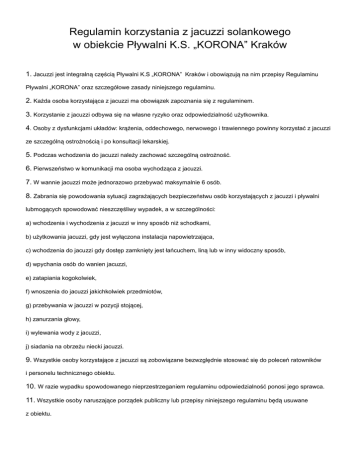 Regulamin korzystania z jacuzzi solankowego w obiekcie Pływalni K.S. „KORONA” Kraków 1. Jacuzzi jest integralną częścią Pływalni K.S „KORONA” Kraków i obowiązują na nim przepisy Regulaminu Pływalni „KORONA” oraz szczegółowe zasady niniejszego regulaminu. 2. Każda osoba korzystająca z jacuzzi ma obowiązek zapoznania się z regulaminem. 3. Korzystanie z jacuzzi odbywa się na własne ryzyko oraz odpowiedzialność użytkownika. 4. Osoby z dysfunkcjami układów: krążenia, oddechowego, nerwowego i trawiennego powinny korzystać z jacuzzi ze szczególną ostrożnością i po konsultacji lekarskiej. 5. Podczas wchodzenia do jacuzzi należy zachować szczególną ostrożność. 6. Pierwszeństwo w komunikacji ma osoba wychodząca z jacuzzi. 7. W wannie jacuzzi może jednorazowo przebywać maksymalnie 6 osób. 8. Zabrania się powodowania sytuacji zagrażających bezpieczeństwu osób korzystających z jacuzzi i pływalni lubmogących spowodować nieszczęśliwy wypadek, a w szczególności: a) wchodzenia i wychodzenia z jacuzzi w inny sposób niż schodkami, b) użytkowania jacuzzi, gdy jest wyłączona instalacja napowietrzająca, c) wchodzenia do jacuzzi gdy dostęp zamknięty jest łańcuchem, liną lub w inny widoczny sposób, d) wpychania osób do wanien jacuzzi, e) zatapiania kogokolwiek, f) wnoszenia do jacuzzi jakichkolwiek przedmiotów, g) przebywania w jacuzzi w pozycji stojącej, h) zanurzania głowy, i) wylewania wody z jacuzzi, j) siadania na obrzeżu niecki jacuzzi. 9. Wszystkie osoby korzystające z jacuzzi są zobowiązane bezwzględnie stosować się do poleceń ratowników i personelu technicznego obiektu. 10. W razie wypadku spowodowanego nieprzestrzeganiem regulaminu odpowiedzialność ponosi jego sprawca. 11. Wszystkie osoby naruszające porządek publiczny lub przepisy niniejszego regulaminu będą usuwane z obiektu.
