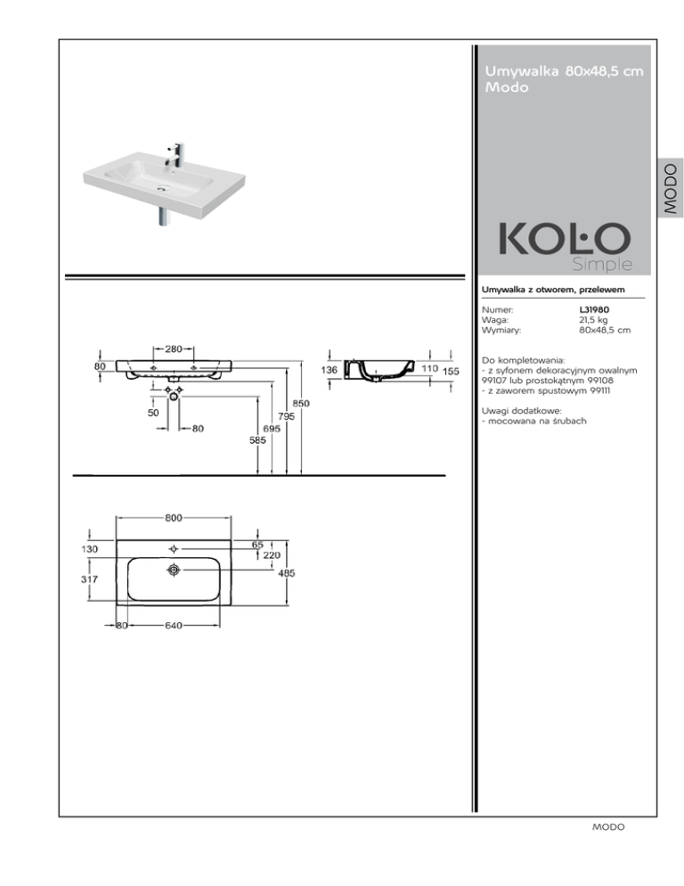 MODO Umywalka 80x48,5 cm Modo Umywalka z otworem, przelewem ________________________________ Numer: Waga: Wymiary: L31980 21,5 kg 80x48,5 cm Do kompletowania: - z syfonem dekoracyjnym owalnym 99107 lub prostokątnym 99108 - z zaworem spustowym 99111 Uwagi dodatkowe: - mocowana na śrubach MODO