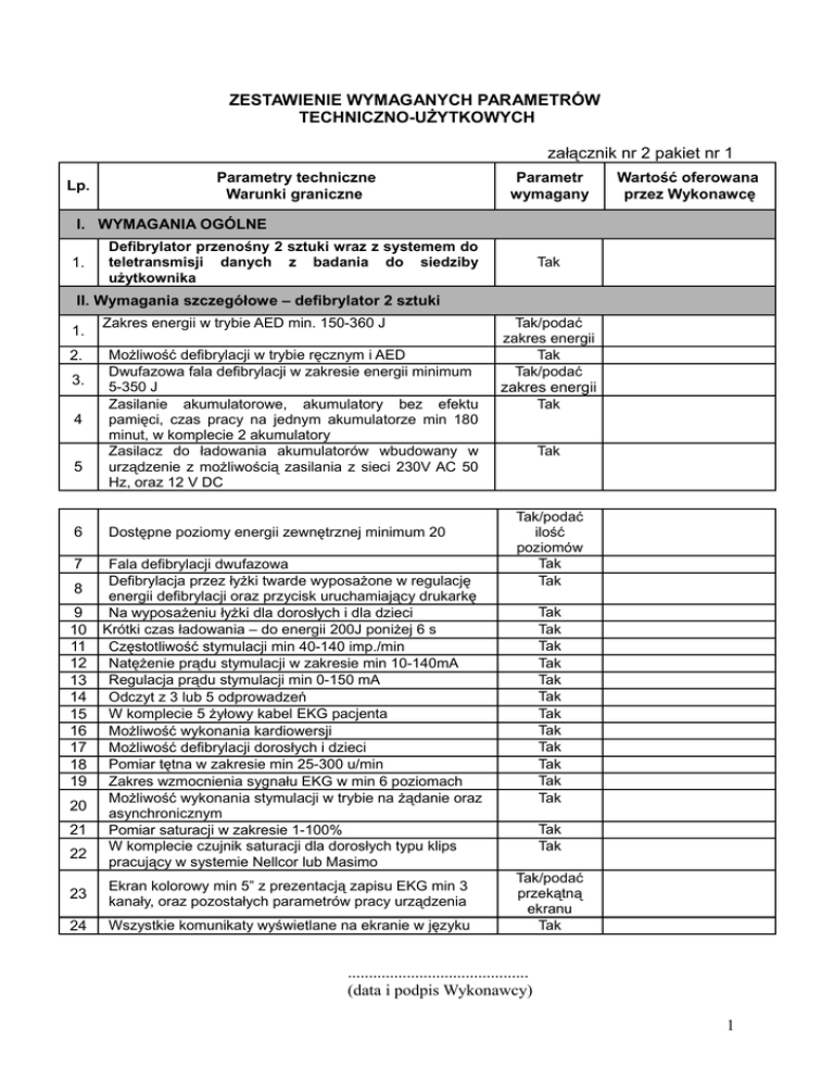 ZESTAWIENIE WYMAGANYCH PARAMETRÓW TECHNICZNO-UŻYTKOWYCH załącznik nr 2 pakiet nr 1 Lp. Parametry techniczne Warunki graniczne Parametr wymagany Wartość oferowana przez Wykonawcę I. WYMAGANIA OGÓLNE 1. Defibrylator przenośny 2 sztuki wraz z systemem do teletransmisji danych z badania do siedziby użytkownika Tak II. Wymagania szczegółowe – defibrylator 2 sztuki 1. 2. 3. 4 5 6 7 8 9 10 11 12 13 14 15 16 17 18 19 20 21 22 Zakres energii w trybie AED min. 150-360 J Możliwość defibrylacji w trybie ręcznym i AED Dwufazowa fala defibrylacji w zakresie energii minimum 5-350 J Zasilanie akumulatorowe, akumulatory bez efektu pamięci, czas pracy na jednym akumulatorze min 180 minut, w komplecie 2 akumulatory Zasilacz do ładowania akumulatorów wbudowany w urządzenie z możliwością zasilania z sieci 230V AC 50 Hz, oraz 12 V DC Dostępne poziomy energii zewnętrznej minimum 20 Fala defibrylacji dwufazowa Defibrylacja przez łyżki twarde wyposażone w regulację energii defibrylacji oraz przycisk uruchamiający drukarkę Na wyposażeniu łyżki dla dorosłych i dla dzieci Krótki czas ładowania – do energii 200J poniżej 6 s Częstotliwość stymulacji min 40-140 imp./min Natężenie prądu stymulacji w zakresie min 10-140mA Regulacja prądu stymulacji min 0-150 mA Odczyt z 3 lub 5 odprowadzeń W komplecie 5 żyłowy kabel EKG pacjenta Możliwość wykonania kardiowersji Możliwość defibrylacji dorosłych i dzieci Pomiar tętna w zakresie min 25-300 u/min Zakres wzmocnienia sygnału EKG w min 6 poziomach Możliwość wykonania stymulacji w trybie na żądanie oraz asynchronicznym Pomiar saturacji w zakresie 1-100% W komplecie czujnik saturacji dla dorosłych typu klips pracujący w systemie Nellcor lub Masimo 23 Ekran kolorowy min 5” z prezentacją zapisu EKG min 3 kanały, oraz pozostałych parametrów pracy urządzenia 24 Wszystkie komunikaty wyświetlane na ekranie w języku Tak/podać zakres energii Tak Tak/podać zakres energii Tak Tak Tak/podać ilość poziomów Tak Tak Tak Tak Tak Tak Tak Tak Tak Tak Tak Tak Tak Tak Tak Tak Tak/podać przekątną ekranu Tak ........................................... (data i podpis Wykonawcy) 1 25 26 27 28 29 30 31 polskim System alarmów akustycznych i optycznych informujących o częstości akcji serca oraz nieprawidłowym działaniu urządzenia Autotest urządzenia z możliwością wydruku wyniku Wbudowana drukarka termiczna, wydruk na papierze o szerokości min 50mm Pamięć wewnętrzna zapisująca rejestrowane zdarzenia Możliwość rozbudowy o moduł wi-fi z możliwością współpracy z systemem teletransmisji Możliwość rozbudowy o moduł pomiaru EtO2, Niska waga urządzenia ułatwiająca jego przenoszenie max 7 kg 32 W komplecie torba do przenoszenia urządzenia. System teletransmisji danych W siedzibie użytkownika zainstalowany system odbioru 1 danych z defibrylatorów Instalacja systemu na komputerze PC wskazanym przez 2 użytkownika Możliwość archiwizacji oraz wydruku przesłanych badań 3 4 Licencja na system min 4 lata Tak Tak Tak/podać szerokość papieru Tak Tak Tak Tak/podać wagę urządzenia Tak Tak Tak Tak Tak/podać na ile lat licencja III. WARUNKI GWARANCJI I SERWISU Gwarancja na urządzenie (liczona od dnia dokonania odbioru przedmiotu zamówienia) minimum 36 miesięcy. W czasie trwania gwarancji wszystkie wymagane przeglądy wykonywane bezpłatnie na koszt dostawcy włącznie z 2. dojazdem. IV. POZOSTAŁE Zasilanie dostosowane do 230 V 50 Hz oraz 12 V DC 1. Rok produkcji 2015, wszystkie elementy składowe 2. fabrycznie nowe 3 Założenie i wypełnienie paszportu technicznego Gwarancja dostępności części zamiennych przez okres min. 4 10 lat Instrukcja obsługi w języku polskim w wersji papierowej oraz 5 elektronicznej- dostarczyć wraz z dostawą. 6 Dostawa i uruchomienie na koszt dostawcy. Świadectwo dopuszczenia do użytkowania urządzenia 7 medycznego w placówkach medycznych na terenie RP Przeprowadzenie szkolenia z zakresu obsługi urządzenie na 8 koszt dostawcy potwierdzone stosownym protokołem Zainstalowanie oraz uruchomienie systemu transmisji badań 9 w siedzibie zamawiającego na koszt dostawcy 1. Tak/podać Tak Tak Tak Tak Tak Tak Tak Tak Tak Tak ........................................... (data i podpis Wykonawcy) 2