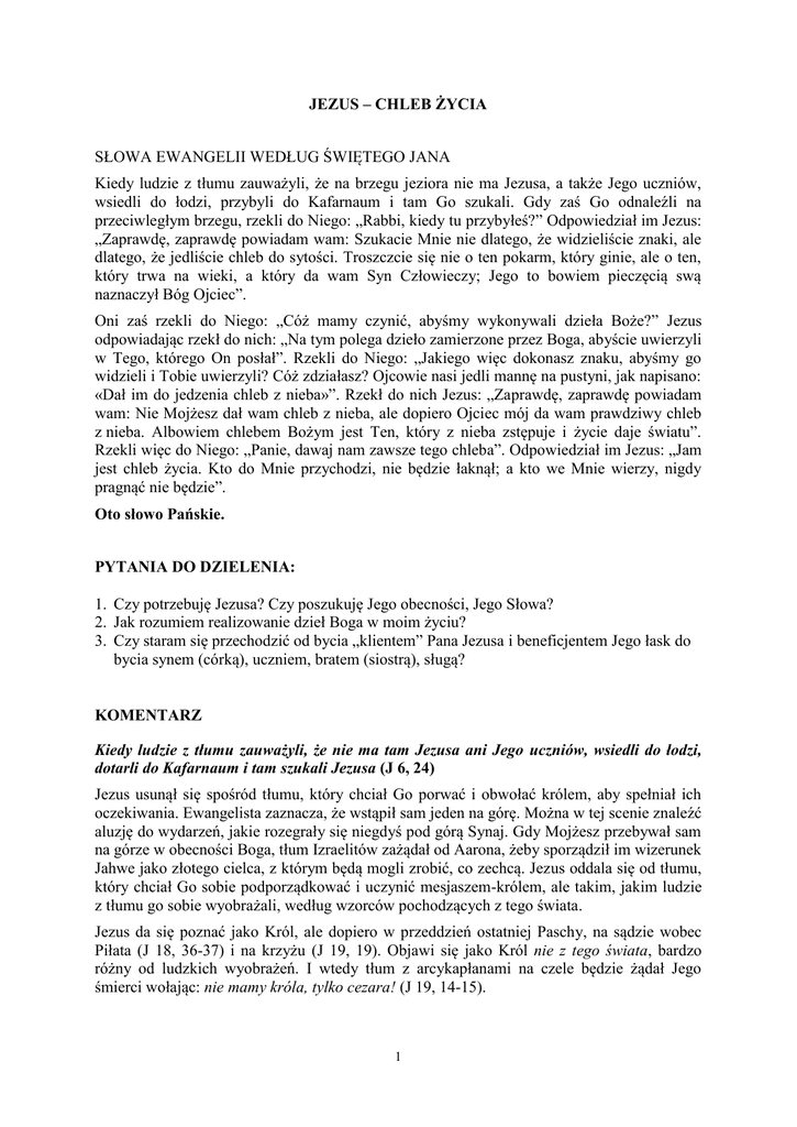 JEZUS – CHLEB ŻYCIA SŁOWA EWANGELII WEDŁUG ŚWIĘTEGO JANA Kiedy ludzie z tłumu zauważyli, że na brzegu jeziora nie ma Jezusa, a także Jego uczniów, wsiedli do łodzi, przybyli do Kafarnaum i tam Go szukali. Gdy zaś Go odnaleźli na przeciwległym brzegu, rzekli do Niego: „Rabbi, kiedy tu przybyłeś?” Odpowiedział im Jezus: „Zaprawdę, zaprawdę powiadam wam: Szukacie Mnie nie dlatego, że widzieliście znaki, ale dlatego, że jedliście chleb do sytości. Troszczcie się nie o ten pokarm, który ginie, ale o ten, który trwa na wieki, a który da wam Syn Człowieczy; Jego to bowiem pieczęcią swą naznaczył Bóg Ojciec”. Oni zaś rzekli do Niego: „Cóż mamy czynić, abyśmy wykonywali dzieła Boże?” Jezus odpowiadając rzekł do nich: „Na tym polega dzieło zamierzone przez Boga, abyście uwierzyli w Tego, którego On posłał”. Rzekli do Niego: „Jakiego więc dokonasz znaku, abyśmy go widzieli i Tobie uwierzyli? Cóż zdziałasz? Ojcowie nasi jedli mannę na pustyni, jak napisano: «Dał im do jedzenia chleb z nieba»”. Rzekł do nich Jezus: „Zaprawdę, zaprawdę powiadam wam: Nie Mojżesz dał wam chleb z nieba, ale dopiero Ojciec mój da wam prawdziwy chleb z nieba. Albowiem chlebem Bożym jest Ten, który z nieba zstępuje i życie daje światu”. Rzekli więc do Niego: „Panie, dawaj nam zawsze tego chleba”. Odpowiedział im Jezus: „Jam jest chleb życia. Kto do Mnie przychodzi, nie będzie łaknął; a kto we Mnie wierzy, nigdy pragnąć nie będzie”. Oto słowo Pańskie. PYTANIA DO DZIELENIA: 1. Czy potrzebuję Jezusa? Czy poszukuję Jego obecności, Jego Słowa? 2. Jak rozumiem realizowanie dzieł Boga w moim życiu? 3. Czy staram się przechodzić od bycia „klientem” Pana Jezusa i beneficjentem Jego łask do bycia synem (córką), uczniem, bratem (siostrą), sługą? KOMENTARZ Kiedy ludzie z tłumu zauważyli, że nie ma tam Jezusa ani Jego uczniów, wsiedli do łodzi, dotarli do Kafarnaum i tam szukali Jezusa (J 6, 24) Jezus usunął się spośród tłumu, który chciał Go porwać i obwołać królem, aby spełniał ich oczekiwania. Ewangelista zaznacza, że wstąpił sam jeden na górę. Można w tej scenie znaleźć aluzję do wydarzeń, jakie rozegrały się niegdyś pod górą Synaj. Gdy Mojżesz przebywał sam na górze w obecności Boga, tłum Izraelitów zażądał od Aarona, żeby sporządził im wizerunek Jahwe jako złotego cielca, z którym będą mogli zrobić, co zechcą. Jezus oddala się od tłumu, który chciał Go sobie podporządkować i uczynić mesjaszem-królem, ale takim, jakim ludzie z tłumu go sobie wyobrażali, według wzorców pochodzących z tego świata. Jezus da się poznać jako Król, ale dopiero w przeddzień ostatniej Paschy, na sądzie wobec Piłata (J 18, 36-37) i na krzyżu (J 19, 19). Objawi się jako Król nie z tego świata, bardzo różny od ludzkich wyobrażeń. I wtedy tłum z arcykapłanami na czele będzie żądał Jego śmierci wołając: nie mamy króla, tylko cezara! (J 19, 14-15). 1 Tłum nad jeziorem jest zagubiony i zdezorientowany, szuka Jezusa, który zniknął im z oczu. Ich oczekiwania rozmijają się z tym, czego chce Jezus. Można powiedzieć, że ulegają trzem pokusom, którym Jezus stawił czoła na pustyni: pokusie chleba, władzy i cudownych znaków. Gdy zaś odnaleźli Go na przeciwległym brzegu, rzekli do Niego: Rabbi, kiedy tu przybyłeś? (J 6, 25) Wcześniej ludzie z tłumu nie rozmawiali z Jezusem, a jedynie zjedli chleb, który Jezus im rozdał. To dialog z Nim może sprawić zmianę w ich sposobie myślenia i nastawieniu. Jednak, jak się okazuje, ta zmiana mentalności nie jest wcale rzeczą łatwą. W pierwszym pytaniu skierowanym przez ludzi z tłumu do Jezusa pobrzmiewa ciekawość i chęć kontrolowania Jezusa. W końcu zaś większość z nich odejdzie od Niego rozczarowana: Trudna jest ta mowa. Któż jej może słuchać? Mimo dialogu z Jezusem, pozostaną zamknięci na Jego słowo (J 6, 60-66). W odpowiedzi rzekł im Jezus: Zaprawdę, zaprawdę, powiadam wam: Szukacie Mnie nie dlatego, że widzieliście znaki, ale dlatego, że jedliście chleb do syta. Zabiegajcie nie o ten pokarm, który niszczeje, ale o ten, który trwa na życie wieczne, a który da wam Syn Człowieczy; Jego to bowiem pieczęcią swą naznaczył Bóg Ojciec (J 6, 26-27) Ludzie postawili niewłaściwe pytanie, dlatego Jezus nie odpowiada wprost, ale chce pomóc im zrozumieć, że powinni zmienić motywację podążania za Nim. Jezus nie chce być dla nich rabbim, który tylko będzie im dostarczał chleba i cudów. Znak rozmnożenia chleba, którego dokonał Jezus, miał im otworzyć oczy na inny pokarm, nieskończenie cenniejszy i ważniejszy od tego, który podtrzymuje życie na poziomie wegetatywnym, fizycznym. Jezus chce zwrócić im uwagę na pokarm dający życie wieczne, to znaczy będący udziałem w niezniszczalnym, doskonałym życiu samego Boga. Dawcą tego pokarmu jest Syn Człowieczy. Jezus zachęca słuchaczy, by ponad darem pomnożonego chleba dostrzegli jego Dawcę, który sam pragnie się im ofiarować jako Chleb z nieba. Życie wieczne, które obiecuje Jezus, jest w istocie komunią (zjednoczeniem) z Bogiem, obiecaną już w Starym Testamencie. Człowiek żyje nie samym chlebem, ale wszystkim, co pochodzi z ust Boga (Pwt 8, 3). To nie urodzaj plonów żywi człowieka, lecz słowo Twoje utrzymuje przy życiu ufających Tobie (Mdr 16, 26). Słowo Boga jest prawdziwym pokarmem ducha, który wprowadza człowieka w relację z Bogiem jako Ojcem i z innymi ludźmi jako braćmi. A to jest życie wieczne: aby znali Ciebie, jedynego prawdziwego Boga, oraz Tego, którego posłałeś, Jezusa Chrystusa (J 17, 3). Bóg Ojciec naznaczył Jezusa swoją „pieczęcią”. Znaczy to, że jest On konsekrowany (namaszczony) Duchem Świętym i uwierzytelniony jako Syn Boga. Zadaniem Jezusa jest dokonywanie dzieł Bożych, uczynienie tych, którzy uwierzą dziećmi Boga i wprowadzen