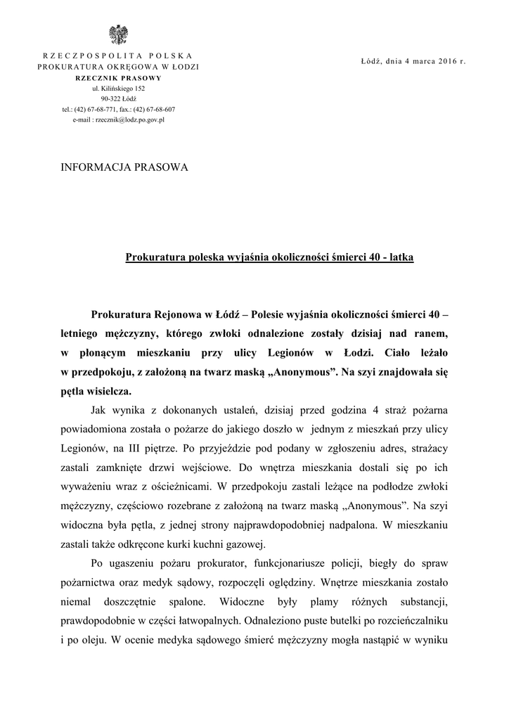 RZECZPOSPOLITA POLSKA PROKURATURA OKRĘGOWA W ŁODZI Łódź, dnia 4 marca 2016 r. RZE CZNIK P RASOWY ul. Kilińskiego 152 90-322 Łódź tel.: (42) 67-68-771, fax.: (42) 67-68-607 e-mail : [email protected] INFORMACJA PRASOWA Prokuratura poleska wyjaśnia okoliczności śmierci 40 - latka Prokuratura Rejonowa w Łódź – Polesie wyjaśnia okoliczności śmierci 40 – letniego mężczyzny, którego zwłoki odnalezione zostały dzisiaj nad ranem, w płonącym mieszkaniu przy ulicy Legionów w Łodzi. Ciało leżało w przedpokoju, z założoną na twarz maską „Anonymous”. Na szyi znajdowała się pętla wisielcza. Jak wynika z dokonanych ustaleń, dzisiaj przed godzina 4 straż pożarna powiadomiona została o pożarze do jakiego doszło w jednym z mieszkań przy ulicy Legionów, na III piętrze. Po przyjeździe pod podany w zgłoszeniu adres, strażacy zastali zamknięte drzwi wejściowe. Do wnętrza mieszkania dostali się po ich wyważeniu wraz z ościeżnicami. W przedpokoju zastali leżące na podłodze zwłoki mężczyzny, częściowo rozebrane z założoną na twarz maską „Anonymous”. Na szyi widoczna była pętla, z jednej strony najprawdopodobniej nadpalona. W mieszkaniu zastali także odkręcone kurki kuchni gazowej. Po ugaszeniu pożaru prokurator, funkcjonariusze policji, biegły do spraw pożarnictwa oraz medyk sądowy, rozpoczęli oględziny. Wnętrze mieszkania zostało niemal doszczętnie spalone. Widoczne były plamy różnych substancji, prawdopodobnie w części łatwopalnych. Odnaleziono puste butelki po rozcieńczalniku i po oleju. W ocenie medyka sądowego śmierć mężczyzny mogła nastąpić w wyniku 2 powieszenia i mogło do niej dojść około godz. 3 – 4 nad ranem. Jednoznaczne ustalenia w tym zakresie możliwe będą jednak dopiero po przeprowadzeniu sądowo – lekarskiej sekcji zwłok. Najprawdopodobniej doszło do odnalezienia zwłok 40 – letniego mężczyzny, który od kilku lat samotnie zajmował mieszkanie, w którym doszło do tragedii. Nie ulega przy tym wątpliwości, że zdarzenie stwarzało realne zagrożenie dla zdrowia i życia innych mieszkańców kamienicy. Na szczęście pożar udało się szybko opanować. Nie doszło także do wybuchu gazu. Rzecznik Prasowy Prokuratury Okręgowej w Łodzi Krzysztof Kopania