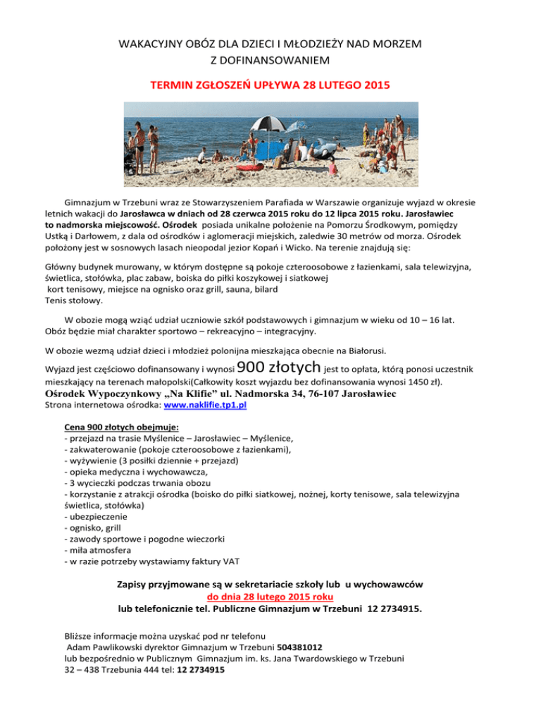 WAKACYJNY OBÓZ DLA DZIECI I MŁODZIEŻY NAD MORZEM Z DOFINANSOWANIEM TERMIN ZGŁOSZEŃ UPŁYWA 28 LUTEGO 2015 Gimnazjum w Trzebuni wraz ze Stowarzyszeniem Parafiada w Warszawie organizuje wyjazd w okresie letnich wakacji do Jarosławca w dniach od 28 czerwca 2015 roku do 12 lipca 2015 roku. Jarosławiec to nadmorska miejscowość. Ośrodek posiada unikalne położenie na Pomorzu Środkowym, pomiędzy Ustką i Darłowem, z dala od ośrodków i aglomeracji miejskich, zaledwie 30 metrów od morza. Ośrodek położony jest w sosnowych lasach nieopodal jezior Kopań i Wicko. Na terenie znajdują się: Główny budynek murowany, w którym dostępne są pokoje czteroosobowe z łazienkami, sala telewizyjna, świetlica, stołówka, plac zabaw, boiska do piłki koszykowej i siatkowej kort tenisowy, miejsce na ognisko oraz grill, sauna, bilard Tenis stołowy. W obozie mogą wziąć udział uczniowie szkół podstawowych i gimnazjum w wieku od 10 – 16 lat. Obóz będzie miał charakter sportowo – rekreacyjno – integracyjny. W obozie wezmą udział dzieci i młodzież polonijna mieszkająca obecnie na Białorusi. 900 złotych Wyjazd jest częściowo dofinansowany i wynosi jest to opłata, którą ponosi uczestnik mieszkający na terenach małopolski(Całkowity koszt wyjazdu bez dofinansowania wynosi 1450 zł). Ośrodek Wypoczynkowy „Na Klifie” ul. Nadmorska 34, 76-107 Jarosławiec Strona internetowa ośrodka: www.naklifie.tp1.pl Cena 900 złotych obejmuje: - przejazd na trasie Myślenice – Jarosławiec – Myślenice, - zakwaterowanie (pokoje czteroosobowe z łazienkami), - wyżywienie (3 posiłki dziennie + przejazd) - opieka medyczna i wychowawcza, - 3 wycieczki podczas trwania obozu - korzystanie z atrakcji ośrodka (boisko do piłki siatkowej, nożnej, korty tenisowe, sala telewizyjna świetlica, stołówka) - ubezpieczenie - ognisko, grill - zawody sportowe i pogodne wieczorki - miła atmosfera - w razie potrzeby wystawiamy faktury VAT Zapisy przyjmowane są w sekretariacie szkoły lub u wychowawców do dnia 28 lutego 2015 roku lub telefonicznie tel. Publiczne Gimnazjum w Trzebuni 12 2734915. Bliższe informacje można uzyskać pod nr telefonu Adam Pawlikowski dyrektor Gimnazjum w Trzebuni 504381012 lub bezpośrednio w Publicznym Gimnazjum im. ks. Jana Twardowskiego w Trzebuni 32 – 438 Trzebunia 444 tel: 12 2734915