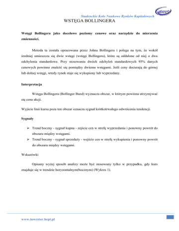 Studenckie Koło Naukowe Rynków Kapitałowych WSTĘGA BOLLINGERA Wstęgi Bollingera jako docelowe poziomy cenowe oraz narzędzie do mierzenia zmienności. Metoda ta została opracowana przez Johna Bollingera i polega na tym, że wokół średniej umieszcza się dwie wstęgi (wstęgi Bollingera), które są oddalone od niej o dwa odchylenia standardowe. Przy stosowaniu dwóch odchyleń standardowych 95% danych cenowych powinno znaleźć się pomiędzy dwiema wstęgami. Jeśli ceny docierają do górnej lub dolnej wstęgi, wtedy rynek staje się wykupiony lub wyprzedany. Interpretacja Wstęga Bollingera (Bollinger Band) wyznacza obszar, w którym powinna utrzymywać się cena akcji. Wyjście linii kursu poza ten obszar oznacza sygnał krótkotrwałego odwrócenia tendencji. Sygnały Trend boczny - sygnał kupna - zejście cen w strefę wyprzedania i ponowny powrót do obszaru między wstęgami. Trend boczny - sygnał sprzedaży - wejście cen w strefę wykupienia i ponowny powrót do obszaru między wstęgami. Wskazówki Opisany wyżej sposób analizy może być stosowany tylko w przypadku, gdy kurs znajduje się w trendzie horyzontalnym(bocznym) (Wykres 1). www.inwestor.hepi.pl 1 Studenckie Koło Naukowe Rynków Kapitałowych Wykres 1. Źródło: DealBook360 Przy długich wzrostach lub spadkach często linia kursu porusza się poza obszarem wyznaczonym przez wstęgę (Wykres 2). Sygnał kupna - zostaje wygenerowany, gdy linia kursu spada poniżej dolnego ograniczenia wstęgi. Sygnał sprzedaży - zostaje wygenerowany, gdy kurs przebuja górne ograniczenie wstęgi. www.inwestor.hepi.pl 1 Studenckie Koło Naukowe Rynków Kapitałowych Wykres 2. Źródło: DealBook 360 Jeśli ramiona wstęgi znajdują się przez dłuższy czas bardzo blisko siebie, można się spodziewać dużego ruchu cen. Jego kierunek jest najczęściej zgodny z ruchem, który doprowadził do pierwszego wyraźnego przebicia wstęgi (Wykres 3.). www.inwestor.hepi.pl 1 Studenckie Koło Naukowe Rynków Kapitałowych Wykres 3. Źródło: DealBook360 Wstęgi Bollingera służą także do mierzenia zmienności cen i dają pomocne wskazówki przy rozpoznawaniu trendu. Rozszerzające się wstęgi świadczą o możliwym końcu głównego trendu, natomiast zwężanie się wstęg może być pierwszym sygnałem początku nowego trendu. Najlepiej jest stosować wstęgi w połączeniu z innymi wskaźnikami. www.inwestor.hepi.pl 1 Studenckie Koło Naukowe Rynków Kapitałowych Szczególną uwagę trzeba zwrócić na średnia kroczącą, która może doskonale wskazać istniejący trend na rynku. Wykorzystanie średniej może służyć także do wyznaczania sygnałów kupna lub sprzedaży. Bardzo dobrze obrazuje to przedstawiony poniżej wykres 4. Sygnał kupna - zostaje wygenerowany, gdy linia kursu przebija od dołu średnia kroczącą Sygnał sprzedaży - zostaje wygenerowany, gdy kurs przebija od góry średnią kroczącą. Wykres 4. Źródło: DealBook360 Wskazówki Przedstawiona powyżej strategia handlowania najlepsze rezultaty wykazuje w momentach występowania silnych trendów wzrostowych lub spadających. www.inwestor.hepi.pl 1 Studenckie Koło Naukowe Rynków Kapitałowych Podsumowanie: Trend boczny - sygnał kupna - zejście cen w strefę wyprzedania i ponowny powrót do obszaru między wstęgami. Trend boczny - sygnał sprzedaży - wejście cen w strefę wykupienia i ponowny powrót do obszaru między wstęgami. Sygnał kupna - zostaje wygenerowany, gdy linia kursu spada poniżej dolnego ograniczenia wstęgi. Sygnał sprzedaży - zostaje wygenerowany, gdy kurs przebuja górne ograniczenie wstęgi. Rozszerzające się wstęgi – możliwy koniec głównego trendu. Zwężające się wstęgi - początek nowego trendu. Krzysztof Wańczyk [email protected] www.inwestor.hepi.pl 1