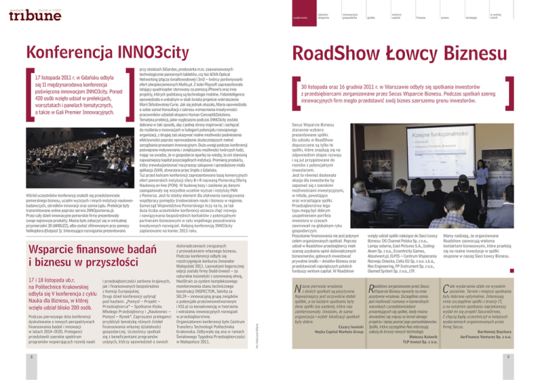 Styczeń, nr 1/2012 wydarzenia przy stoiskach SiGarden, producenta m.in. zaawansowanych technologicznie pancernych tabletów, czy też ADVA Optical Networking (złącza światłowodowe) i 3m2 – twórcy porównywarki ofert ubezpieczeniowych Mulitu.pl. Z kolei Playsoft zaprezentowała latający quadricopter sterowany za pomocą iPhone’a oraz inne projekty, których podstawą są technologie mobilne. Fidointelligence opowiedziała o unikalnym w skali świata projekcie wskrzeszenia Marii Skłodowskiej-Curie. Jak się jednak okazało, Maria opowiedziała o sobie sama! Konsultacji z zakresu wzmacniania kreatywności pracowników udzielali eksperci Human Concept&Solutions. Tematyka prelekcji, jakie wygłoszono podczas INNO3city została dobrana w taki sposób, aby z jednej strony inspirować i zachęcać do myślenia o innowacjach w kategorii potencjału rozwojowego organizacji, z drugiej zaś ukazywać realne możliwości podniesienia efektywności poprzez wprowadzenie skuteczniejszych metod zarządzania procesem innowacyjnym. Dużo uwagi podczas konferencji poświęcono motywowaniu i zwiększaniu możliwości twórczych ludzi, mając na uwadze, że w gospodarce opartej na wiedzy, to oni stanowią najważniejszy kapitał poszczególnych instytucji. Premierę produktu, który zrewolucjonizować ma procesy zakupowe i sprzedażowe miała aplikacja ZUKR, stworzona przez Implix z Gdańska. Tuż przed końcem konferencji zaprezentowano bazę komercyjnych ofert pomorskich instytucji sfery B+R nazwaną Pomorską Ofertą Naukową on-line (PON). W budowę bazy i zasilenie jej danymi zaangażowały się wszystkie uczelnie wyższe i instytuty PAN z Pomorza. Jest to istotny element dla ułatwienia nawiązywania współpracy pomiędzy środowiskiem nauki i biznesu w regionie. Samorząd Województwa Pomorskiego liczy na to, że tak duża liczba uczestników konferencji oznacza chęć rozwoju i nawiązywania bezpośrednich kontaktów z potencjalnymi partnerami biznesowymi w celu wspólnego poszukiwania kreatywnych rozwiązań. Kolejną konferencję INNO3city zaplanowano na koniec 2013 roku. Wsparcie finansowe badań i biznesu w przyszłości 17 i 18 listopada ub.r. na Politechnice Krakowskiej odbyła się V konferencja z cyklu Nauka dla Biznesu, w której wzięło udział blisko 200 osób. Podczas pierwszego dnia konferencji dyskutowano o nowych perspektywach finansowania badań i innowacji w latach 2014–2020. Prelegenci przedstawili szerokie spektrum programów wspierających rozwój nauki 8 i przedsiębiorczości zarówno krajowych, jak i finansowanych bezpośrednio z Komisji Europejskiej. Drugi dzień konferencji upłynął pod hasłami: „Pomysł – Projekt – Przedsiębiorca” – Spotkanie Klubu Młodego Przedsiębiorcy i „Naukowiec – Pomysł – Rynek”. Zaproszeni prelegenci przybliżyli tematykę różnych źródeł finansowania własnej działalności gospodarczej. Uczestnicy spotkali się z beneficjentami programów unijnych, którzy opowiedzieli o swoich doświadczeniach związanych z prowadzeniem własnego biznesu. Podczas konferencji odbyło się rozstrzygnięcie konkursu Innovator Małopolski 2011. Laureatami tegorocznej edycji zostały firmy Dodd-Inwest – za naturalne kosmetyki z ozonowaną oliwą, NeoStrain za system kompleksowego monitorowania stanu technicznego konstrukcji INSPECTOR, Selvita za SEL24 – innowacyjną grupę związków o potencjale przeciwnowotworowym i KSI.pl za konsekwencję w tworzeniu i wdrażaniu innowacyjnych rozwiązań w przedsiębiorstwie. Organizatorem konferencji było Centrum Transferu Technologii Politechnika Krakowska. Odbywała się ona w ramach Światowego Tygodnia Przedsiębiorczości w Małopolsce 2011. giełda venture capital finanse prawo strategie w wolnej chwili 30 listopada oraz 16 grudnia 2011 r. w Warszawie odbyły się spotkania inwestorów z przedsiębiorcami zorganizowane przez Secus Wsparcie Biznesu. Podczas spotkań szereg innowacyjnych firm mogło przedstawić swój biznes szerszemu gronu inwestorów. Secus Wsparcie Biznesu starannie wybiera prezentowane spółki. Do udziału w RoadShow dopuszczane są tylko te spółki, które znajdują się na odpowiednim etapie rozwoju i są już przygotowane do rozmów z potencjalnymi inwestorami. Jest to również doskonała okazja dla inwestorów by zapoznać się z szerokimi możliwościami inwestycyjnymi, w młode, powstające oraz wzrastające spółki. Przedsiębiorstwa tego typu mogą być dobrym uzupełnieniem portfela inwestora w czasach zawirowań na globalnym ryku gospodarczym. Pozyskanie finansowania nie jest jedynym celem organizowanych spotkań. Poprzez udział w Roadshow przedsiębiorcy mieli szansę uzyskania opinii doświadczonych biznesmenów, gotowych inwestować prywatne środki – Aniołów Biznesu oraz przedstawicieli największych polskich funduszy venture capital. W Roadshow N Fot: Katarzyna Wójcik. Wśród uczestników konferencji znaleźli się przedstawiciele pomorskiego biznesu, uczelni wyższych i innych instytucji naukowobadawczych, ośrodków innowacji oraz samorządu. Prelekcje były transmitowane online poprzez serwis INNOpomorze.pl. Przez cały dzień innowacyjne pomorskie firmy prezentowały swoje najnowsze produkty. Można było zobaczyć się w wirtualnej przymierzalni 3D (ARBUZZ), albo zostać sfilmowanym przy pomocy helikoptera (Outpost 1). Interesujące rozwiązania prezentowano innowacyjna gospodarka RoadShow Łowcy Biznesu Konferencja INNO3city 17 listopada 2011 r. w Gdańsku odbyła się II międzynarodowa konferencja poświęcona innowacjom INNO3city. Ponad 420 osób wzięło udział w prelekcjach, warsztatach i panelach tematycznych, a także w Gali Premier Innowacyjnych. zdaniem eksperta asze pierwsze wrażenia z dwóch spotkań są pozytywne. Najważniejszy jest oczywiście dobór spółek, a na każdym spotkaniu były dwie spółki (na siedem), które nas zainteresowały. Uważam, że sama organizacja i wybór lokalizacji spotkań były dobr