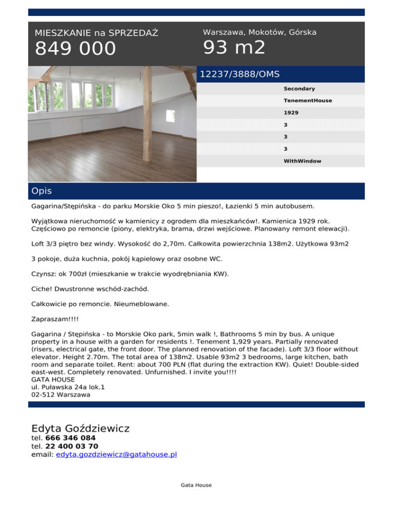 MIESZKANIE na SPRZEDAŻ 849 000 Warszawa, Mokotów, Górska 93 m2 12237/3888/OMS Secondary TenementHouse 1929 3 3 3 WithWindow Opis Gagarina/Stępińska - do parku Morskie Oko 5 min pieszo!, Łazienki 5 min autobusem. Wyjątkowa nieruchomość w kamienicy z ogrodem dla mieszkańców!. Kamienica 1929 rok. Częściowo po remoncie (piony, elektryka, brama, drzwi wejściowe. Planowany remont elewacji). Loft 3/3 piętro bez windy. Wysokość do 2,70m. Całkowita powierzchnia 138m2. Użytkowa 93m2 3 pokoje, duża kuchnia, pokój kąpielowy oraz osobne WC. Czynsz: ok 700zł (mieszkanie w trakcie wyodrębniania KW). Ciche! Dwustronne wschód-zachód. Całkowicie po remoncie. Nieumeblowane. Zapraszam!!!! Gagarina / Stępińska - to Morskie Oko park, 5min walk !, Bathrooms 5 min by bus. A unique property in a house with a garden for residents !. Tenement 1,929 years. Partially renovated (risers, electrical gate, the front door. The planned renovation of the facade). Loft 3/3 floor without elevator. Height 2.70m. The total area of 138m2. Usable 93m2 3 bedrooms, large kitchen, bath room and separate toilet. Rent: about 700 PLN (flat during the extraction KW). Quiet! Double-sided east-west. Completely renovated. Unfurnished. I invite you!!!! GATA HOUSE ul. Puławska 24a lok.1 02-512 Warszawa Edyta Goździewicz tel. 666 346 084 tel. 22 400 03 70 email: [email protected] Gata House Gata House Powered by TCPDF (www.tcpdf.org)