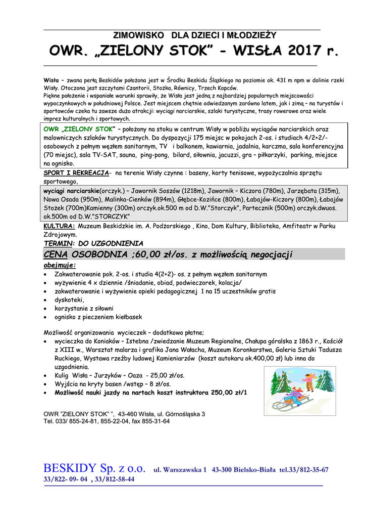 _________________________________________________________________________________ ZIMOWISKO DLA DZIECI I MŁODZIEŻY OWR. „ZIELONY STOK” - WISŁA 2017 r. ________________________________________________________________________________ Wisła – zwana perłą Beskidów położona jest w Środku Beskidu Śląskiego na poziomie ok. 431 m npm w dolinie rzeki Wisły. Otoczona jest szczytami Czantorii, Stożka, Równicy, Trzech Kopców. Piękne położenie i wspaniałe warunki sprawiły, że Wisła jest jedną z najbardziej popularnych miejscowości wypoczynkowych w południowej Polsce. Jest miejscem chętnie odwiedzanym zarówno latem, jak i zimą – na turystów i sportowców czeka tu zawsze dużo atrakcji: wyciągi narciarskie, szlaki turystyczne, trasy rowerowe oraz wiele imprez kulturalnych i sportowych. OWR „ZIELONY STOK” – położony na stoku w centrum Wisły w pobliżu wyciągów narciarskich oraz malowniczych szlaków turystycznych. Do dyspozycji 175 miejsc w pokojach 2-os. i studiach 4/2+2/osobowych z pełnym węzłem sanitarnym, TV i balkonem, kawiarnia, jadalnia, karczma, sala konferencyjna (70 miejsc), sala TV-SAT, sauna, ping-pong, bilard, siłownia, jacuzzi, gra – piłkarzyki, parking, miejsce na ognisko. SPORT I REKREACJA- na terenie Wisły czynne : baseny, korty tenisowe, wypożyczalnia sprzętu sportowego, wyciągi narciarskie(orczyk.) – Jawornik Soszów (1218m), Jawornik – Kiczora (780m), Jarzębata (315m), Nowa Osada (950m), Malinka-Cienków (894m), Głębce-Kozińce (800m), Łabajów-Kiczory (800m), Łabajów Stożek (700m)Kamienny (300m) orczyk.ok.500 m od D.W.”Storczyk”, Partecznik (500m) orczyk.dwuos. ok.500m od D.W.”STORCZYK” KULTURA: Muzeum Beskidzkie im. A. Podżorskiego , Kino, Dom Kultury, Biblioteka, Amfiteatr w Parku Zdrojowym. TERMIN: DO UZGODNIENIA CENA OSOBODNIA ;60,00 zł/os. z możliwością negocjacji obejmuje: Zakwaterowanie pok. 2-os. i studia 4(2+2)- os. z pełnym węzłem sanitarnym wyżywienie 4 x dziennie /śniadanie, obiad, podwieczorek, kolacja/ zakwaterowanie i wyżywienie opieki pedagogicznej 1 na 15 uczestników gratis dyskoteki, korzystanie z siłowni ognisko z pieczeniem kiełbasek Możliwość organizowania wycieczek – dodatkowo płatne; wycieczka do Koniaków – Istebna /zwiedzanie Muzeum Regionalne, Chałupa góralska z 1863 r., Kościół z XIII w., Warsztat malarza i grafika Jana Wałacha, Muzeum Koronkarstwa, Galeria Sztuki Tadusza Ruckiego, Wystawa rzeźby ludowej Kamieniarzów (koszt autokaru ok.400,00 zł) lub inna do uzgodnienia. Kulig Wisła – Jurzyków – Oaza - 25,00 zł/os. Wyjścia na kryty basen /wstęp – 8 zł/os. Możliwość nauki jazdy na nartach koszt instruktora 250,00 zł/1 OW R ”ZIELONY STOK” ”, 43-460 W isła, ul. Górnośląska 3 Tel. 033/ 855-24-81, 855-22-04, fax 855-31-64 BESKIDY Sp. z o.o. 33/822- 09- 04 , 33/812-58-44 ul. Warszawska 1 43-300 Bielsko-Biała tel.33/812-35-67