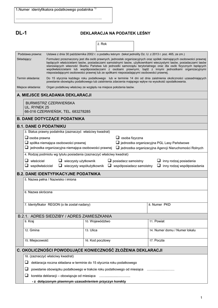 1.Numer identyfikatora podatkowego podatnika 1) …………………………………………………………….. DL-1 DEKLARACJA NA PODATEK LEŚNY 2. Rok Podstawa prawna: Ustawa z dnia 30 października 2002 r. o podatku leśnym (tekst jednolity Dz. U. z 2013 r. poz. 465, ze zm.) Składający: Formularz przeznaczony jest dla osób prawnych, jednostek organizacyjnych oraz spółek niemających osobowości prawnej będących właścicielami lasów, posiadaczami samoistnymi lasów, użytkownikami wieczystymi lasów, posiadaczami lasów stanowiących własność Skarbu Państwa lub jednostki samorządu terytorialnego oraz dla osób fizycznych będących współwłaścicielami lub współposiadaczami z osobami prawnymi, bądź z innymi jednostkami organizacyjnymi nieposiadającymi osobowości prawnej lub ze spółkami nieposiadającymi osobowości prawnej. Termin składania: Do 15 stycznia każdego roku podatkowego lub w terminie 14 dni od dnia zaistnienia okoliczności uzasadniających powstanie obowiązku podatkowego lub zaistnienia zdarzenia mającego wpływ na wysokość opodatkowania. Miejsce składania: Organ podatkowy właściwy ze względu na miejsce położenia lasów. A. MIEJSCE SKŁADANIA DEKLARACJI BURMISTRZ CZERWIEŃSKA UL. RYNEK 25 66-016 CZERWIEŃSK, TEL. 683278285 B. DANE DOTYCZĄCE PODATNIKA B.1. DANE O PODATNIKU 3. Status prawny podatnika (zaznaczyć właściwy kwadrat) osoba prawna osoba fizyczna spółka niemająca osobowości prawnej jednostka organizacyjna PGL Lasy Państwowe jednostka organizacyjna niemająca osobowości prawnej jednostka organizacyjna Agencji Nieruchomości Rolnych 4. Rodzaj podmiotu wg tytułu posiadania (zaznaczyć właściwy kwadrat) właściciel współwłaściciel wieczysty użytkownik wieczysty współużytkownik posiadacz samoistny współposiadacz samoistny inny rodzaj posiadania inny rodzaj współposiadania B.2. DANE IDENTYFIKACYJNE PODATNIKA 5. Nazwa pełna / Nazwisko i imiona 6. Nazwa skrócona 7. Identyfikator REGON (o ile został nadany) 8. Numer PKD B.2.1. ADRES SIEDZIBY / ADRES ZAMIESZKANIA 9. Kraj 10. Województwo 11. Powiat 12. Gmina 13. Ulica 14. Numer domu / Numer lokalu 15. Miejscowość 16. Kod pocztowy 17. Poczta C. OKOLICZNOŚCI POWODUJĄCE KONIECZNOŚĆ ZŁOŻENIA DEKLARACJI 18. (zaznaczyć właściwy kwadrat) deklaracja roczna składana w terminie do 15 stycznia roku podatkowego powstanie obowiązku podatkowego w trakcie roku podatkowego od miesiąca korekta deklaracji – obowiązuje od miesiąca .............................. .................................. - z dołączonym pisemnym uzasadnieniem przyczyn korekty 1 D. DANE DOTYCZĄCE PRZEDMIOTÓW OPODATKOWANIA (z wyjątkiem zwolnionych) Okres Wyszczególnienie 1. Lasy wchodzące w skład rezerwatów przyrody i parków narodowych 2. Lasy pozostałe (nie wymienione w w 1 od m-ca 2) Powierzchnia w ha do m-ca Stawka Kwota podatku …..zł, … gr zł, 23. 24. 25. 26. 27. 28. 29. 30. gr E. ŁĄCZNA KWOTA PODATKU 31. Razem podatek suma kwot z poz. 22, 26 i 30, zaokrąglona do pełnych złotych 3) F. INFORMACJA O PRZEDMIOTACH ZWOLNIONYCH Tytuł zwolnienia (podstawa prawna) Powierzchnia lasów w ha Art. 7 ust. 1 pkt 1 – lasy z drzewostanem do 40 lat Art. 7 ust. 1 pkt 2 – lasy wpisane indywidualnie do rejestru zabytków Art. 7 ust. 1 pkt 3 – użytki ekologiczne Inne Kwota zwolnienia zł, 32. 33. 34. 35. 36. 37. 38. 39. gr G. OŚWIADCZENIE I PODPIS PODATNIKA / OSÓB REPREZENTUJĄCYCH PODATNIKA4) 40. Imię i nazwisko osoby odpowiedzialnej za sporządzenie 41. Numer telefonu kontaktowego / e-mail deklaracji 42. Imię i nazwisko osoby/osób reprezentujących podatnika 43. Podpis (pieczęć) podatnika / osoby/ osób reprezentujących podatnika 44. Data wypełnienia (dzień - miesiąc - rok) H. ADNOTACJE ORGANU PODATKOWEGO Data i podpis przyjmującego formularz Wyliczony podatek należy wpłacać na przypisany do podatnika indywidualny numer rachunku bankowego. W przypadku niewpłacenia w ustawowych terminach rat podatku leśnego lub wpłacenia ich w niepełnej wysokości, niniejsza deklaracja stanowi podstawę do wystawienia tytułu wykonawczego, zgodnie z art. 3a ustawy z dnia 17 czerwca 1966 r. o postępowaniu egzekucyjnym w administracji (Dz. U. z 2014 r. poz. 1619 ze zm.). Objaśnienia do deklaracji DL-1 1) Identyfikatorem podatkowym jest: numer PESEL – w przypadku podatników będących osobami fizycznymi objętymi rejestrem PESEL nieprowadzących działalności gospodarczej lub niebędących zarejestrowanymi podatnikami podatku od towarów i usług, NIP – w przypadku pozostałych podmiotów podlegających obowiązkowi ewidencyjnemu. 2) Kolumny OKRES nie wypełnia się w przypadku deklaracji rocznej składanej w terminie do 15 stycznia roku podatkowego. 3) Zgodnie z art. 63 § 1 ustawy z dnia 29 sierpnia 1997 r. - Ordynacja podatkowa (Dz. U. z 2015 r. poz. 613 ze zm.) kwotę podatku zaokrągla się do pełnych złotych w ten sposób, że końcówki kwot wynoszące mniej niż 50 groszy pomija się, a końcówki kwot wynoszące 50 i więcej groszy podwyższa się do pełnych złotych. 4) Zgodnie z art. 80a § 2 Ordynacji podatkowej pełnomocnictwo do podpisywania deklaracji oraz zawiadomienie o odwołaniu tego pełnomocnictwa składa się organowi podatkowemu właściwemu w sprawach podatku, którego dana deklaracja dotyczy. Pełnomocnik dołącza do deklaracji oryginał lub urzędowo poświadczony odpis pełnomocnictwa wraz z dowodem zapłaty opłaty skarbowej. Adwokat, radca prawny, a także doradca podatkowy mogą sami uwierzytelnić odpis udzielonego im pełnomocnictwa (art. 137 § 3 w zw. z art. 80a § 4 Ordynacji podatkowej). 2