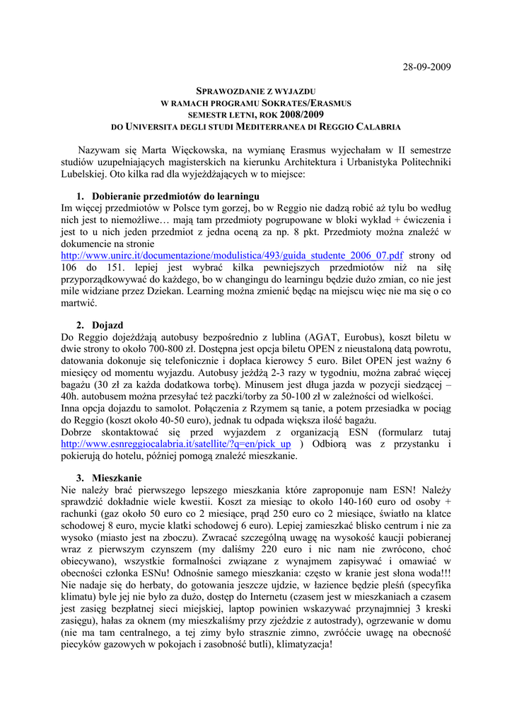 28-09-2009 SPRAWOZDANIE Z WYJAZDU W RAMACH PROGRAMU SOKRATES/ERASMUS SEMESTR LETNI, ROK 2008/2009 DO UNIVERSITA DEGLI STUDI MEDITERRANEA DI REGGIO CALABRIA Nazywam się Marta Więckowska, na wymianę Erasmus wyjechałam w II semestrze studiów uzupełniających magisterskich na kierunku Architektura i Urbanistyka Politechniki Lubelskiej. Oto kilka rad dla wyjeżdżających w to miejsce: 1. Dobieranie przedmiotów do learningu Im więcej przedmiotów w Polsce tym gorzej, bo w Reggio nie dadzą robić aż tylu bo według nich jest to niemożliwe… mają tam przedmioty pogrupowane w bloki wykład + ćwiczenia i jest to u nich jeden przedmiot z jedna oceną za np. 8 pkt. Przedmioty można znaleźć w dokumencie na stronie http://www.unirc.it/documentazione/modulistica/493/guida_studente_2006_07.pdf strony od 106 do 151. lepiej jest wybrać kilka pewniejszych przedmiotów niż na siłę przyporządkowywać do każdego, bo w changingu do learningu będzie dużo zmian, co nie jest mile widziane przez Dziekan. Learning można zmienić będąc na miejscu więc nie ma się o co martwić. 2. Dojazd Do Reggio dojeżdżają autobusy bezpośrednio z lublina (AGAT, Eurobus), koszt biletu w dwie strony to około 700-800 zł. Dostępna jest opcja biletu OPEN z nieustaloną datą powrotu, datowania dokonuje się telefonicznie i dopłaca kierowcy 5 euro. Bilet OPEN jest ważny 6 miesięcy od momentu wyjazdu. Autobusy jeżdżą 2-3 razy w tygodniu, można zabrać więcej bagażu (30 zł za każda dodatkowa torbę). Minusem jest długa jazda w pozycji siedzącej – 40h. autobusem można przesyłać też paczki/torby za 50-100 zł w zależności od wielkości. Inna opcja dojazdu to samolot. Połączenia z Rzymem są tanie, a potem przesiadka w pociąg do Reggio (koszt około 40-50 euro), jednak tu odpada większa ilość bagażu. Dobrze skontaktować się przed wyjazdem z organizacją ESN (formularz tutaj http://www.esnreggiocalabria.it/satellite/?q=en/pick_up ) Odbiorą was z przystanku i pokierują do hotelu, później pomogą znaleźć mieszkanie. 3. Mieszkanie Nie należy brać pierwszego lepszego mieszkania które zaproponuje nam ESN! Należy sprawdzić dokładnie wiele kwestii. Koszt za miesiąc to około 140-160 euro od osoby + rachunki (gaz około 50 euro co 2 miesiące, prąd 250 euro co 2 miesiące, światło na klatce schodowej 8 euro, mycie klatki schodowej 6 euro). Lepiej zamieszkać blisko centrum i nie za wysoko (miasto jest na zboczu). Zwracać szczególną uwagę na wysokość kaucji pobieranej wraz z pierwszym czynszem (my daliśmy 220 euro i nic nam nie zwrócono, choć obiecywano), wszystkie formalności związane z wynajmem zapisywać i omawiać w obecności członka ESNu! Odnośnie samego mieszkania: często w kranie jest słona woda!!! Nie nadaje się do herbaty, do gotowania jeszcze ujdzie, w łazience będzie pleśń (specyfika klimatu) byle jej nie było za dużo, dostęp do Internetu (czasem jest w mieszkaniach a czasem jest zasięg bezpłatnej sieci miejskiej, laptop powinien wskazywać przynajmniej 3 kreski zasięgu), hałas za oknem (my mieszkaliśmy przy zjeździe z autostrady), ogrzewanie w domu (nie ma tam centralnego, a tej zimy było strasznie zimno, zwróćcie uwagę na obecność piecyków gazowych w pokojach i zasobność butli), klimatyzacja! 4. Formalności na miejscu Pierwsza wizyta jest u Pana Politiego w Rektoracie w centrum miasta (http://maps.google.com/maps?q=universita&hl=pl&ie=UTF8&view=map&cid=1091894546 2037584108&iwloc=A). Tam dostaniecie legitymacje Erasmusa (potrzeba zdjęcie, najlepiej weźcie więcej zdjęć bo się przydają). Na uczelni koordynatorzy to Pani Colafranceschi oraz Pan Barone. Ona wam pomoże i ładnie mówi po angielsku. On nie mówi po angielsku ale jest bardzo sympatyczny. 5. Uzgodnienie przedmiotów na miejscu Najlepiej zabrać ze sobą członka ESN do pomocy i stanąć przed tablicą z planem (na parterze naprzeciw wejścia) i wypisać sobie interesujące przedmioty, wykładowców i sale. Potem zapytać kogoś, który z nich mówi po angielsku, jak ciężkie są zaliczenia (polecamy Partenope, Fera, Donin, Colafranceschi, nie polecam DeNittis). Jak już wybierzecie przedmioty to zgłoście się na zajęcia i zameldujcie się u profesora, ustalcie formę zaliczenia i zacznijcie uczęszczać. Zajęcia projektowe są prowadzone cały dzień z przerwa na obiad. Podczas zajęć można robić co się chce czekając na konsultacje (czasem jest lista, czasem nie). Przygotujcie się na ciągłe spóźnianie się wykładowców nawet o 2 godziny. Dla nich to normalka. Punktualnie jest tylko przerwa na obiad (około 13:30 do 15-16). Jeśli nie ma profesora w danej Sali to przejdźcie po innych (nie ma ich za wiele), potem sprawdźcie taras na I piętrze (tam jest chłodniej i często tam są zajęcia), potem gabinet profesora. Jeśli nigdzie go nie ma to idźcie do Pana Barone to on zadzwoni i go namierzy, albo na pierwszych zajęciach wymieńcie się telefonami z asystentami profesora i do nich dzwońcie. Brzmi to niedorzecznie ale tam nikt się specjalnie niczym nie przejmuje. 6. Włoski Pan Politi zapisze was do Dante Alighieri – szkoły językowej dla obcokrajowców. Jest to naprawdę dobra szkoła. Zajęcia są od 9 do 13, od poniedziałku do piątku, przez miesiąc. Punktualność i obecność obowiązkowa. Jeśli was nie zapiszą od razu po przyjeździe to naciskajcie na to bo im wcześniej zaczniecie naukę tym mniej problemów będzie na uczelni. Później zaczną się przeglądy projektów na których trzeba być i trzeba jakoś te 2 szkoły pogodzić. W Dante Alighieri sekretarzem jest przemiły Włoch Vincenzo który trochę mówi po polsku. Będzie wam proponował różne wycieczki za naprawdę niewielkie pieniądze. Naprawdę warto się z nim wybrać. 7. Zaliczenia Projekty zaliczane są na zasadzie obrony (egzaminu ustnego), ale nie jest to takie straszne. Oddaje się projekt na planszach A1 (około 6 euro za wydruk full kolor, 