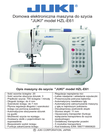 Domowa elektroniczna maszyna do szycia "JUKI" model HZL-E61 Opis maszyny do szycia "JUKI" model HZL-E61 - Iloœæ wzorów œciegów: 20 - Iloœæ wzorów obszycia dziurek: 3 - Prêdkoœæ szycia: 700 œciegów / minutê - D³ugoœæ œciegu: do 4 mm - Szerokoœæ œciegu: do 7 mm - P³ynna regulacja d³ugoœci i szerokoœci œciegu (za pomoc¹ suwaków) - Automatyczne obszywanie dziurek na guziki - Mo¿liwoœæ szycia na wysiêgu - Dostawny stolik z pojemnikiem na wyposa¿enie - Bezpoœredni wybór œciegu - Funkcja zakañczania œciegu - Regulacja naprê¿enia nici - £atwe nawijanie i wk³adanie szpuleczki - Przezroczysta pokrywa bêbenka - Automatyczny nawlekacz ig³y - Automatyczne zatrzymywanie maszyny z ig³¹ w najni¿szym po³o¿eniu - Dwustopniowy podnoœnik stopki - Wznios stopki: 11 mm - Opuszczany transporter (funkcja wy³¹czania transportera do szycia swobodnego) - Dodatkowy transporter przedni - 5 modu³ów transportera - Kod kreskowy EAN: 5907718900620 R JUKI CORPORATION, JAPAN