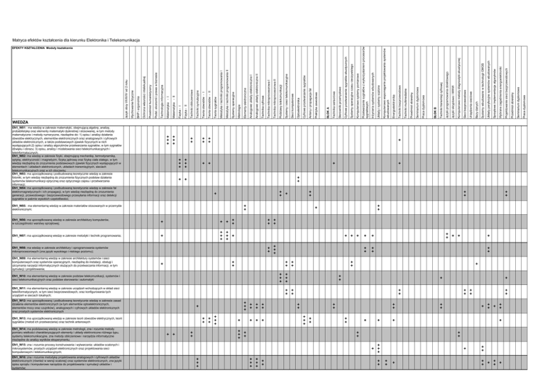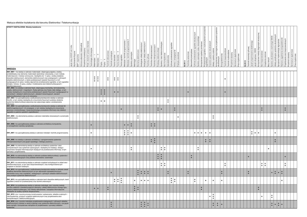 + ++ + ++ + + ++ + ++ + + + ++ ++ ++ + + ++ + ++ ++ + + ++ ++ + ++ ++ ++ + + + + +++ ++ +++ +++ ++ +++ ++ ++ ++ + ++ ++ ++ ++ ++ ++ ++ EN1_W15: zna i rozumie procesy konstruowania i wytwarzania: układów scalonych i mikrosystemów, prostych urządzeń elektronicznych oraz projektowania sieci komputerowych i telekomunikacyjnych; EN1_W16: zna i rozumie metodykę projektowania analogowych i cyfrowych układów elektronicznych (również w wersji scalonej) oraz systemów elektronicznych, zna języki opisu sprzętu i komputerowe narzędzia do projektowania i symulacji układów i systemów; +++ ++ + + + +++ ++ ++ + + EN1_W13: ma uporządkowaną wiedzę w zakresie teorii obwodów elektrycznych, teorii sygnałów (metod ich przetwarzania) oraz technik antenowych + ++ ++ +++ + EN1_W12: ma uporządkowaną i podbudowaną teoretycznie wiedzę w zakresie zasad działania elementów elektronicznych (w tym elementów optoelektronicznych, elementów mocy oraz czujników), analogowych i cyfrowych układów elektronicznych oraz prostych systemów elektronicznych +++ ++ ++ ++ ++ ++ EN1_W11: ma elementarną wiedzę w zakresie urządzeń wchodzących w skład sieci teleinformatycznych, w tym sieci bezprzewodowych, oraz konfigurowania tych urządzeń w sieciach lokalnych; EN1_W14: ma podstawową wiedzę w zakresie metrologii, zna i rozumie metody pomiaru wielkości charakteryzujących elementy i układy elektroniczne różnego typu, systemy telekomunikacyjne, zna metody obliczeniowe i narzędzia informatyczne niezbędne do analizy wyników eksperymentu; ++ ++ ++ +++ +++ EN1_W10: ma elementarną wiedzę w zakresie podstaw telekomunikacji, systemów i sieci telekomunikacyjnych oraz podstaw sterowania i automatyki + + + + ++ +++ + ++ EN1_W08: ma wiedzę w zakresie architektury i oprogramowania systemów mikroprocesorowych (zna języki wysokiego i niskiego poziomu); EN1_W09: ma elementarną wiedzę w zakresie architektury systemów i sieci komputerowych oraz systemów operacyjnych, niezbędną do instalacji, obsługi i utrzymania narzędzi informatycznych służących do przetwarzania informacji, w tym symulacji i projektowania; + + + ++ ++ + + ++ + +++ +++ + EN1_W07: ma uporządkowaną wiedzę w zakresie metodyki i technik programowania; + EN1_W06: ma uporządkowaną wiedzę w zakresie architektury komputerów, w szczególności warstwy sprzętowej; ++ EN1_W05: ma elementarną wiedzę w zakresie materiałów stosowanych w przemyśle elektronicznym; ++ + ++ + + + ++ + + +++ +++ ++ +++ +++ ++ ++ WIEDZA EN1_W01: ma wiedzę w zakresie matematyki, obejmującą algebrę, analizę, probabilistykę oraz elementy matematyki dyskretnej i stosowanej, w tym metody matematyczne i metody numeryczne, niezbędne do: 1) opisu i analizy działania obwodów elektrycznych, elementów elektronicznych oraz analogowych i cyfrowych układów elektronicznych, a także podstawowych zjawisk fizycznych w nich występujących;2) opisu i analizy algorytmów przetwarzania sygnałów, w tym sygnałów dźwięku i obrazu; 3) opisu, analizy i modelowania sieci telekomunikacyjnych i teleinformatycznych; EN1_W02: ma wiedzę w zakresie fizyki, obejmującą mechanikę, termodynamikę, optykę, elektryczność i magnetyzm, fizykę jądrową oraz fizykę ciała stałego, w tym wiedzę niezbędną do zrozumienia podstawowych zjawisk fizycznych występujących w elementach i układach elektronicznych, układach transmisyjnych, sieciach telekomunikacyjnych oraz w ich otoczeniu; EN1_W03: ma uporządkowaną i podbudowaną teoretycznie wiedzę w zakresie fotoniki, w tym wiedzę niezbędną do zrozumienia fizycznych podstaw działania systemów telekomunikacji optycznej oraz optycznego zapisu i przetwarzania informacji; EN1_W04: ma uporządkowaną i podbudowaną teoretycznie wiedzę w zakresie fal elektromagnetycznych i ich propagacji, w tym wiedzę niezbędną do zrozumienia generacji, przewodowego i bezprzewodowego przesyłania informacji oraz detekcji sygnałów w paśmie wysokich częstotliwości; Praca dyplomowa Seminarium dyplomowe Przedmiot obieralny Projektowanie sieci bezprzewodowych Wybrane zagadnienia energoelektroniki Sprzętowa implementacja algorytmów Układy peryferyjne systemów wbudowanych Systemy wbudowane w technologii CMOS Bazy danych Urządzenia sieciowe Sieci bezprzewodowe Komputerowe metody diagnostyki akustycznej Języki skryptowe i WWW Języki programowania obiektowego Techniki transmisji cyfrowej BLOK B Praca dyplomowa Seminarium dyplomowe Przedmiot obieralny Techniki multimedialne Techniki bezprzewodowe Energoelektronika Komputerowe wspomaganie projektowania systemów wbudowanych Układy i systemy scalone Inżynieria systemów wbudowanych Komputerowe systemy pomiarowe Systemy operacyjne czasu rzeczywistego Cyfrowe przetwarzanie sygnałów akustycznych Sterowniki przemysłowe Technika sensorowa BLOK A Praktyka zawodowa Anteny i propagacja fal Cyfrowe przetwarzanie sygnałów Optoelektronika Sieci komputerowe Systemy i sieci telekomunikacyjne Podstawy telekomunikacji Technika mikroprocesorowa II Technika mikroprocesorowa I Technika cyfrowa Analogowe układy elektroniczne II Analogowe układy elektroniczne I Elementy elektroniczne Metrologia Systemy operacyjne Metodyka i techniki programowania II Metodyka i techniki programowania I Teoria sygnałów Teoria obwodów - II Teoria obwodów - I Techniki symulacyjne Techniki obliczeniowe Fizyka - II Fizyka - I Matematyka - II Matematyka - I Technologia informacyjna Podst. ekonomii i prawa w biznesie Przedmiot humanistyczny Ochrona własności intelekualnej BHP i ergonomia Wychowanie fizyczne Język obcy I/II/III/IV od 2 roku EFEKTY KSZTALCENIA Moduły kształcenia Przetwarzanie sygnałów z wykorzystaniem procesorów sygnałowych Matryca efektów kształcenia dla kierunku Elektronika i Telekomunikacja Praca dyplomowa Seminarium dyplomowe Przedmiot obieralny Projektowanie sieci bezprzewodowych Wybrane zagadnienia energoelektroniki Sprzętowa implementacja algorytmów Układy peryferyjne s