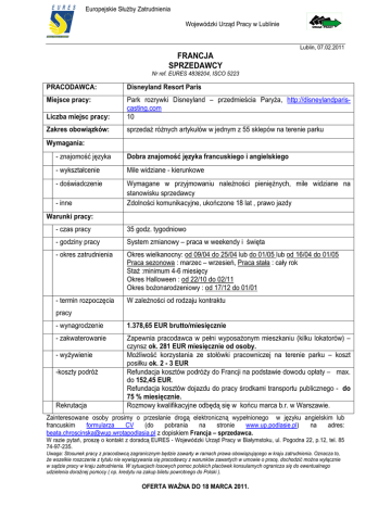 Europejskie SłuŜby Zatrudnienia Wojewódzki Urząd Pracy w Lublinie Lublin, 07.02.2011 FRANCJA SPRZEDAWCY Nr ref. EURES 4838204, ISCO 5223 PRACODAWCA: Disneyland Resort Paris Miejsce pracy: Liczba miejsc pracy: Park rozrywki Disneyland – przedmieścia ParyŜa, http://disneylandpariscasting.com 10 Zakres obowiązków: sprzedaŜ róŜnych artykułów w jednym z 55 sklepów na terenie parku Wymagania: - znajomość języka Dobra znajomość języka francuskiego i angielskiego - wykształcenie Mile widziane - kierunkowe - doświadczenie Wymagane w przyjmowaniu naleŜności pienięŜnych, mile widziane na stanowisku sprzedawcy Zdolności komunikacyjne, ukończone 18 lat , prawo jazdy - inne Warunki pracy: - czas pracy 35 godz. tygodniowo - godziny pracy System zmianowy – praca w weekendy i święta - okres zatrudnienia Okres wielkanocny: od 09/04 do 25/04 lub do 01/05 lub od 16/04 do 01/05 Praca sezonowa : marzec – wrzesień, Praca stała : cały rok StaŜ :minimum 4-6 miesięcy Okres Halloween : od 22/10 do 02/11 Okres boŜonarodzeniowy : od 17/12 do 01/01 - termin rozpoczęcia W zaleŜności od rodzaju kontraktu pracy - wynagrodzenie 1.378,65 EUR brutto/miesięcznie - zakwaterowanie Zapewnia pracodawca w pełni wyposaŜonym mieszkaniu (kilku lokatorów) – czynsz ok. 281 EUR miesięcznie od osoby. MoŜliwość korzystania ze stołówki pracowniczej na terenie parku – koszt posiłku ok. 2 - 3 EUR Refundacja kosztów podróŜy do Francji na podstawie dowodu opłaty – max. do 152,45 EUR. Refundacja kosztów dojazdu do pracy środkami transportu publicznego - do 75 % miesięcznie. Rozmowy kwalifikacyjne odbędą się w końcu marca b.r. w Warszawie. - wyŜywienie -koszty podróŜ Rekrutacja Zainteresowane osoby prosimy o przesłanie drogą elektroniczną wypełnionego w języku angielskim lub francuskim formularza CV (do pobrania na stronie www.up.podlasie.pl) na adres: [email protected] z dopiskiem Francja – sprzedawca. W razie pytań, proszę o kontakt z doradcą EURES - Wojewódzki Urząd Pracy w Białymstoku, ul. Pogodna 22, p.12, tel. 85 74-97-235. Uwaga: Stosunek pracy z pracodawcą zagranicznym będzie zawarty w ramach prawa obowiązującego w kraju zatrudnienia. Oznacza to, Ŝe wszelkie roszczenie z tytułu nie wywiązywania się pracodawcy z warunków zawartych w umowie o pracę, dochodzić moŜna wyłącznie w sądzie pracy w kraju zatrudnienia. W sytuacjach losowych pomoc polskich placówek konsularnych ogranicza się do ewentualnego udzielenia doraźnej pomocy ( np. kredytu na zakup biletu powrotnego do Polski ). OFERTA WAśNA DO 18 MARCA 2011.