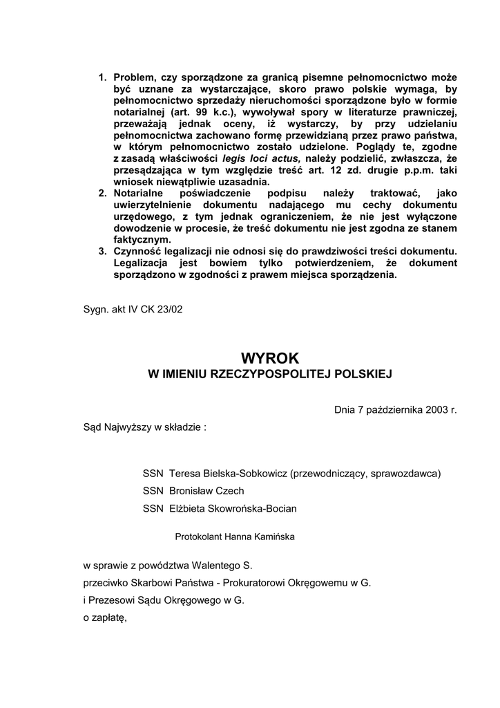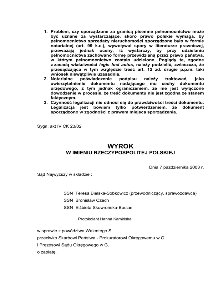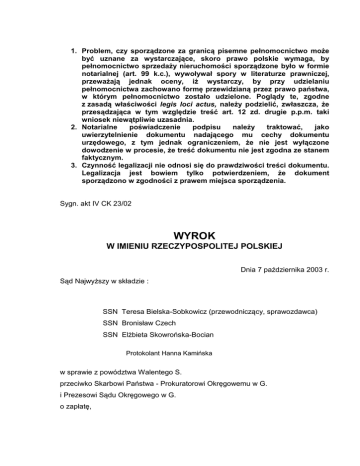 1. Problem, czy sporządzone za granicą pisemne pełnomocnictwo może być uznane za wystarczające, skoro prawo polskie wymaga, by pełnomocnictwo sprzedaży nieruchomości sporządzone było w formie notarialnej (art. 99 k.c.), wywoływał spory w literaturze prawniczej, przeważają jednak oceny, iż wystarczy, by przy udzielaniu pełnomocnictwa zachowano formę przewidzianą przez prawo państwa, w którym pełnomocnictwo zostało udzielone. Poglądy te, zgodne z zasadą właściwości legis loci actus, należy podzielić, zwłaszcza, że przesądzająca w tym względzie treść art. 12 zd. drugie p.p.m. taki wniosek niewątpliwie uzasadnia. 2. Notarialne poświadczenie podpisu należy traktować, jako uwierzytelnienie dokumentu nadającego mu cechy dokumentu urzędowego, z tym jednak ograniczeniem, że nie jest wyłączone dowodzenie w procesie, że treść dokumentu nie jest zgodna ze stanem faktycznym. 3. Czynność legalizacji nie odnosi się do prawdziwości treści dokumentu. Legalizacja jest bowiem tylko potwierdzeniem, że dokument sporządzono w zgodności z prawem miejsca sporządzenia. Sygn. akt IV CK 23/02 WYROK W IMIENIU RZECZYPOSPOLITEJ POLSKIEJ Dnia 7 października 2003 r. Sąd Najwyższy w składzie : SSN Teresa Bielska-Sobkowicz (przewodniczący, sprawozdawca) SSN Bronisław Czech SSN Elżbieta Skowrońska-Bocian Protokolant Hanna Kamińska w sprawie z powództwa Walentego S. przeciwko Skarbowi Państwa - Prokuratorowi Okręgowemu w G. i Prezesowi Sądu Okręgowego w G. o zapłatę, 2 po rozpoznaniu na rozprawie w Izbie Cywilnej w dniu 7 października 2003 r., kasacji powoda od wyroku Sądu Apelacyjnego w G. […], oddala kasację i wniosek o przyznanie kosztów pomocy prawnej udzielonej z urzędu. Uzasadnienie Wyrokiem z dnia 24 lipca 2001 r. Sąd Apelacyjny w G. oddalił apelację powoda Walentego S. przeciwko Skarbowi Państwa – Prezesowi Sądu Okręgowego w G. i Prokuratorowi Okręgowemu w G. o odszkodowanie i zadośćuczynienie. Z dokonanych w sprawie ustaleń wynika, że powód oraz jego żona Katarzyna S. pozostawali w związku małżeńskim do lipca 1989 r. Byli oni właścicielami zabudowanej nieruchomości położonej w R. W dniu 24 kwietnia 1989 r. powód, pełnomocnictwa przebywający w formie wówczas pisemnej do w Niemczech, udzielił sprzedaży nieruchomości. tej żonie Pełnomocnictwo zostało okazane notariuszowi w miejscowości Kempen w RFN, który poświadczył podpis powoda. W dniu 26 listopada 1991 r. Katarzyna S. w Państwowym Biurze Notarialnym w G., działając w imieniu własnym i jako pełnomocnik powoda, zawarła umowę sprzedaży tej nieruchomości z Marianem O.. Po kilku miesiącach zawarła, również w formie aktu notarialnego, umowę kupna tej nieruchomości od Mariana O., tym razem działając wyłącznie w swoim imieniu. Katarzyna S. sprzedała całą nieruchomość Marianowi O., posługując się pełnomocnictwem, które w dacie tej czynności prawnej wygasło. Powód bowiem 3 pełnomocnictwo to odwołał i o tym fakcie powiadomił byłą żonę, a niezależnie od tego wysłał do Państwowego Biura Notarialnego w Wejherowie listem poleconym informację w tym przedmiocie. Pismo powoda do PBN dotarło, ale nie zostało zarejestrowane i nie złożono go do akt księgi wieczystej nieruchomości. Gdy powód dowiedział się o sprzedaży nieruchomości, wytoczył powództwo o uznanie umowy za nieważną. Powództwo jego uwzględnione zostało – w części dotyczącej sprzedaży udziału ½ w nieruchomości - wyrokiem Sądu Wojewódzkiego w G. z dnia 12 października 1995 r. Powód nie odzyskał posiadania nieruchomości, ponieważ w toku postępowania egzekucyjnego prowadzonego przeciwko Katarzynie S. nieruchomość sprzedana została na licytacji. Powód nie podejmował w toku tego postępowania żadnych czynności procesowych, nie wnosił też o wyłączenie nieruchomości spod egzekucji. Powód nie wszczął postępowania o podział majątku dorobkowego. Złożył natomiast do Prokuratury Okręgowej w G. zawiadomienie o popełnieniu przestępstwa na jego szkodę przeciwko byłej żonie, Marianowi O. i sporządzającemu umowę sprzedaży nieruchomości notariuszowi Henrykowi Mizakowi. Prowadzone postępowanie zakończyło się umorzeniem wobec niestwierdzenia przestępstwa. Sąd Okręgowy uznał, że zaniedbanie włączenia do akt księgi wieczystej pisma powoda, zawierającego odwołanie pełnomocnictwa, obciąża pracowników PBN. Zaniedbanie to nie oznacza jednak, że Skarb Państwa – Prezes Sądu Okręgowego w G. ponosi odpowiedzialność za doznaną przez powoda szkodę. Powód nie wykazał bowiem spełnienia określonych w art. 417 k.c. przesłanek odpowiedzialności Skarbu Państwa, to jest zawinionego działania, szkody i związku przyczynowego. O poniesieniu szkody nie może być mowy tak długo, jak długo powód nie przeprowadzi postępowania o podział majątku dorobkowego. Powód ma skuteczne roszczenie względem Katarzyny S. i z nią powinien się rozliczyć. Szkodę powód poniósłby tylko wtedy, gdyby w podziale majątku nie uzyskał stosownego zaspokojenia odpowiadającego wartości jego udziału w nieruchomości. Za niezasadne uznał też Sąd Okręgowy żądanie zapłaty skierowane przeciwko Skarbowi Państwa – Prokuratorowi Okręgowemu w G., powód nie wykazał bowiem, aby na skutek działań funkcjonariuszy prowadzących 4 postępowanie karne doznał uszczerbku na zdrowiu albo cierpień moralnych lub fizycznych, brak więc podstaw do zasądzenia zadośćuczynienia i odszkodowania z tego tytułu. Sąd Apelacyjny w znacznej mierze podzielił ustalenia i oceny prawne poczynione przez Sąd pierwszej instancji. Nie uznał jednak, by pracownicy PBN wyrządzili powodowi szkodę na skutek niezłożenia pisma zawierającego odwołanie pełnomocnictwa do akt księgi wieczystej, bowiem takiego obowiązku nie ma. Ponadto, pełnomocnictwo do sprzedaży nieruchomości, jakim posługiwała się Katarzyna S., nie budzi