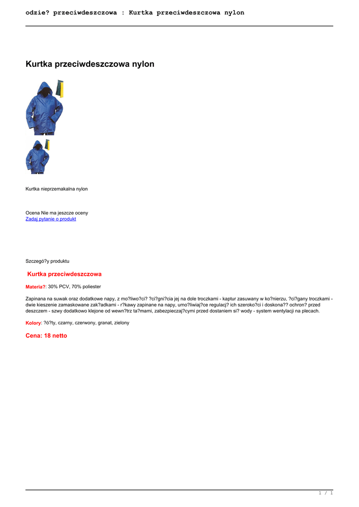 odzie? przeciwdeszczowa : Kurtka przeciwdeszczowa nylon Kurtka przeciwdeszczowa nylon Kurtka nieprzemakalna nylon Ocena Nie ma jeszcze oceny Zadaj pytanie o produkt Szczegó?y produktu Kurtka przeciwdeszczowa Materia?: 30% PCV, 70% poliester Zapinana na suwak oraz dodatkowe napy, z mo?liwo?ci? ?ci?gni?cia jej na dole troczkami - kaptur zasuwany w ko?nierzu, ?ci?gany troczkami dwie kieszenie zamaskowane zak?adkami - r?kawy zapinane na napy, umo?liwiaj?ce regulacj? ich szeroko?ci i doskona?? ochron? przed deszczem - szwy dodatkowo klejone od wewn?trz ta?mami, zabezpieczaj?cymi przed dostaniem si? wody - system wentylacji na plecach. Kolory: ?ó?ty, czarny, czerwony, granat, zielony Cena: 18 netto 1 / 1 Powered by TCPDF (www.tcpdf.org)