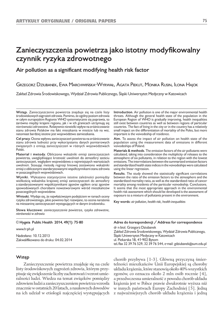 Dziubanek G i wsp. Zanieczyszczenia powietrza jakopapers istotny modyfikowalny czynnik ryzyka zdrowotnego Artykuły oryginalne / original 75 Zanieczyszczenia powietrza jako istotny modyfikowalny czynnik ryzyka zdrowotnego Air pollution as a significant modifying health risk factor Grzegorz Dziubanek, Ewa Marchwińska-Wyrwał, Agata Piekut, Monika Rusin, Ilona Hajok Zakład Zdrowia Środowiskowego, Wydział Zdrowia Publicznego, Śląski Uniwersytet Medyczny w Katowicach Wstęp. Zanieczyszczenie powietrza znajduje się na czele listy środowiskowych zagrożeń zdrowia. Pomimo, że ogólny poziom zdrowia w całym europejskim Regionie WHO systematycznie się poprawia, to zarówno między krajami regionu, jak i w ich granicach utrzymują się nierówności zdrowotne. Relatywnie niewielki wpływ na zróżnicowanie stanu zdrowia Polaków ma fakt mieszkania w mieście lub na wsi, natomiast bardziej istotne jest województwo zamieszkania. Cel pracy. Ocena wpływu zanieczyszczeń powietrza na zróżnicowanie stanu zdrowia ludności przy wykorzystaniu danych pomiarowych związanych z emisją zanieczyszczeń w różnych województwach Polski. Materiał i metody. Obliczono wskaźniki emisji zanieczyszczeń powietrza, uwzględniające krotność uwolnień do atmosfery sześciu zanieczyszczeń, względem województwa o najmniejszych wartościach uwolnień. Stosując metodę regresji liniowej zestawiono wskaźniki emisji z obliczonymi standaryzowanymi współczynnikami stanu zdrowia w poszczególnych województwach. Wyniki. Wykazano statystycznie istotne zależności pomiędzy wielkością wskaźnika krajowej emisji zanieczyszczeń do atmosfery a standaryzowanymi współczynnikami zgonów ogółem oraz zgonów spowodowanych chorobami nowotworowymi wśród mieszkańców poszczególnych województw. Wnioski. Wydaje się, że najwłaściwszym podejściem w ramach oceny ryzyka zdrowotnego, jakie powinno być rozwijane, to ocena narażenia na mieszaninę zanieczyszczeń występujących w danym środowisku. Introduction. Air pollution is one of the major environmental health threats. Although the general health state of the population in the European Region of WHO is gradually improving, health inequalities still exist between countries as well as between regions of particular countries. The fact of living in the city or in the country has a relatively small impact on the differentiation of mortality of the Poles, but more important is the voivodeship of residence. Aim. To assess the impact of air pollution on health state of the population using the measurement data of emissions in different voivodeships of Poland. Materials & methods. The emission factors of the air pollutants were calculated, taking into consideration the multiplicity of releases to the atmosphere of six pollutants, in relation to the region with the lowest emissions. The interrelations between the summarized emission factors and standardized health state indices in the voivodeships were calculated using the linear regression. Results. The study showed the statistically significant correlations between the ratio of the emission factors to the atmosphere and the standardized mortality ratio, as well as the standardized ratio of cancer mortality among residents of the particular voivodeship. Conclusions. It seems that the most appropriate approach in the environmental health risk assessment which should be developed is the assessment of exposure to a mixture of pollutants present in the environment. Key words: air pollution, health risk, health inequalities Słowa kluczowe: zanieczyszczenie powietrza, ryzyko zdrowotne, nierówności w zdrowiu © Hygeia Public Health 2014, 49(1): 75-80 Adres do korespondencji / Address for correspondence www.h-ph.pl dr n biol. Grzegorz Dziubanek Zakład Zdrowia Środowiskowego, Wydział Zdrowia Publicznego, Śląski Uniwersytet Medyczny w Katowicach ul. Piekarska 18, 41-902 Bytom tel./fax 32 39 76 529, 32 39 76 544, e-mail: [email protected] Nadesłano: 10.12.2013 Zakwalifikowano do druku: 04.02.2014 Wstęp Zanieczyszczenie powietrza znajduje się na czele listy środowiskowych zagrożeń zdrowia, którym przypisuje się zwiększenie liczby zachorowań i wzrost umieralności ludzi. Wiedza na temat związków pomiędzy zdrowiem ludzi a zanieczyszczeniem powietrza wzrosła znacznie w ostatnich 20 latach, a naukowych dowodów na ich udział w etiologii najczęściej występujących chorób przybywa [1-3]. Główną przyczyną śmiertelności mieszkańców Unii Europejskiej są choroby układu krążenia, które stanowią około 40% wszystkich zgonów, co oznacza około 2 mln osób rocznie [4], a przedwczesna umieralność z powodu chorób układu krążenia jest w Polsce prawie dwukrotnie wyższa niż w innych państwach Europy Zachodniej [5]. Jedną z najważniejszych chorób układu krążenia i jedną Hygeia Public Health 2014, 49(1): 75-80 76 Cel pracy Ocena wpływu zanieczyszczeń powietrza na zróżnicowanie stanu zdrowia ludności przy wykorzystaniu danych pomiarowych związanych z emisją zanieczyszczeń w różnych regionach Polski. Materiał i metody Korzystając z wyników wieloletnich badań emisji podstawowych zanieczyszczeń w układzie województw [22] obliczono wskaźniki emisji zanieczyszczeń powietrza, uwzględniające krotność uwolnień do atmosfery takich zanieczyszczeń, jak: dwutlenek siarki, tlenki azotu, pył, kadm, ołów i rtęć w latach 2002-2005 względem województwa o najmniejszych wartościach uwolnień. Uzyskane w ten sposób wskaźniki emisji dla poszczególnych związków zsumowano otrzymując łączny wskaźnik emisji sześciu rozpatrywanych związków. Wskaźniki emisji zestawiono z obliczonymi na podstawie danych GUS (Głównego Urzędu Statystycznego) [23] standaryzowanymi współczynnikami zgonów ogółem, zgonów wywołanych chorobami układu sercowo-naczyniowego oraz zgonów wywołanych chorobami nowotworowymi w poszczególnych województwach. Zależności obliczono 