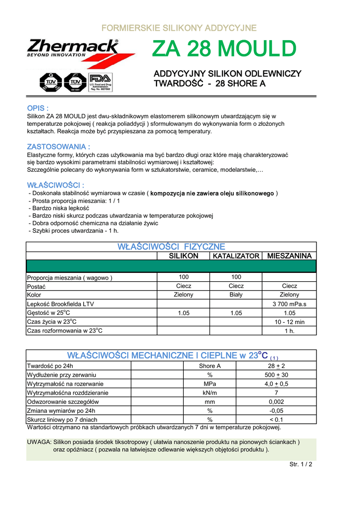 FORMIERSKIE SILIKONY ADDYCYJNE ZA 28 MOULD ADDYCYJNY SILIKON ODLEWNICZY TWARDOŚĆ - 28 SHORE A OPIS : Silikon ZA 28 MOULD jest dwu-składnikowym elastomerem silikonowym utwardzającym się w temperaturze pokojowej ( reakcja poliaddycji ) sformułowanym do wykonywania form o złożonych kształtach. Reakcja może być przyspieszana za pomocą temperatury. ZASTOSOWANIA : Elastyczne formy, których czas użytkowania ma być bardzo długi oraz które mają charakteryzować się bardzo wysokimi parametrami stabilności wymiarowej i kształtowej: Szczególnie polecany do wykonywania form w sztukatorstwie, ceramice, modelarstwie,… WŁAŚCIWOŚCI : - Doskonała stabilność wymiarowa w czasie ( kompozycja nie zawiera oleju silikonowego ) - Prosta proporcja mieszania: 1 / 1 - Bardzo niska lepkość - Bardzo niski skurcz podczas utwardzania w temperaturze pokojowej - Dobra odporność chemiczna na działanie żywic - Szybki proces utwardzania - 1 h. WŁAŚCIWOŚCI FIZYCZNE Proporcja mieszania ( wagowo ) Postać Kolor Lepkość Brookfielda LTV Gęstość w 25oC Czas życia w 23oC Czas rozformowania w 23oC SILIKON KATALIZATOR MIESZANINA 100 Ciecz Zielony 100 Ciecz Biały Ciecz Zielony 1.05 1.05 3 700 mPa.s 1.05 10 - 12 min 1 h. WŁAŚCIWOŚCI MECHANICZNE I CIEPLNE w 23o C ( 1 ) Twardość po 24h Shore A 28 + 2 Wydłużenie przy zerwaniu % 500 + 30 Wytrzymałość na rozerwanie MPa 4,0 + 0,5 Wytrzymałośćna rozddzieranie kN/m 7 Odwzorowanie szczegółów mm 0,002 Zmiana wymiarów po 24h % -0,05 Skurcz liniowy po 7 dniach % < 0.1 Wartości otrzymano na standartowych próbkach utwardzanych 7 dni w temperaturze pokojowej. UWAGA: Silikon posiada środek tiksotropowy ( ułatwia nanoszenie produktu na pionowych ściankach ) oraz opóźniacz ( pozwala na łatwiejsze odlewanie większych objętości produktu ). Str. 1 / 2 FORMIERSKIE SILIKONY ADDYCYJNE ZA 28 MOULD ADDYCYJNY SILIKON ODLEWNICZY TWARDOŚĆ - 28 SHORE A WYTYCZNE STOSOWANIA : Ujednorodnić oba składniki ( bazę i katalizator ) przed każdym użyciem Odważyć żywicę oraz katalizator i mieszać całość przez ok. 1 minutę - nie zapomnieć o wybraniu produktu z naroży pojemnika - używać pojemników o gładkich ściankach - najlepiej bez naroży. Oba komponenty powinny być bardzo dokładnie wymieszane ze sobą za pomocą miksera elektrycznego lub pneumatycznego używając wolnych obrotów tak aby nie wprowadzić pęcherzy powietrza oraz aby nie wzrosła temperatura mieszaniny. Oczywiście mieszanie można również przeprowadzić ręcznie. Produkt może być odlewany grawitacyjnie lub w komorze próżniowej, ZA 28 MOULD jest dużo łatwiejszy do odlewania niż inne silikony RTV ponieważ lepkość jego komponentów wzrasta stosunkowo wolno.Wlać produkt do formy, nie podgrzewać mieszaniny do temperatury wyższej niż 35oC. Tiksotrop dodawać do mieszaniny lub silikonu ( bazy ) w ilości wynoszącej 1 - 2 % całości ( wagowo ). Opóźniacz dodawać do silikonu ( bazy ) w ilości ok. 0,05 % całości ( wagowo ) - 5 g na 10 kg. Dawka maksymalna wynosi 0,15 % - produkt po utwardzeniu może mieć lekko obniżoną twardość. BEZPIECZEŃSTWO I HIGIENA PRACY : Zwykłe środki bezpieczeństwa powinny być zachowane podczas pracy z tym produktem: Materiał nie jest klasyfikowany jako preparat niebezpieczny. PRZECHOWYWANIE : Okres składowania wynosi 18 miesięcy w oryginalnych nie otwieranych pojemnikach przechowywanych w temperaturze pomiędzy 5 i 27oC. Zamykać pojemniki po każdym użyciu, nie pomylić zakrętek między silikonem a katalizatorem. UWAGI : Dopuszcza się podgrzewanie ZA 28 MOULD aby przyspieszyć utwardzanie jednakże wywołuje to wyższy skurcz. Poliaddycyjne elastomery silikonowe wykazują dużą wrażliwość na działanie niektórych substancji takich jak : aminy, sulfydy, różne typy katalizatorów do silikonów innych typów, szpachle poliestrowe, pasty modelowe, inne silikony ). Nieodwracalnym efektem tego zjawiska ( inhibicji ) jest lepka powierzchnia silikonu, który miał kontakt z inhibitorem. W przypadku wątpliwości należy dokonać próby wylewając mieszaninę na niewielki fragment powierzchni, którą podejrzewamy, że jest zabrudzona inhibitorem. Powierzchnia modelu musi być idealnie czysta ( brak pozostałości tłustych zanieczyszczeń ) i sucha. OPAKOWANIA : SILIKON KATALIZATOR GWARANCJA : 25,00 kg 200,00 kg 25,00 kg 200,00 kg Wszystkie informacje zawarte powyżej są rezultatem badań i testów przeprowadzonych w naszym laboratorium w ściśle określonych warunkach. Użytkownik ponosi pełną odpowiedzialność za określenie przydatności wybranego produktu ( przed dokonaniem zakupu ) do proponowanego zastosowania. Gwarantujemy zgodność produktu z jego specyfikacją, lecz nie możemy zagwarantować jego kompatybilności z jakimkolwiek szczególnym zastosowaniem. Odrzucamy jakąkolwiek odpowiedzialność za zniszczenia lub wypadki, które spowodowane zostały użyciem jego produktów. Odpowiedzialność jest ściśle ograniczona do zwrotu pieniędzy lub wymiany produktu nie zgodnego z jego specyfikacją. Str. 2 / 2 Przedstawiciel w Polsce : AMOD - Andrzej Modrzewski 01-793 Warszawa ul. Rydygiera 8 tel. / fax. ( 0-22 ) 633-85-06 tel. ( 0-22 ) 669-39-76 tel. komórkowy ( 0-602 ) 26-11-15 INTERNET: www.amod.pl e-mail:[email protected]