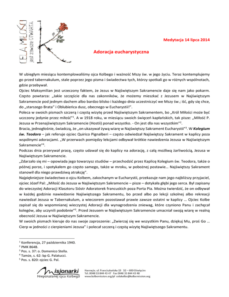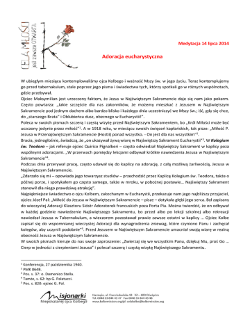 Medytacja 14 lipca 2014 Adoracja eucharystyczna W ubiegłym miesiącu kontemplowaliśmy ojca Kolbego i ważność Mszy św. w jego życiu. Teraz kontemplujemy go przed tabernakulum, stale poprzez jego pisma i świadectwa tych, którzy spotkali go w różnych wspólnotach, gdzie przebywał. Ojciec Maksymilian jest urzeczony faktem, że Jezus w Najświętszym Sakramencie daje się nam jako pokarm. Często powtarza: „Jakie szczęście dla nas zakonników, że możemy mieszkać z Jezusem w Najświętszym Sakramencie pod jednym dachem albo bardzo blisko i każdego dnia uczestniczyć we Mszy św.; iść, gdy się chce, do „starszego Brata” i Oblubieńca dusz, obecnego w Eucharystii!”. Poleca w swoich pismach szczerą i częstą wizytę przed Najświętszym Sakramentem, bo „Król Miłości może być uczczony jedynie przez miłość”1. A w 1918 roku, w miesiącu swoich święceń kapłańskich, tak pisze: „Miłość P. Jezusa w Przenajświętszym Sakramencie (Hostii) ponad wszystko. - On jest dla nas wszystkim”2. Bracia, jednogłośnie, świadczą, że „on ukazywał żywą wiarę w Najświętszy Sakrament Eucharystii”3. W Kolegium św. Teodora – jak referuje ojciec Quirico Pignalberi – często odwiedzał Najświętszy Sakrament w kaplicy poza wspólnymi adoracjami. „W przerwach pomiędzy lekcjami odbywał krótkie nawiedzenia Jezusa w Najświętszym Sakramencie”4. Podczas dnia przerywał pracę, często udawał się do kaplicy na adorację, z całą możliwą żarliwością, Jezusa w Najświętszym Sakramencie. „Zdarzało się mi – opowiada jego towarzysz studiów – przechodzić przez Kaplicę Kolegium św. Teodora, także o późnej porze, i spotykałem go często samego, także w mroku, w pobożnej postawie… Najświętszy Sakrament stanowił dla niego prawdziwą atrakcję”. Najpiękniejsze świadectwo o ojcu Kolbem, zakochanym w Eucharystii, przekazuje nam jego najbliższy przyjaciel, ojciec Józef Pal: „Miłość do Jezusa w Najświętszym Sakramencie – pisze – dotykała głębi jego serca. Był zapisany do wieczystej Adoracji Klasztoru Sióstr Adoratorek francuskich poza Porta Pia. Można twierdzić, że on odbywał w każdej godzinie nawiedzenie Najświętszego Sakramentu, bo przed albo po lekcji szkolnej albo rekreacji nawiedzał Jezusa w Tabernakulum, a wieczorem pozostawał prawie zawsze ostatni w kaplicy … Ojciec Kolbe zapisał się do wspomnianej wieczystej Adoracji dla wynagrodzenia zniewag, które czyniono Panu i zachęcał kolegów, aby uczynili podobnie”5. Przed Jezusem w Najświętszym Sakramencie umacniał swoją wiarę w realną obecność Jezusa w Najświętszym Sakramencie. W swoich pismach kieruje do nas swoje zaproszenie: „Zwierzaj się we wszystkim Panu, dziękuj Mu, proś Go … Cierp w jedności z cierpieniami Jezusa” i polecał szczerą i częstą wizytę Najświętszego Sakramentu. 1 Konferencja, 27 października 1940. PMK 864B. 3 Pos. s. 37: o. Domenico Stella. 4 Tamże, s. 62: bp G. Palatucci. 5 Pos. s. 820: ojciec G. Pal. 2 Jednogłośna jest ocena braci z Niepokalanowa odnośnie wiary i miłości ojca Kolbego do Eucharystii: „Celebrował z maksymalnym skupieniem i wzruszeniem”. Także tutaj robi często adorację Najświętszego Sakramentu i żywo poleca ją swoim braciom, nazywając te wizyty „audiencją u Wielkiego Króla”. Odwiedzał często Jezusa w tabernakulum i mówił: „Tutaj jest nasza siła, tutaj jest źródło naszego uświęcenia”. Podczas adoracji Najświętszego Sakramentu, dodaje br. Ferdynand Kasz, „był tak całkowicie zanurzony w modlitwie, że nie widział nikogo”6. „Trzeba było najpierw wstrząsnąć go, aby poinformować go o jakiejś pilnej sprawie do załatwienia. Wtedy, od razu, udawał się tam, gdzie wzywało go posłuszeństwo albo miłość bliźniego”7. Dopiero podczas wojny, zaraz po powrocie z pierwszego uwięzienia (1939), mógł zrealizować marzenie swojego życia: codzienną adorację Najświętszego Sakramentu. Gdy towarzyszył gościom podczas wizyty Niepokalanowa, zaczynał ją albo kończył w kaplicy, aby pozdrowić „Gospodarza domu”. Pokazując im zakonników, którzy adorowali Najświętszy Sakrament, mówił: „Oto najważniejszy dział pracy w klasztorze!”. Także gdy udawał się na głoszenie rekolekcji – jak informuje nas ks. Obidziński – w jego parafii w Pawłowicach, „zawsze udawał się do kościoła na adorację Najświętszego Sakramentu, także przez piętnaście minut”. Podobnie w Zakopanem, jak referuje s. Felicyta Sulatycka, „ojciec Kolbe skupiał się i modlił przed Najświętszym Sakramentem”. W Nagasaki była kaplica, która pociągała serce ojca Kolbego i także tutaj nawiedzał Najświętszy Sakrament w ciągu dnia i nocy, jak referuje nam ojciec Korneli Czupryk, gwardian Mugenzai no Sono w latach 1933-36. Japończycy byli zbudowani jego pobożnością eucharystyczną. Oto świadectwa niektórych jego uczniów: „Zachowanie ojca Kolbego przed Najświętszym Sakramentem jasno ukazywało wiarę w rzeczywistą obecność Jezusa. Często, choćby krótko, i najpobożniej, nawiedzał Najświętszą Eucharystię”8. „Jego twarz wobec Najświętszego Sakramentu pokazywała, że on widział żywego Chrystusa”9. Prof. Paweł Nagai wspomina, że „Kolbe często odwiedzał Najświętszy Sakrament i zachęcał innych, aby czynili podobnie”10. Biskup January Hayasaka oświadcza: „Miał mocną wiarę w Najświętszą Eucharystię. Zwykle, przed podjęciem rozmowy z jakąś osobą, trwał na medytacji przed Najświętszym Sakramentem”11. Różne i zgodne świadectwa potwierdzają, że ojciec Maksymilian adorował Jezusa w Najświętszym Sakramencie i duchowo się umacniał, aby stawić czoła wielu problemom misyjnego życia. Jedynie dzięki Eucharystii św. Maksymilian mógł wytrwać w Japonii i rozwinąć owocną działalność misyjną. Angela dla Wspólnoty 6 Pos. s. 497. Br. D. Klunejko. 8 Ks. M. Iwanga Shi