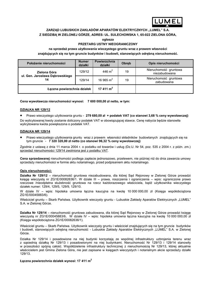 ZARZĄD LUBUSKICH ZAKŁADÓW APARATÓW ELEKTRYCZNYCH „LUMEL” S.A. Z SIEDZIBĄ W ZIELONEJ GÓRZE, ADRES: UL. SULECHOWSKA 1, 65-022 ZIELONA GÓRA, ogłasza PRZETARG USTNY NIEOGRANICZONY na sprzedaż prawa użytkowania wieczystego gruntu wraz z prawem własności znajdujących się na tym gruncie budynków i budowli, stanowiących odrębną nieruchomość. Położenie nieruchomości Numer działki Powierzchnia działki Zielona Góra ul. Gen. Jarosława Dąbrowskiego 14 129/12 446 m 129/14 16 965 m Łączna powierzchnia działek Cena wywoławcza nieruchomości wynosi: Obręb Opis nieruchomości 2 19 Nieruchomość gruntowa niezabudowana 2 19 Nieruchomość gruntowa zabudowana 17 411 m 2 7 600 000,00 zł netto, w tym: DZIAŁKA NR 129/12 Prawo wieczystego użytkowania gruntu - 279 680,00 zł + podatek VAT (co stanowi 3,68 % ceny wywoławczej) Do wylicytowanej kwoty zostanie doliczony podatek VAT w obowiązującej stawce. Cenę nabycia będzie stanowiła wylicytowana kwota powiększona o podatek VAT. DZIAŁKA NR 129/14 Prawo wieczystego użytkowania gruntu wraz z prawem własności składników budowlanych znajdujących się na tym gruncie - 7 320 320,00 zł netto (co stanowi 96,32 % ceny wywoławczej) Zgodnie z ustawą z dnia 11 marca 2004 r. o podatku od towarów i usług (Dz.U. Nr 54, poz. 535 z 2004 r. z późn. zm.) sprzedaż nieruchomości 129/14 zwolniona jest z podatku VAT. Cena sprzedawanej nieruchomości podlega zapłacie jednorazowo, przelewem, nie później niż do dnia zawarcia umowy sprzedaży nieruchomości w formie aktu notarialnego, przed podpisaniem aktu notarialnego. Opis nieruchomości: Działka Nr 129/12 – nieruchomość gruntowa niezabudowana, dla której Sąd Rejonowy w Zielonej Górze prowadzi księgę wieczystą nr ZG1E/00082636/1. W dziale III – prawa, roszczenia i ograniczenia – wpis: ograniczone prawo rzeczowe /nieodpłatna służebność gruntowa na rzecz każdorazowego właściciela, bądź użytkownika wieczystego działek numer: 129/4, 129/5, 129/9, 129/10. W dziale IV – wpis: hipoteka umowna łączna kaucyjna na kwotę 10 000 000,00 zł (Księga współobciążona ZG1E/00045883/6). Właściciel gruntu – Skarb Państwa. Użytkownik wieczysty gruntu - Lubuskie Zakłady Aparatów Elektrycznych „LUMEL” S.A. w Zielonej Górze. Działka Nr 129/14 – nieruchomość gruntowa zabudowana, dla której Sąd Rejonowy w Zielonej Górze prowadzi księgę wieczystą nr ZG1E/00045883/6. W dziale IV – wpis: hipoteka umowna łączna kaucyjna na kwotę 10 000 000,00 zł (Księga współobciążona ZG1E/00082636/1). Właściciel gruntu – Skarb Państwa. Użytkownik wieczysty gruntu i właściciel znajdujących się na tym gruncie budynków i budowli, stanowiących odrębną nieruchomość - Lubuskie Zakłady Aparatów Elektrycznych „LUMEL” S.A. w Zielonej Górze. Działka Nr 129/14 i posadowione na niej budynki korzystają ze wspólnej infrastruktury uzbrojenia terenu wraz z sąsiednią działką Nr 129/13 i posadowionymi na niej budynkami. Nieruchomość Nr 129/13 i 129/14 stanowiły w przeszłości spójną całość. Współdzielenie infrastruktury technicznej z nieruchomością Nr 129/13, której aktualnie właścicielem jest Gmina Zielona Góra, nie jest zapisane w księgach wieczystych i notarialnym akcie sprzedaży działki 129/13. Łączna powierzchnia działek wynosi: 17 411 m 2 Nieruchomość położona jest w strefie śródmiejskiej, w niewielkiej odległości od centrum handlowo-usługowego i kulturalnego miasta oraz od ośrodków administracji miasta i województwa. Stan zagospodarowania otoczenia: zabudowa mieszkalna wielorodzinna, usługowo–handlowa i zabudowa przemysłowa. Teren utwardzony, trwale ogrodzony, zabudowany obiektami produkcyjno - magazynowo - administracyjnymi o łącznej 2 powierzchni użytkowej zapisanej w książce obiektu budowlanego 9 625 m . Wyposażony w infrastrukturę techniczną: sieć wodociągowo-kanalizacyjną, elektryczną, gazową i telefoniczną. Na działce nr 129/14 znajdują się budynki: Lp. Wyszczególnienie Nr inw. Powierzchnia użytkowa 2 [m ] 1. Budynek przemysłowy 1.3 158 2. Budynek przemysłowy 1.5 264 3. Budynek przemysłowy 1.6 568 4. Budynek przemysłowy 1.7 509 5. Budynek przemysłowy 1.13 730 6. Budynek przemysłowy 1.18 1819 7. Budynek podstacji transformatorowej 1.50 98 8. Budynek socjalny 1.52 796 9. Budynek odlewni 1.56 641 10. Budynek kotłowni 1.57 390 11. Przybudówka do kotłowni 1.90 216 12. Hala produkcyjna 1.92 1187 13. Przybudówka do hali 1.93 250 14. Budynek przemysłowy 1.117 347 Powierzchnia użytkowa budynków 7973 15. Wiata magazynowa 1.98 1094 16. Magazyn gospodarczy 1.60 51 17. Magazyn odpadów kolorowych 1.61 34 Powierzchnia użytkowa magazynów 1179 18. Bunkier 1.41 146 19. Bunkier 1.42 130 20. Bunkier 1.43 84 21. Bunkier 1.45 113 Powierzchnia użytkowa bunkrów Łączna powierzchnia użytkowa 473 9 625 Nieruchomość znajduje się na terenie, dla którego istnieje obowiązujący miejscowy plan zagospodarowania przestrzennego dla rejonu ul. Generała Jarosława Dąbrowskiego, ul. Stefana Batorego i ul. Pieszej w Zielonej Górze. Zgodnie z ustaleniami planu jest to teren dla funkcji usług handlowych w formie wielkopowierzchniowych obiektów handlowych, przeznaczony w szczególności pod funkcję usługową i handlową, w tym dla obiektów 2 o powierzchni handlowej powyżej 2000 m . Podana powierzchnia użytkowa budynków może różnić się od rzeczywistej, co nie ma wpływu na wartość przedmiotu sprzedaży oraz wyłączona jest odpowiedzialność sprzedawcy z tytułu różnicy w powierzchni użytkowej. Nabywca przyjmuje nieruchomość w stanie istniejącym. 00 Okazanie nieruchomości nastąpi w dniu 19.10.2010 roku o godz. 10 w miejscu położenia zbywanych nieruchomości. Umożliwienie dokonania pomiarów budynków i budowli nastąpi na wniosek zainteresowanego. Zgłoszenia należy składać telefonicznie – tel. 68/ 45 75 462. Nabywca nieruchomości przejmie obowią