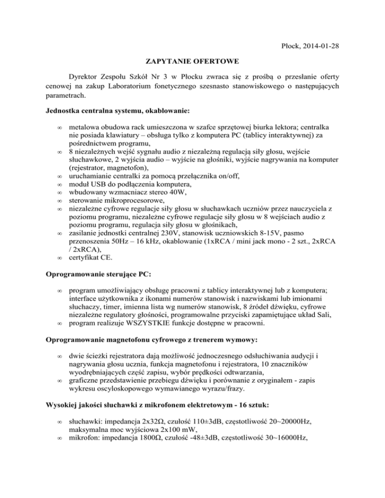 Płock, 2014-01-28 ZAPYTANIE OFERTOWE Dyrektor Zespołu Szkół Nr 3 w Płocku zwraca się z prośbą o przesłanie oferty cenowej na zakup Laboratorium fonetycznego szesnasto stanowiskowego o następujących parametrach. Jednostka centralna systemu, okablowanie: • • • • • • • • • metalowa obudowa rack umieszczona w szafce sprzętowej biurka lektora; centralka nie posiada klawiatury – obsługa tylko z komputera PC (tablicy interaktywnej) za pośrednictwem programu, 8 niezależnych wejść sygnału audio z niezależną regulacją siły głosu, wejście słuchawkowe, 2 wyjścia audio – wyjście na głośniki, wyjście nagrywania na komputer (rejestrator, magnetofon), uruchamianie centralki za pomocą przełącznika on/off, moduł USB do podłączenia komputera, wbudowany wzmacniacz stereo 40W, sterowanie mikroprocesorowe, niezależne cyfrowe regulacje siły głosu w słuchawkach uczniów przez nauczyciela z poziomu programu, niezależne cyfrowe regulacje siły głosu w 8 wejściach audio z poziomu programu, regulacja siły głosu w głośnikach, zasilanie jednostki centralnej 230V, stanowisk uczniowskich 8-15V, pasmo przenoszenia 50Hz – 16 kHz, okablowanie (1xRCA / mini jack mono - 2 szt., 2xRCA / 2xRCA), certyfikat CE. Oprogramowanie sterujące PC: • • program umożliwiający obsługę pracowni z tablicy interaktywnej lub z komputera; interface użytkownika z ikonami numerów stanowisk i nazwiskami lub imionami słuchaczy, timer, imienna lista wg numerów stanowisk, 8 źródeł dźwięku, cyfrowe niezależne regulatory głośności, programowalne przyciski zapamiętujące układ Sali, program realizuje WSZYSTKIE funkcje dostępne w pracowni. Oprogramowanie magnetofonu cyfrowego z trenerem wymowy: • • dwie ścieżki rejestratora dają możliwość jednoczesnego odsłuchiwania audycji i nagrywania głosu ucznia, funkcja magnetofonu i rejestratora, 10 znaczników wyodrębniających część zapisu, wybór prędkości odtwarzania, graficzne przedstawienie przebiegu dźwięku i porównanie z oryginałem - zapis wykresu oscyloskopowego wymawianego wyrazu/frazy. Wysokiej jakości słuchawki z mikrofonem elektretowym - 16 sztuk: • • słuchawki: impedancja 2x32Ω, czułość 110±3dB, częstotliwość 20~20000Hz, maksymalna moc wyjściowa 2x100 mW, mikrofon: impedancja 1800Ω, czułość -48±3dB, częstotliwość 30~16000Hz, • trwałe, odporne na uszkodzenia mechaniczne, miękka, elastyczna obudowa, eliminujący szum otoczenia mikrofon kierunkowy na giętkim pałąku, duże nauszniki szczelnie kryjące ucho, wtyczka 5 pin; certyfikat CE – należy załączyć do oferty. Przyłącza stanowisk uczniowskich – 16 sztuk: • wieszak (uchwyt) do słuchawek zintegrowany z gniazdem słuchawkowym DIN 5 pin – osłania i zabezpiecza przyłącze przed wyrwaniem. Pulpit ucznia(dla słuchawek z mikrofonem dynamicznym): • • • • regulacja siły dźwięku (potencjometr) - pozwala każdemu uczniowi dostosować optymalny dla niego poziom dźwięku, wejście audio (jack) - pozwala na podłączenie rejestratora cyfrowego, dyktafonu, magnetofonu, komputera i odsłuch odtwarzanego audio, wyjście audio (jack) - pozwala na podłączenie rejestratora cyfrowego, dyktafonu, magnetofonu, komputera i nagrywanie dialogu prowadzonego z lektorem, w parze lub dyskusji w grupach roboczych, gniazdo słuchawkowe DIN 5 pin, metalowa obudowa, złącze D-Sub 9 pin, montowany w blacie biurka uczniowskiego. Rejestrator cyfrowy: • wbudowany w blat, wyświetlacz LCD, port USB i SD card, funkcje: rejestracja bezpośrednio na karcie pamięci SD lub USB, kopiowanie pamięci masowych i usunięcie aktualnie słuchanego utworu, obsługa pilotem . Głośnik montowany w blendzie biurka lektorskiego: • 2-drożne głośniki współosiowe, moc max: 80W, impedancja: 4 Ω, pasmo przenoszenia: 100Hz - 20000Hz, czułość: 88 dB 1W/1M, Biurko nauczyciela – 1 sztuka: • Elementy wykonane z płyty wiórowej laminowanej gr. 18mm, blat grubości min. 25 mm, wykończenie blatu grubą okleiną PCV (2 mm), blenda min. 50 cm wysokości, kanał kablowy między blatem a blendą, wymiary 187x50 cm x 75 cm, narożniki blatu zaoblone. Na całej długości biurka nadstawka prywatyzująca. Biurko posiada z lewej strony otwarte półki z wariantem wstawienia jednostki centralnej komputera, z prawej strony zamykaną szafkę na sprzęt elektroniczny oraz półkę pod klawiaturę. Stół uczniowski 2osobowy prosty – 8 sztuk • Elementy wykonane z płyty wiórowej laminowanej gr. 18mm, blat grubości min. 25 mm, wykończenie blatu grubą okleiną PCV (2 mm), blenda min. 50 cm wysokości, kanał kablowy między blatem a blendą min 12 cm x 12cm, przepusty kablowe, wymiary 120 cm x 50 cm, wysokość 760 mm – nr 6 (według normy PN-EN 17291:2007). Krzesło ucznia – 16 sztuk • krzesło typu ISO, oparcie i siedzisko tapicerowane w kolorze do uzgodnienia, wysokość siedziska 460 mm - nr 6 (według normy PN-EN 1729-1:2007). Fotel nauczyciela – 1 sztuka • obrotowy, na kółkach, tapicerowany w kolorze do ustalenia, z podłokietnikami, regulacja gazowa. Informacje dodatkowe • • • • • • gwarancja na pracownię minimum 60 miesięcy w tym na słuchawki. dołączone do oferty certyfikaty CE na pracownię i słuchawki, meble są zgodne z normami: PN-EN 1729-1:2007, PN-EN 1729-2:2007, PN-F06009:2001, PN-F-06010-01:1990, nieodpłatne aktualizacje oprogramowania co najmniej przez okres gwarancji na pracownię, dostarczenie z pracownią instrukcji w języku polskim, dostarczenie urządzeń, instalacja w miejscu wskazanym przez zamawiającego, rozruch technologiczny i przeszkolenie użytkowników z obsługi pracowni. Funkcje realizowane w pracowni: • • • • • • • • • • • • • • • • • • • • • przełączanie trybów pracy (praca w parach, grupach, indywidualna), praca w grupach, podział słuchaczy na dwie dowolne grupy, które jednocześnie realizują własne programy (n