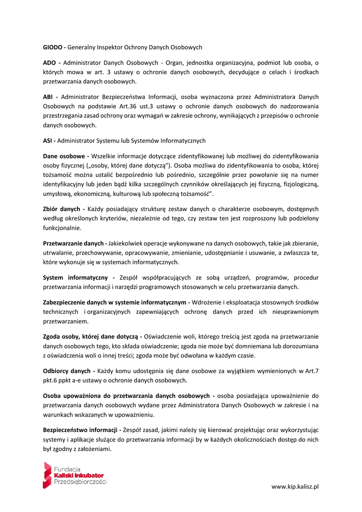 GIODO - Generalny Inspektor Ochrony Danych Osobowych ADO - Administrator Danych Osobowych - Organ, jednostka organizacyjna, podmiot lub osoba, o których mowa w art. 3 ustawy o ochronie danych osobowych, decydujące o celach i środkach przetwarzania danych osobowych. ABI - Administrator Bezpieczeństwa Informacji, osoba wyznaczona przez Administratora Danych Osobowych na podstawie Art.36 ust.3 ustawy o ochronie danych osobowych do nadzorowania przestrzegania zasad ochrony oraz wymagań w zakresie ochrony, wynikających z przepisów o ochronie danych osobowych. ASI - Administrator Systemu lub Systemów Informatycznych Dane osobowe - Wszelkie informacje dotyczące zidentyfikowanej lub możliwej do zidentyfikowania osoby fizycznej („osoby, której dane dotyczą”). Osoba możliwa do zidentyfikowania to osoba, której tożsamość można ustalić bezpośrednio lub pośrednio, szczególnie przez powołanie się na numer identyfikacyjny lub jeden bądź kilka szczególnych czynników określających jej fizyczną, fizjologiczną, umysłową, ekonomiczną, kulturową lub społeczną tożsamość”. Zbiór danych - Każdy posiadający strukturę zestaw danych o charakterze osobowym, dostępnych według określonych kryteriów, niezależnie od tego, czy zestaw ten jest rozproszony lub podzielony funkcjonalnie. Przetwarzanie danych - Jakiekolwiek operacje wykonywane na danych osobowych, takie jak zbieranie, utrwalanie, przechowywanie, opracowywanie, zmienianie, udostępnianie i usuwanie, a zwłaszcza te, które wykonuje się w systemach informatycznych. System informatyczny - Zespół współpracujących ze sobą urządzeń, programów, procedur przetwarzania informacji i narzędzi programowych stosowanych w celu przetwarzania danych. Zabezpieczenie danych w systemie informatycznym - Wdrożenie i eksploatacja stosownych środków technicznych i organizacyjnych zapewniających ochronę danych przed ich nieuprawnionym przetwarzaniem. Zgoda osoby, której dane dotyczą - Oświadczenie woli, którego treścią jest zgoda na przetwarzanie danych osobowych tego, kto składa oświadczenie; zgoda nie może być domniemana lub dorozumiana z oświadczenia woli o innej treści; zgoda może być odwołana w każdym czasie. Odbiorcy danych - Każdy komu udostępnia się dane osobowe za wyjątkiem wymienionych w Art.7 pkt.6 ppkt a-e ustawy o ochronie danych osobowych. Osoba upoważniona do przetwarzania danych osobowych - osoba posiadająca upoważnienie do przetwarzania danych osobowych wydane przez Administratora Danych Osobowych w zakresie i na warunkach wskazanych w upoważnieniu. Bezpieczeństwo informacji - Zespół zasad, jakimi należy się kierować projektując oraz wykorzystując systemy i aplikacje służące do przetwarzania informacji by w każdych okolicznościach dostęp do nich był zgodny z założeniami. www.kip.kalisz.pl