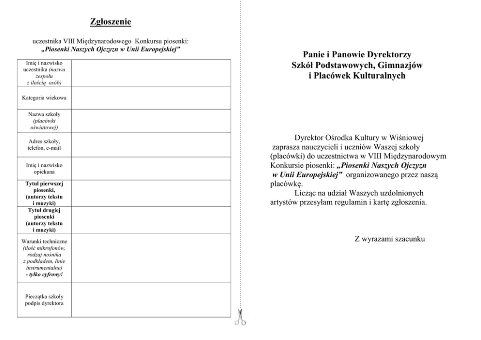 Zgłoszenie uczestnika VIII Międzynarodowego Konkursu piosenki: „Piosenki Naszych Ojczyzn w Unii Europejskiej” Imię i nazwisko uczestnika (nazwa zespołu z ilością osób) Panie i Panowie Dyrektorzy Szkół Podstawowych, Gimnazjów i Placówek Kulturalnych Kategoria wiekowa Nazwa szkoły (placówki oświatowej) Adres szkoły, telefon, e-mail Imię i nazwisko opiekuna Tytuł pierwszej piosenki, (autorzy tekstu i muzyki) Tytuł drugiej piosenki (autorzy tekstu i muzyki) Warunki techniczne (ilość mikrofonów, rodzaj nośnika z podkładem, linie instrumentalne) - tylko cyfrowy! Pieczątka szkoły podpis dyrektora Dyrektor Ośrodka Kultury w Wiśniowej zaprasza nauczycieli i uczniów Waszej szkoły (placówki) do uczestnictwa w VIII Międzynarodowym Konkursie piosenki: „Piosenki Naszych Ojczyzn w Unii Europejskiej” organizowanego przez naszą placówkę. Licząc na udział Waszych uzdolnionych artystów przesyłam regulamin i kartę zgłoszenia. Z wyrazami szacunku ORGANIZATOR: REGULAMIN KONKURSU „Piosenki Naszych Ojczyzn w Unii Europejskiej” Ośrodek Kultury w Wiśniowej, Obce Vysny Żipov, Ćierne nad Toplo’ou – Słowacja PATRONAT: ………………………. – poseł do Parlamentu Europejskiego CELE KONKURSU: ♪ ♪ ♪ ♪ ♪ Ocalenie od zapomnienia i promocja polskich i słowackich piosenek ludowych Poznanie piosenek ludowych i popularnych krajów Unii Europejskiej Prezentacja i promocja działalności artystycznej dzieci i młodzieży Promocja pracy i twórczości nauczycieli Integracja młodzieży Polskiej i Słowackiej 1. W konkursie mogą brać udział uczniowie szkół podstawowych klas IV-VI oraz gimnazjów, w kategoriach: soliści wokaliści, zespoły wokalne (do 6 osób) i zespoły instrumentalno-wokalne (do 10 osób). 2. Warunkiem uczestnictwa jest wypełnienie zgłoszenia (wszystkie rubryki) i przesłanie do organizatora do dnia 30 kwietnia 2015 r. na adres: Obce Vysny Żipov – dla uczestników ze Słowacji oraz do dnia 30 kwietnia 2015 r. dla uczestników z Polski na adres: Ośrodek Kultury w Wiśniowej 38-124 Wiśniowa 136 z dopiskiem „Konkurs” UCZESTNICY: I kategoria: 9-12 lat – uczniowie szkół podstawowych z klas IV-VI, II kategoria: 13-15 lat – uczniowie gimnazjów 3. Prezentacje oraz ich ocena odbędą się w dwóch kategoriach wiekowych. 4. Każdy podmiot wykonawczy prezentuje dwa utwory: ♪ polską piosenkę ludową TERMIN: 13-14.V.2015 r. przesłuchania konkursowe uczestników z Polski – sala Ośrodka Kultury w Wiśniowej (jedno- lub dwudniowe w zależności od ilości zgłoszeń) 31.V.2015 r. Finał Laureatów z przesłuchań wstępnych, przyznanie nagród i wyróżnień – miejsce zostanie podane w późniejszym terminie. ♪ piosenkę ludową, dziecięcą lub popularną krajów Unii Europejskiej w języku oryginalnym lub polskim 5. Wykonawcy zagraniczni prezentują 2 piosenki: ♪ polską lub słowacką piosenkę ludową ♪ piosenkę w języku ojczystym lub popularną krajów Unii Europejskiej w języku oryginalnym lub ojczystym. 6. 7. 8. 9. 10. 11. 12. 13. Akompaniament do wybranych utworów dowolny. Koszty przejazdu pokrywają uczestnicy we własnym zakresie. Organizator powołuje Komisję Konkursową, która oceniać będzie walory głosowe, muzykalność, sposób aranżacji, własną interpretację, dobór repertuaru oraz osobowość sceniczną uczestników konkursu. Werdykt Komisji jest ostateczny i niepodważalny, organizatorzy nie mają wpływu na decyzje Komisji. Informacja o dokładnym terminie oraz godzinie prezentacji każdego wykonawcy będzie dostępna od 09.V.2015 r., pod numerem telefonu (17) 277-53-93 oraz na stronie internetowej placówki: www.okwisniowa.pl. Nie przewiduje się zmiany ustalonego terminu prezentacji na prośbę opiekunów ze względu na podział na kategorie wiekowe. Dla wszystkich uczestników przewidziano dyplomy, a dla zwycięzców nagrody. Ze względów technicznych prosimy o wcześniejsze dostarczenie opisanych podkładów muzycznych (pocztą elektroniczną format MP3, WAV, lub osobiście) do dnia 30.IV.2015 r. Prosimy zwrócić uwagę, aby jakość podkładów była jak najlepsza. Laureaci z przesłuchań wstępnych zaprezentują się 31.V.2015 r. podczas Finałowego Konkursu, gdzie nastąpi wręczenie nagród i wyróżnień. Organizator zastrzega sobie prawo do wprowadzenia zmian w niniejszym regulaminie. Dodatkowych informacji udziela Grzegorz Tomaszewski, tel. (17) 277-53-93 lub: [email protected] VIII Międzynarodowy Konkurs Piosenki