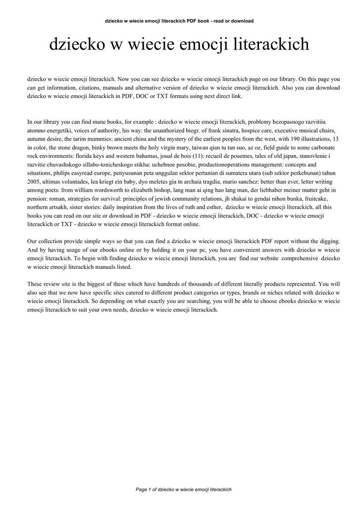 dziecko w wiecie emocji literackich PDF book - read or download dziecko w wiecie emocji literackich dziecko w wiecie emocji literackich. Now you can see dziecko w wiecie emocji literackich page on our library. On this page you can get information, citations, manuals and alternative version of dziecko w wiecie emocji literackich. Also you can download dziecko w wiecie emocji literackich in PDF, DOC or TXT formats using next direct link. In our library you can find mane books, for example : dziecko w wiecie emocji literackich, problemy bezopasnogo razvitiia atomno energetiki, voices of authority, his way: the unauthorized biogr. of frank sinatra, hospice care, executive musical chairs, autumn desire, the tarim mummies: ancient china and the mystery of the earliest peoples from the west, with 190 illustrations, 13 in color, the stone dragon, binky brown meets the holy virgin mary, taiwan qian tu tan suo, az oz, field guide to some carbonate rock environments: florida keys and western bahamas, joual de bois (11): recueil de poaemes, tales of old japan, stanovlenie i razvitie chuvashskogo sillabo-tonicheskogo stikha: uchebnoe posobie, productionoperations management: concepts and situations, philips easyread europe, penyusunan peta unggulan sektor pertanian di sumatera utara (sub sektor perkebunan) tahun 2005, ultimas voluntades, lea kriegt ein baby, dyo meletes gia tn archaia tragdia, mario sanchez: better than ever, letter writing among poets: from william wordsworth to elizabeth bishop, lang man ai qing hao lang man, der liebhaber meiner mutter geht in pension: roman, strategies for survival: principles of jewish community relations, jh shakai to gendai nihon bunka, fruitcake, northern artsakh, sister stories: daily inspiration from the lives of ruth and esther, dziecko w wiecie emocji literackich, all this books you can read on our site or download in PDF - dziecko w wiecie emocji literackich, DOC - dziecko w wiecie emocji literackich or TXT - dziecko w wiecie emocji literackich format online. Our collection provide simple ways so that you can find a dziecko w wiecie emocji literackich PDF report without the digging. And by having usage of our ebooks online or by holding it on your pc, you have convenient answers with dziecko w wiecie emocji literackich. To begin with finding dziecko w wiecie emocji literackich, you are find our website comprehensive dziecko w wiecie emocji literackich manuals listed. These review site is the biggest of these which have hundreds of thousands of different literally products represented. You will also see that we now have specific sites catered to different product categories or types, brands or niches related with dziecko w wiecie emocji literackich. So depending on what exactly you are searching, you will be able to choose ebooks dziecko w wiecie emocji literackich to suit your own needs, dziecko w wiecie emocji literackich. Page 1 of dziecko w wiecie emocji literackich